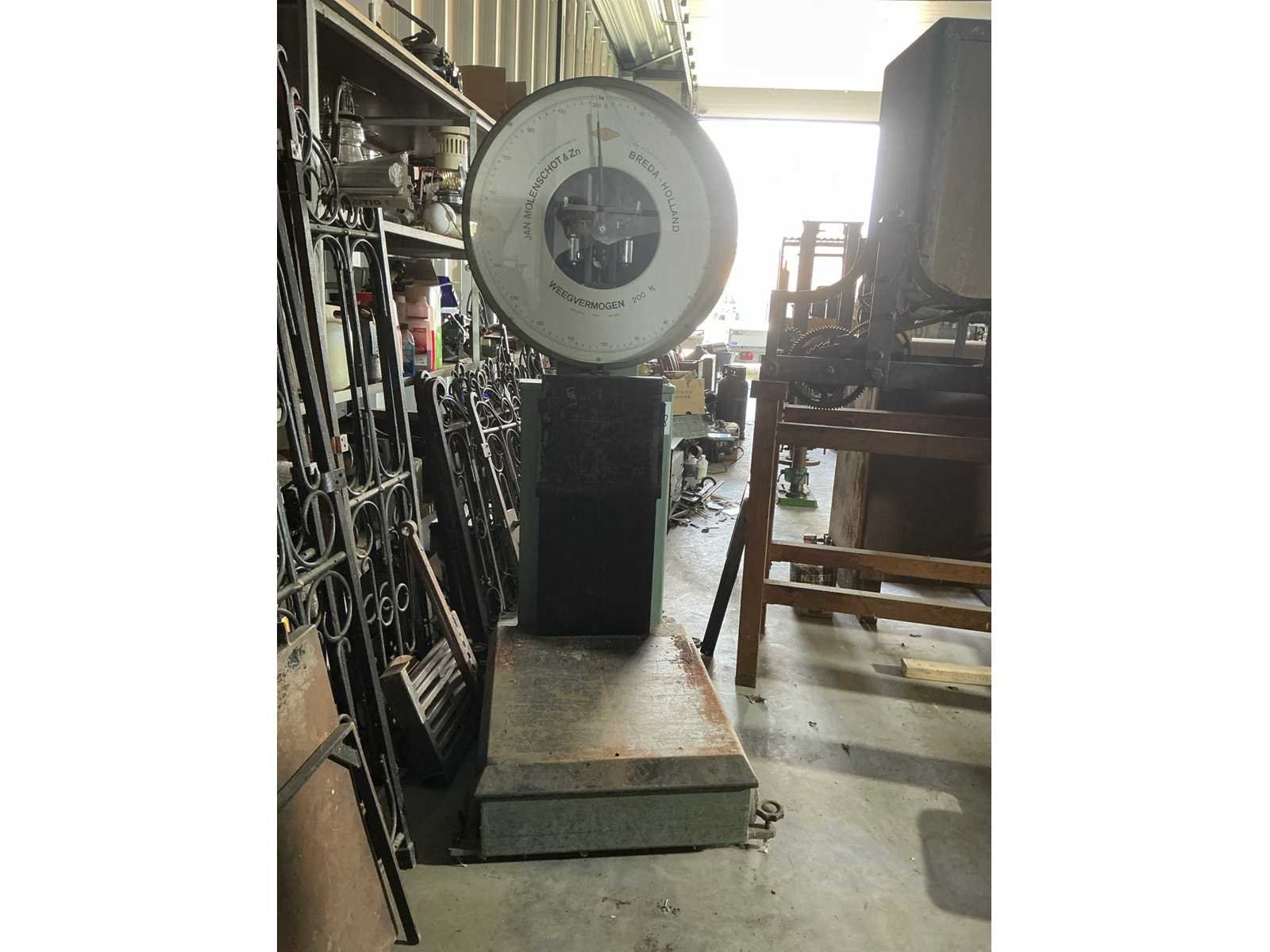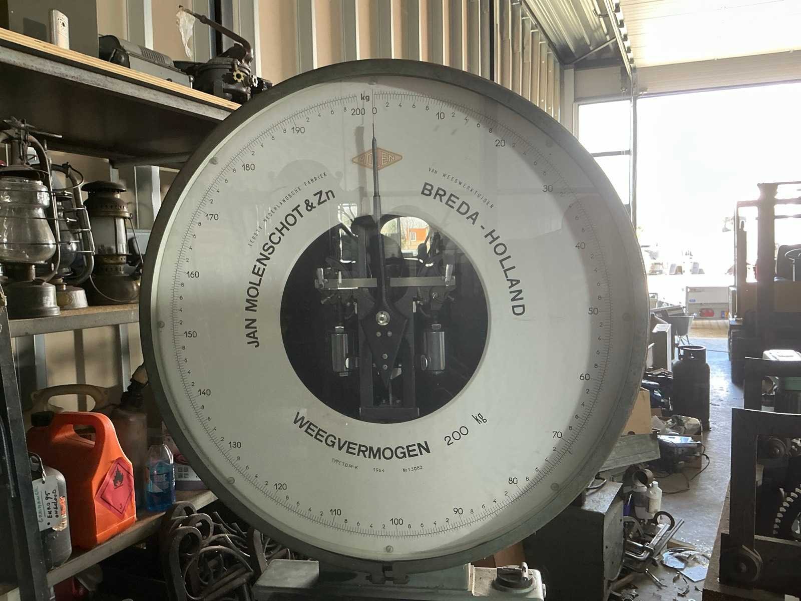 Merk: Molen Type: T.B.M-K Bouwjaar: 1964 Serienummer: 13082 Weegbereik max: 200kg Plateau afm. l: 810mm Plateau afm. b: 650mm Totale afmeting L: 1150mm Totale afmeting Breedte: 700mm Totale afmeting Hoogte: 1900mm