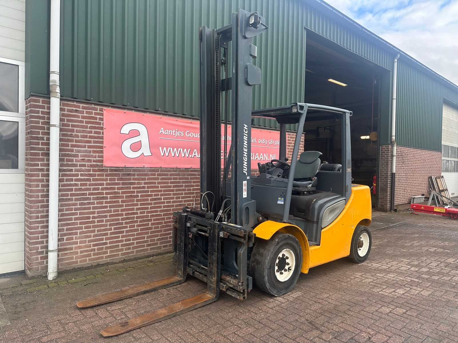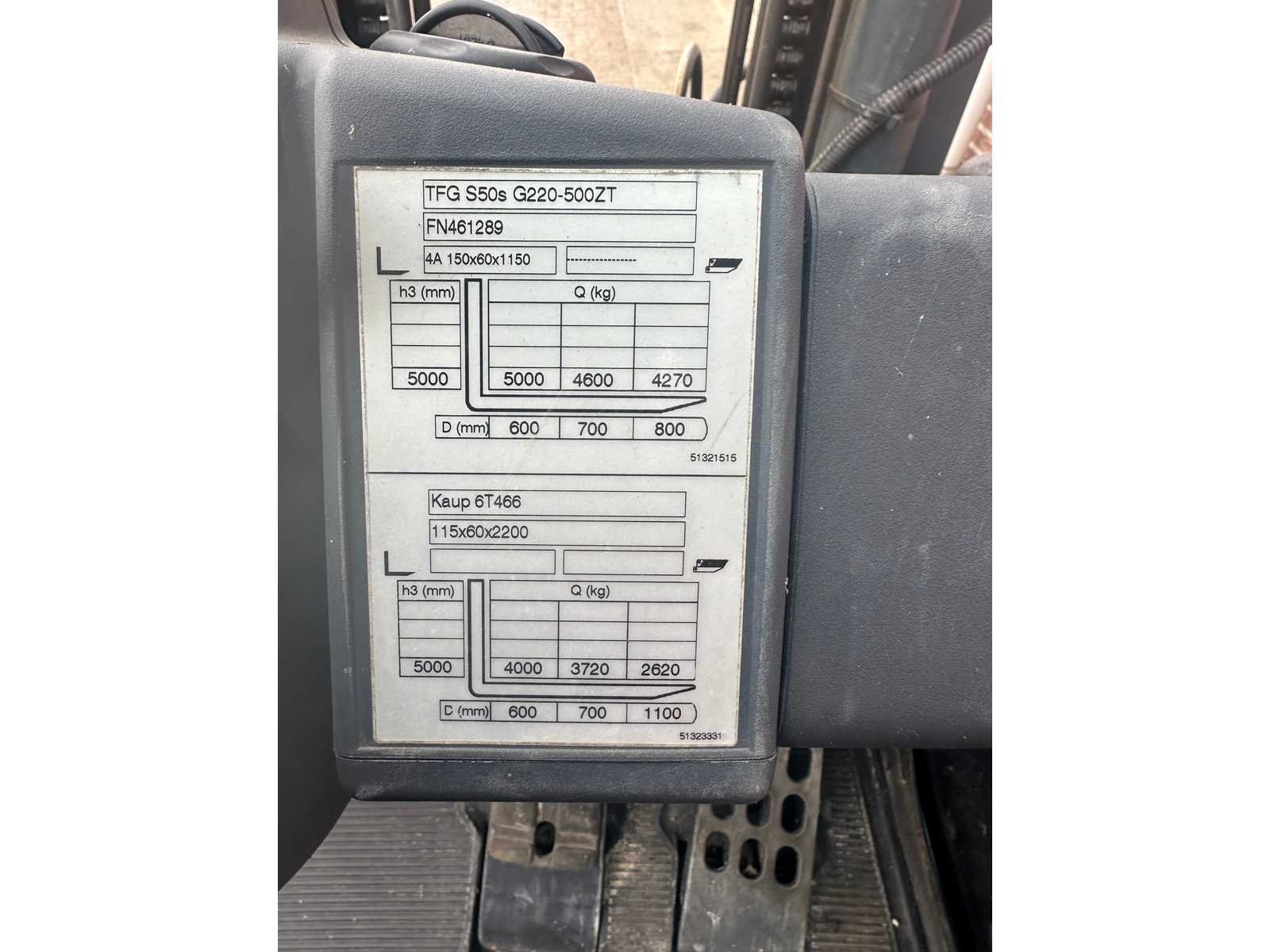 Jungheinrich TFG S50 heftruck ; afgelezen urenstand ca. 5300 uur ; nominale hefcapaciteit 5000 kg ; maximale hefhoogte ca. 2846 mm ; totale breedte ca. 1445 mm ; voorzien van side shift ; 4 wielen Merk: Jungheinrich Type: TFG S50 Serienummer: FN461289 Brandstof: LPG Aantal wielen: 4 Afgelezen urenstand: 5300 Side-shift: true Hefvermogen: 5000kg Max. hefhoogte: 2846mm Vol rubber banden: true Minimale doorrijhoogte: 2400mm Totale afmeting Breedte: 1445mm LPG: true