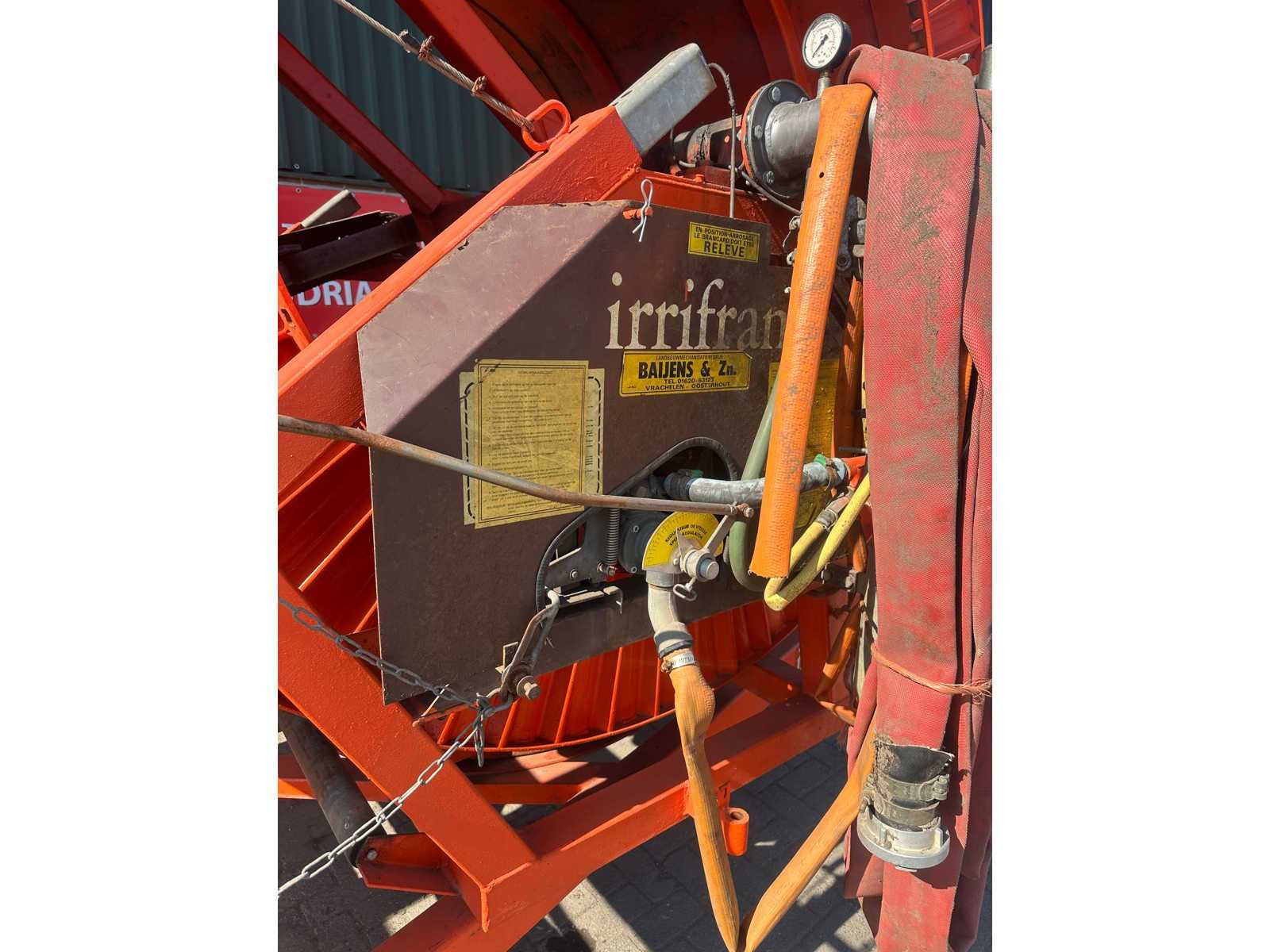 Irrifrance beregeningshaspel ; type 265/82 ; hydraulisch aangedreven ; turbine aandrijving ; slanglengte ca. 265 m ; slangdiameter ca. 82 mm ; minimale benodigde capaciteit ca. 40 m³/uur ; voorzien van draaikrans ; voorzien van sproeikar met kanon. Merk: Irrifrance Lengte: 26500cm Type: 82 Diameter circa: 82mm