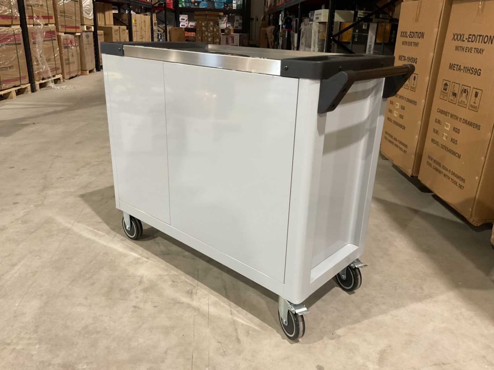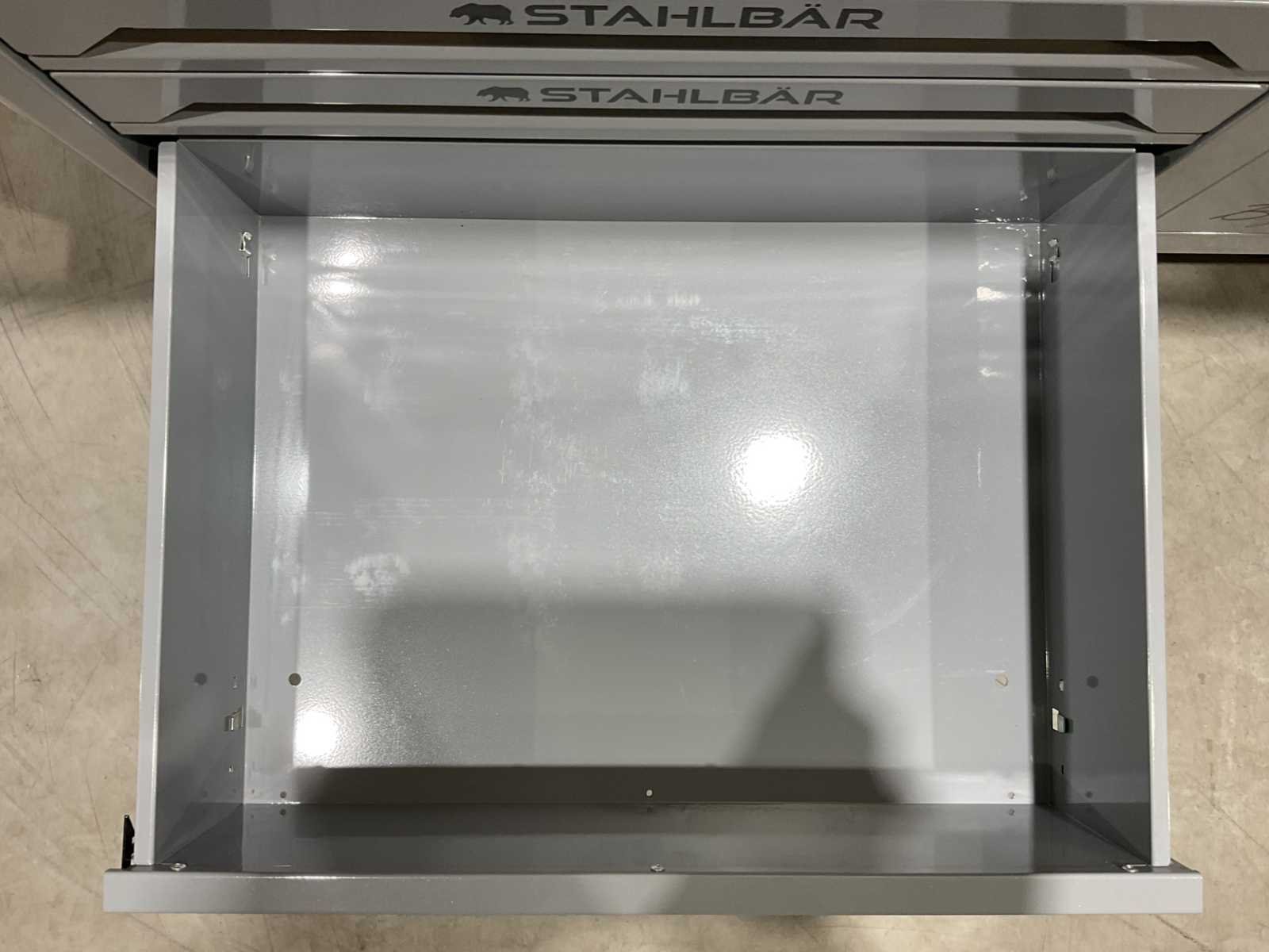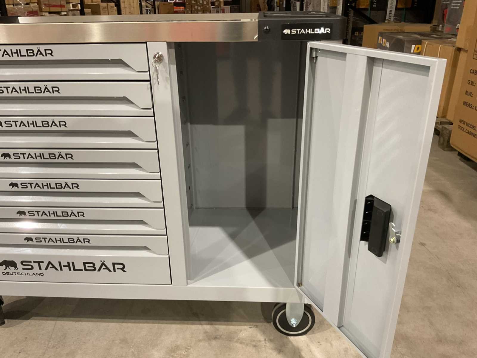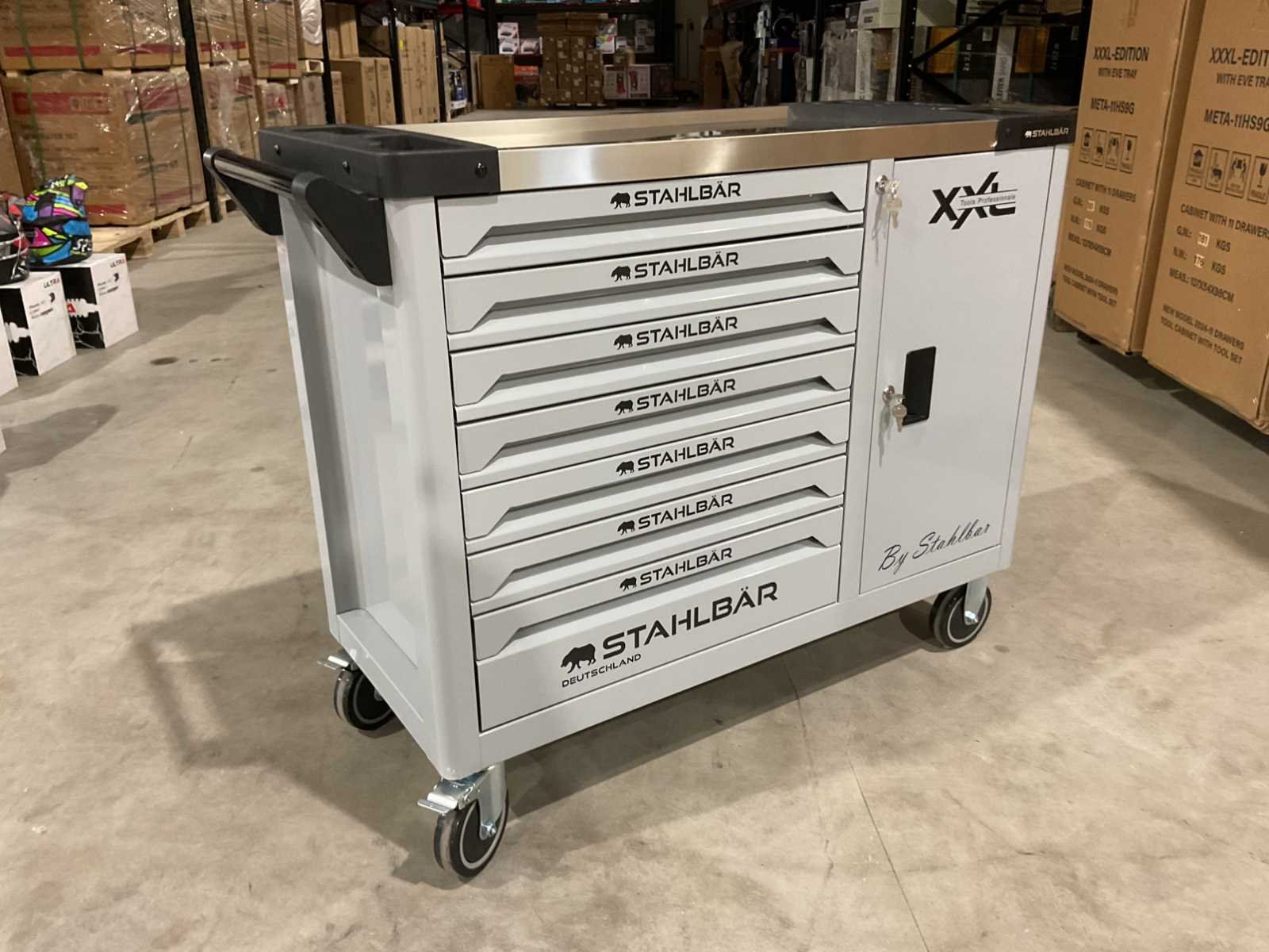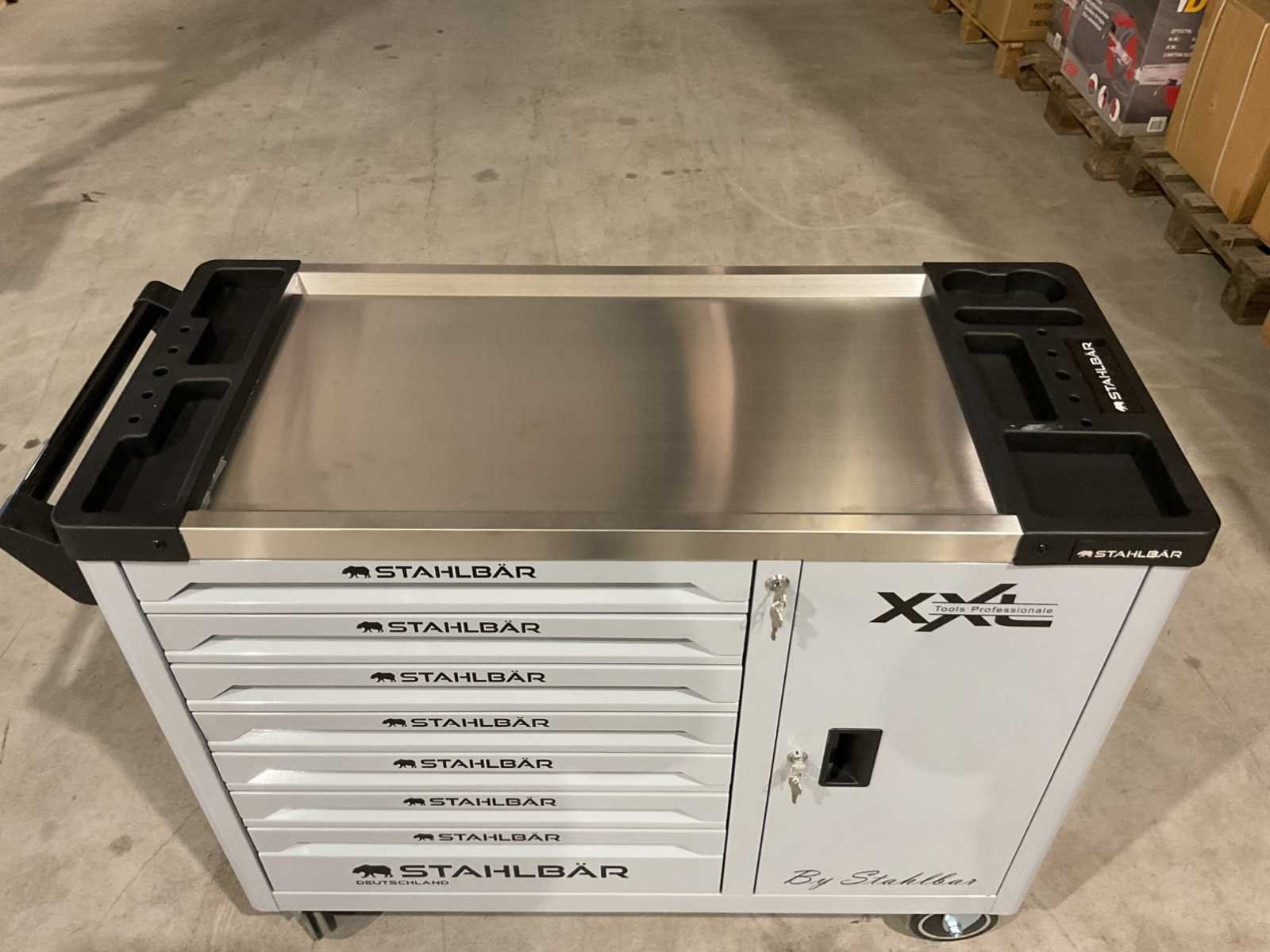 Voorzien van 7 lades waarvan 7 gevuld met gereedschap; zijdeur; professioneel chroom-vanadium gereedschap; heavy duty gereedschapswagen; 4 wielen; stevig handvat; ongebruikt in doos (transport afmetingen 110x50x80 cm) Merk: Stahlbär Type: Deutschland jumbo Bouwjaar: 2025 Aantal laden: 7 Met inhoud: true Eigen gewicht: 75kg Totale afmeting L: 1100mm Totale afmeting Breedte: 500mm Totale afmeting Hoogte: 800mm