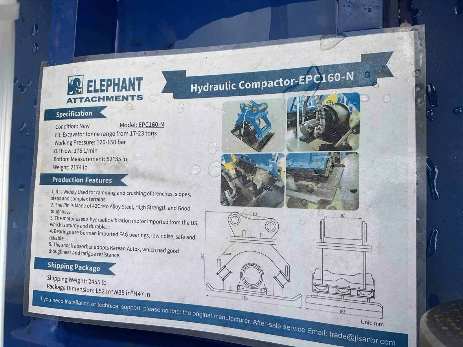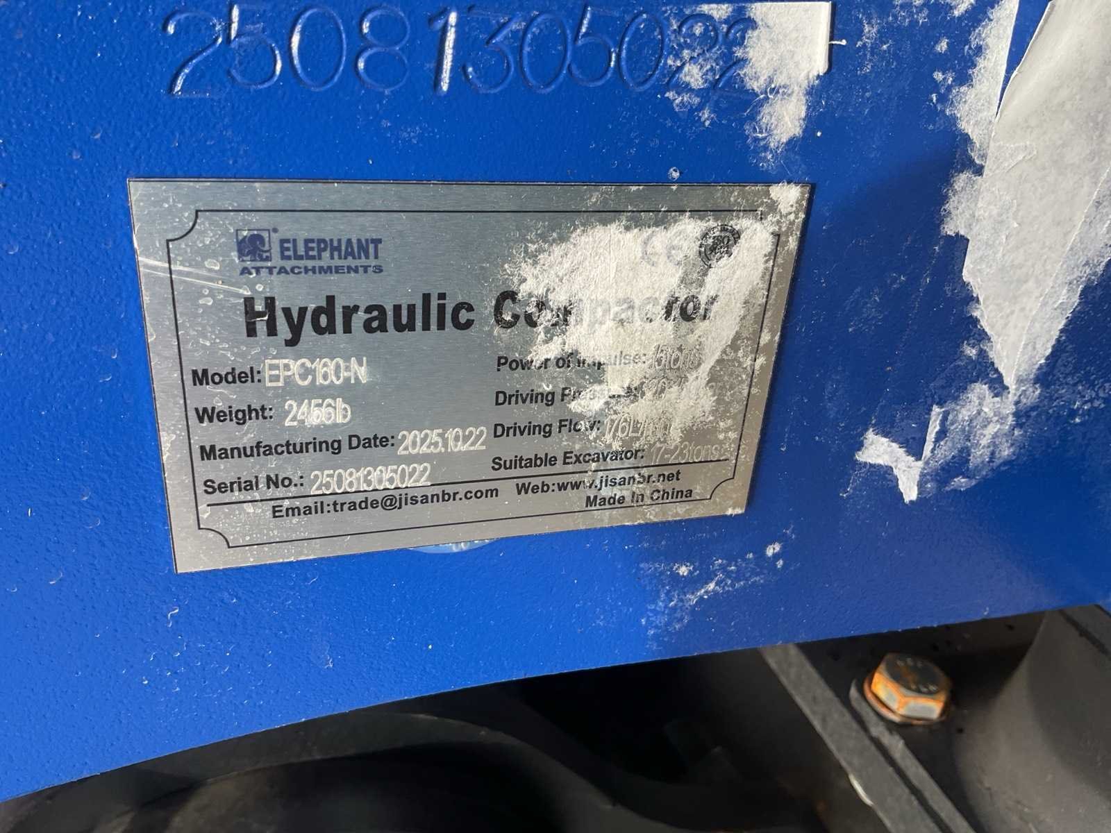 Voorzien Impactkracht: ≈ 10 ton; Hydraulische druk: ≈ 200 bar; Hydraulische oliestroom: ≈ 160 L/min; Geschikt voor: 17 – 23 ton graafmachines; Materiaal: Q345 mangaanstaal (slijtvast en corrosiebestendig); Pennen: 42CrMo gelegeerd staal Lagers: zware industriële lagers; Schokdempers: zware rubber-dempers voor vibratie-isolatie; Eigen gewicht: 986 kg; Onderplaat (verdichtingsplaat): 1320 × 890 mm Merk: Elephant Type: EPC160-N