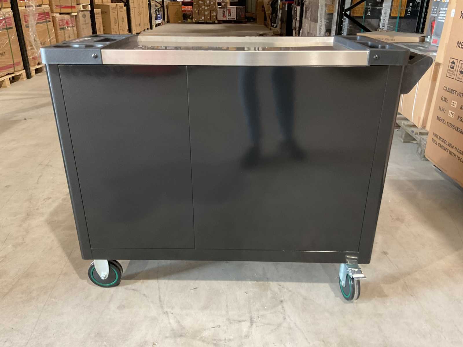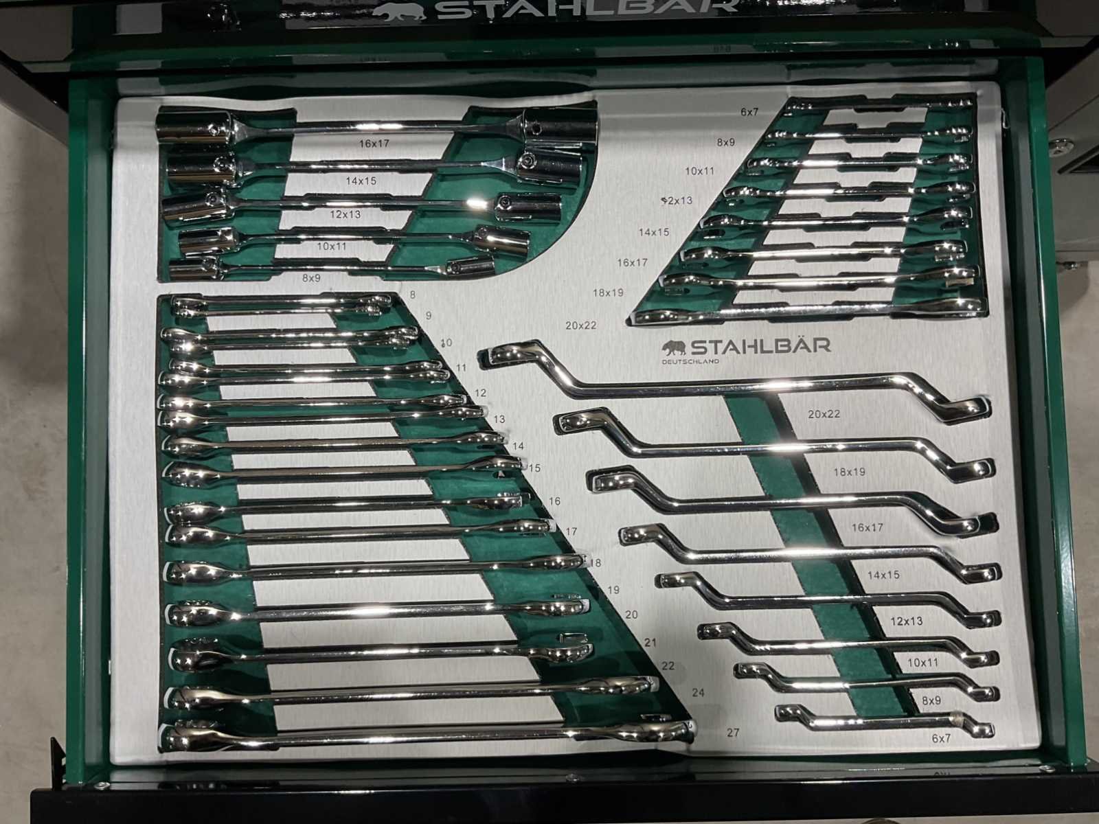 Voorzien van 7 lades waarvan 7 gevuld met gereedschap; zijdeur; professioneel chroom-vanadium gereedschap; heavy duty gereedschapswagen; 4 wielen; stevig handvat; ongebruikt in doos (transport afmetingen 110x50x80 cm) Merk: Stahlbär Type: Deutschland jumbo Bouwjaar: 2025 Aantal laden: 7 Met inhoud: true Eigen gewicht: 75kg Totale afmeting L: 1100mm Totale afmeting Breedte: 500mm Totale afmeting Hoogte: 800mm