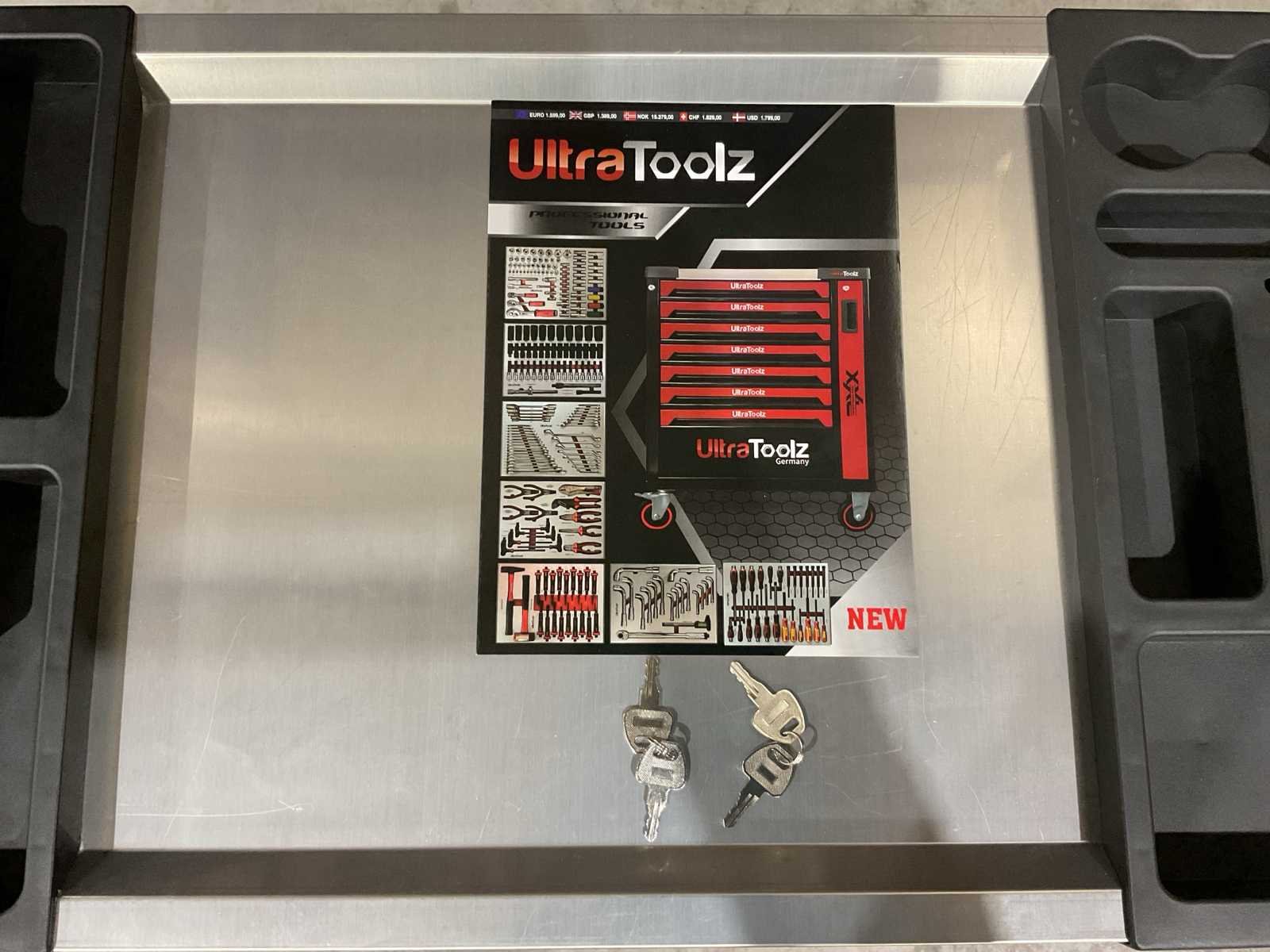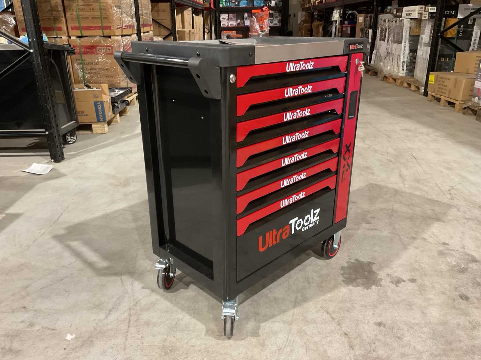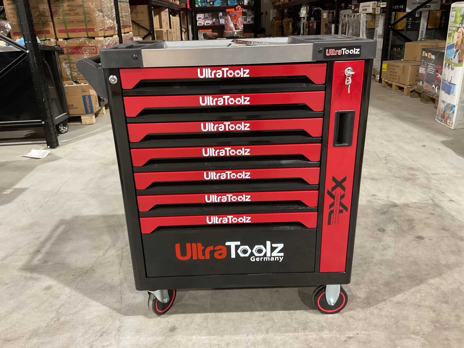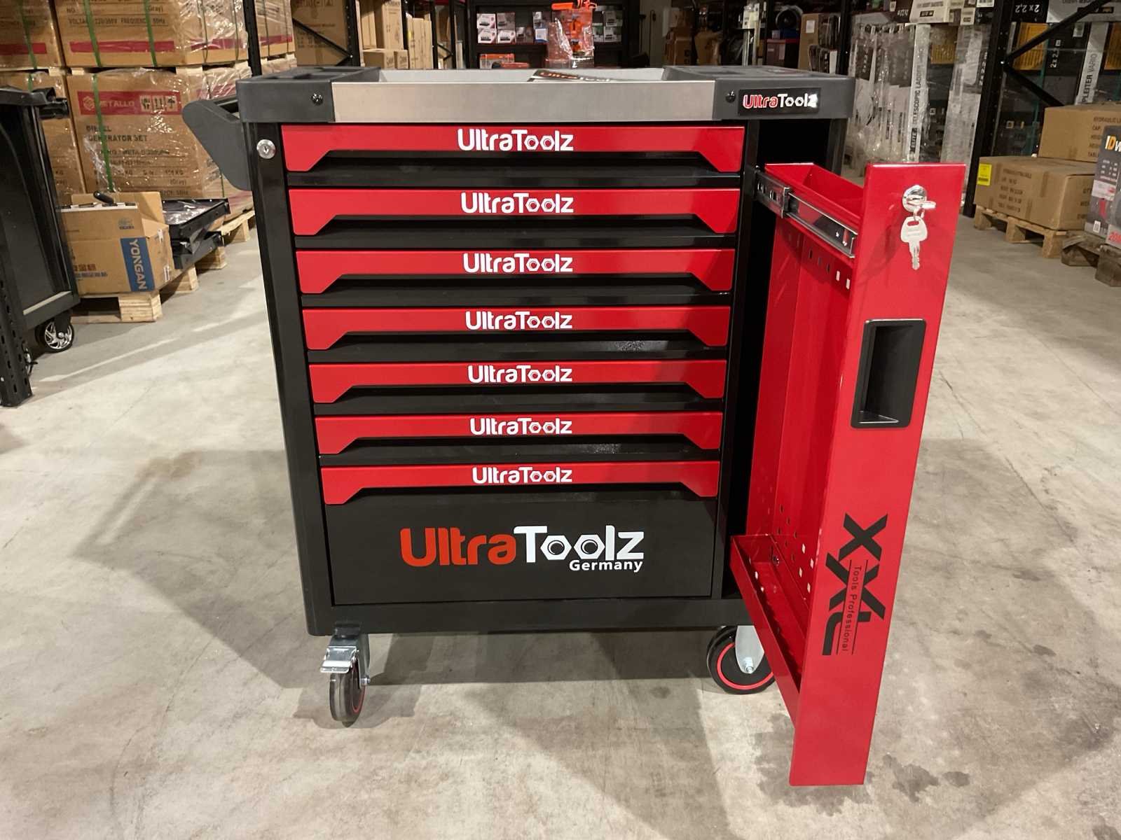 Voorzien van 7 lades waarvan 7 gevuld met gereedschap; zij lade; professioneel chroom-vanadium gereedschap; heavy duty gereedschapswagen; stevig werkblad; 4 wielen; stevig handvat; ongebruikt in doos (transport afmetingen 80x50x85 cm) Merk: UltraToolz Type: Germany 7/7 pro Bouwjaar: 2025 Aantal laden: 7 Met inhoud: true Eigen gewicht: 80kg Totale afmeting L: 800mm Totale afmeting Breedte: 500mm Totale afmeting Hoogte: 850mm