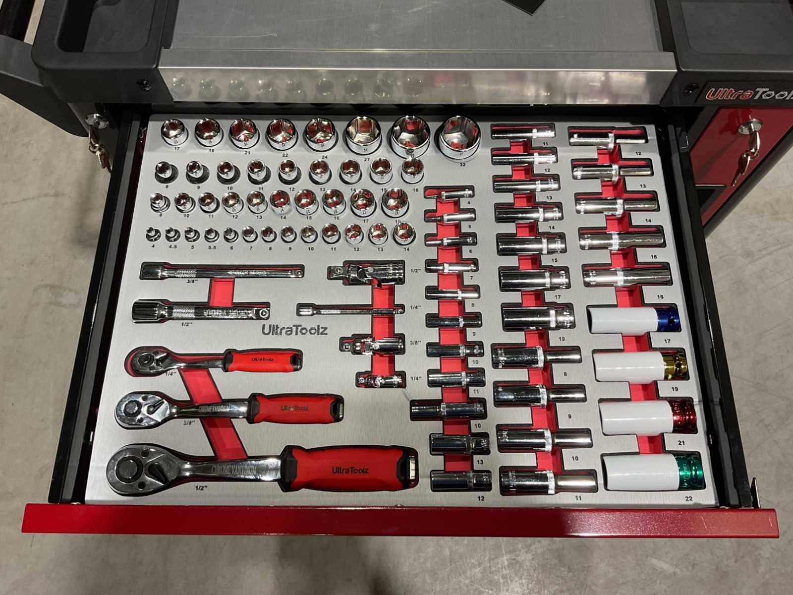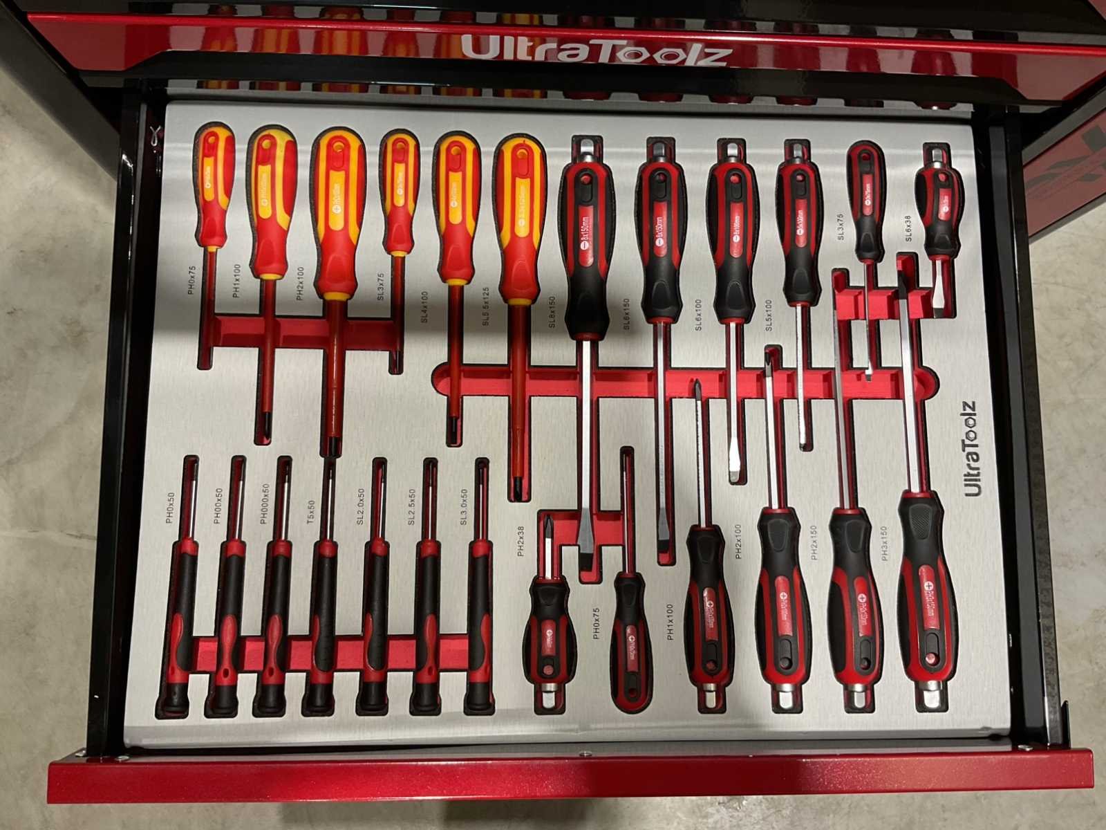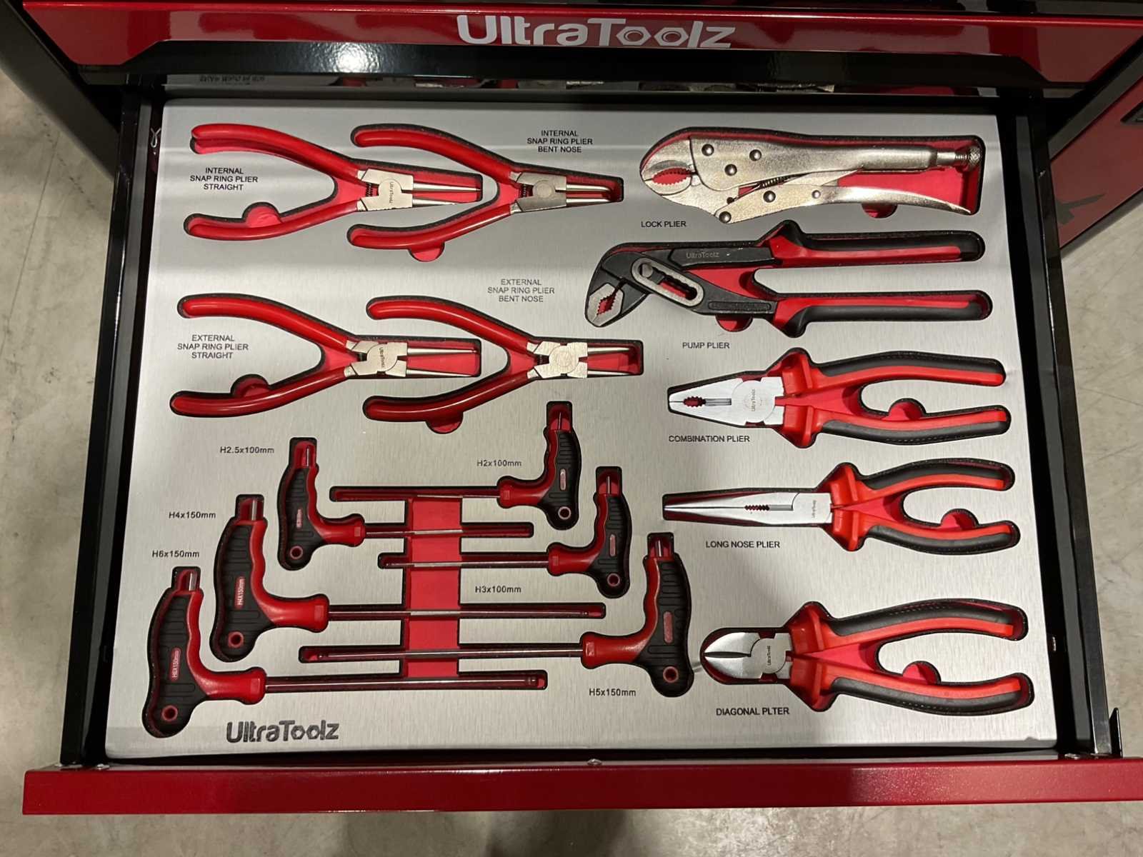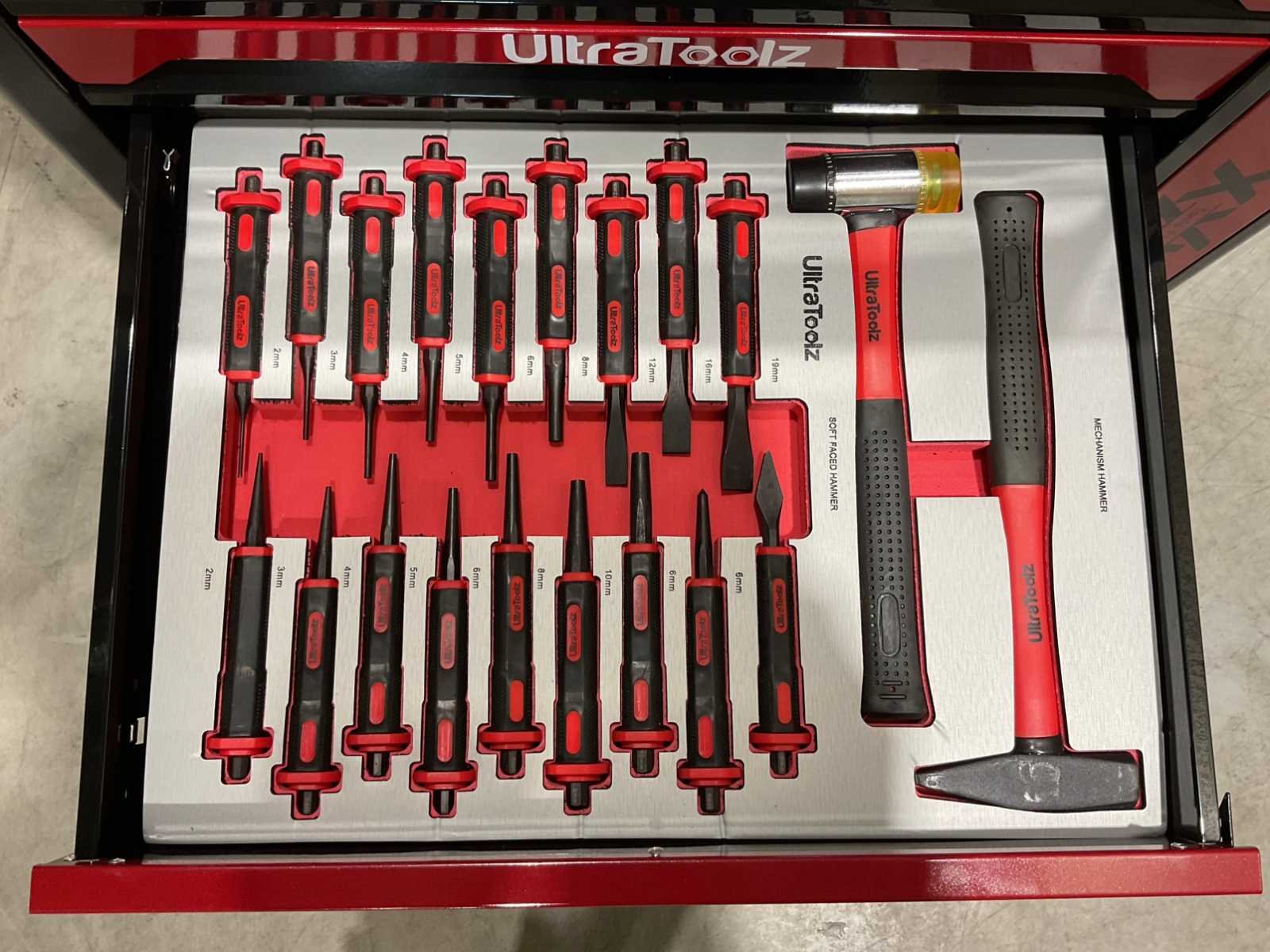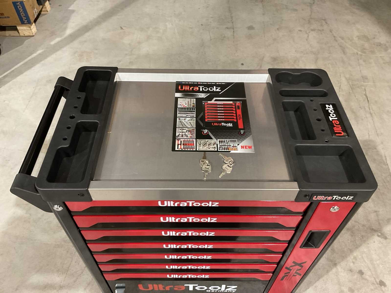 Voorzien van 7 lades waarvan 7 gevuld met gereedschap; zij lade; professioneel chroom-vanadium gereedschap; heavy duty gereedschapswagen; stevig werkblad; 4 wielen; stevig handvat; ongebruikt in doos (transport afmetingen 80x50x85 cm) Merk: UltraToolz Type: Germany 7/7 pro Bouwjaar: 2025 Aantal laden: 7 Met inhoud: true Eigen gewicht: 80kg Totale afmeting L: 800mm Totale afmeting Breedte: 500mm Totale afmeting Hoogte: 850mm