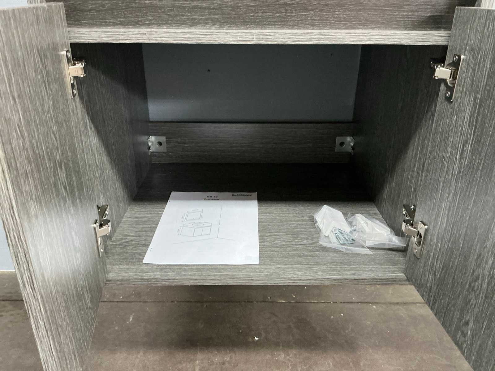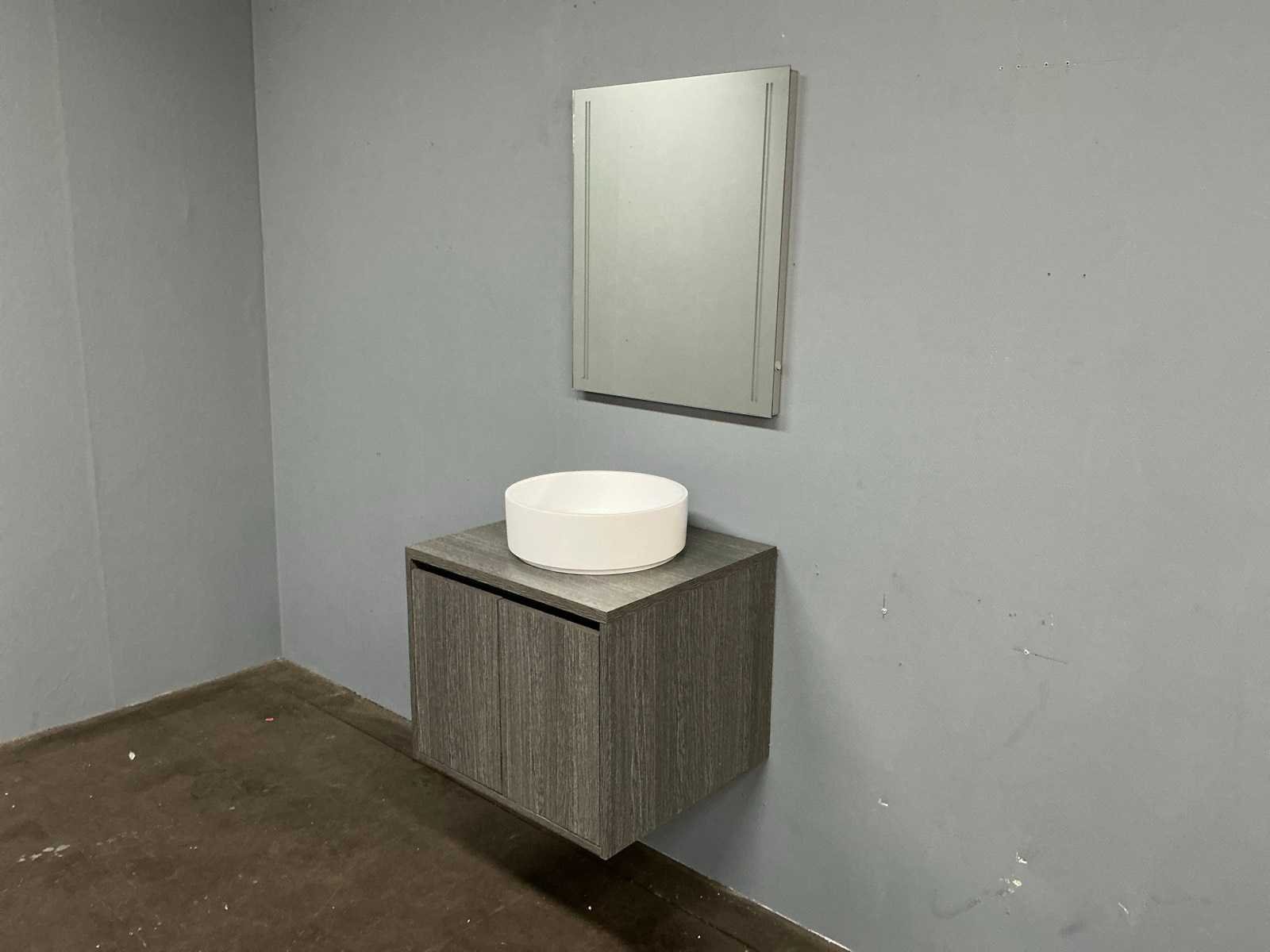 Badmeubelset met: onderkast 55x60x50 cm, waskom 40 cm, spiegel 60x70 cm Kleur: Grijs,Glans Wit Waskom: Arqua Prince Spiegel met verlichting: Primabad