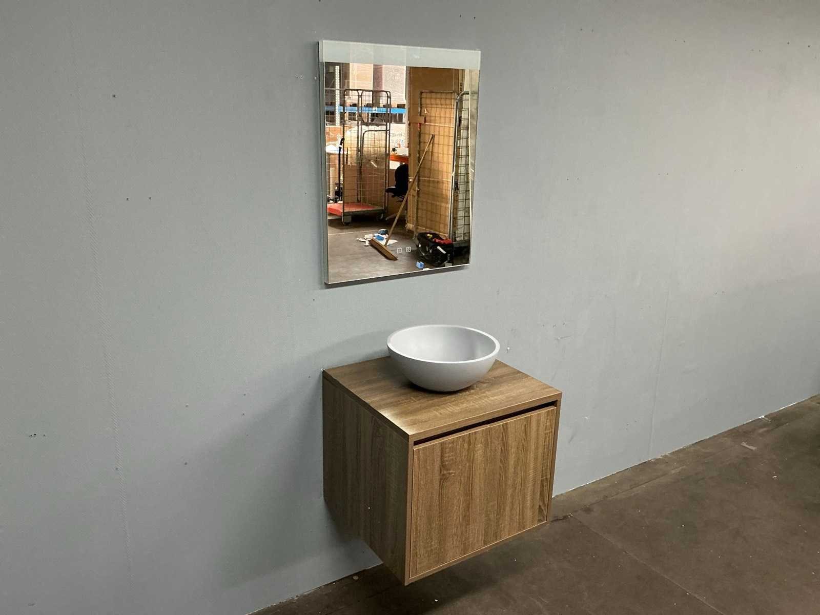 Badmeubelset met: onderkast 55x60x50 cm, waskom 38 cm, spiegel 60x75 cm Kleur: Hout,Mat Grijs Waskom: Arqua Case Spiegel met verlichting: Primabad