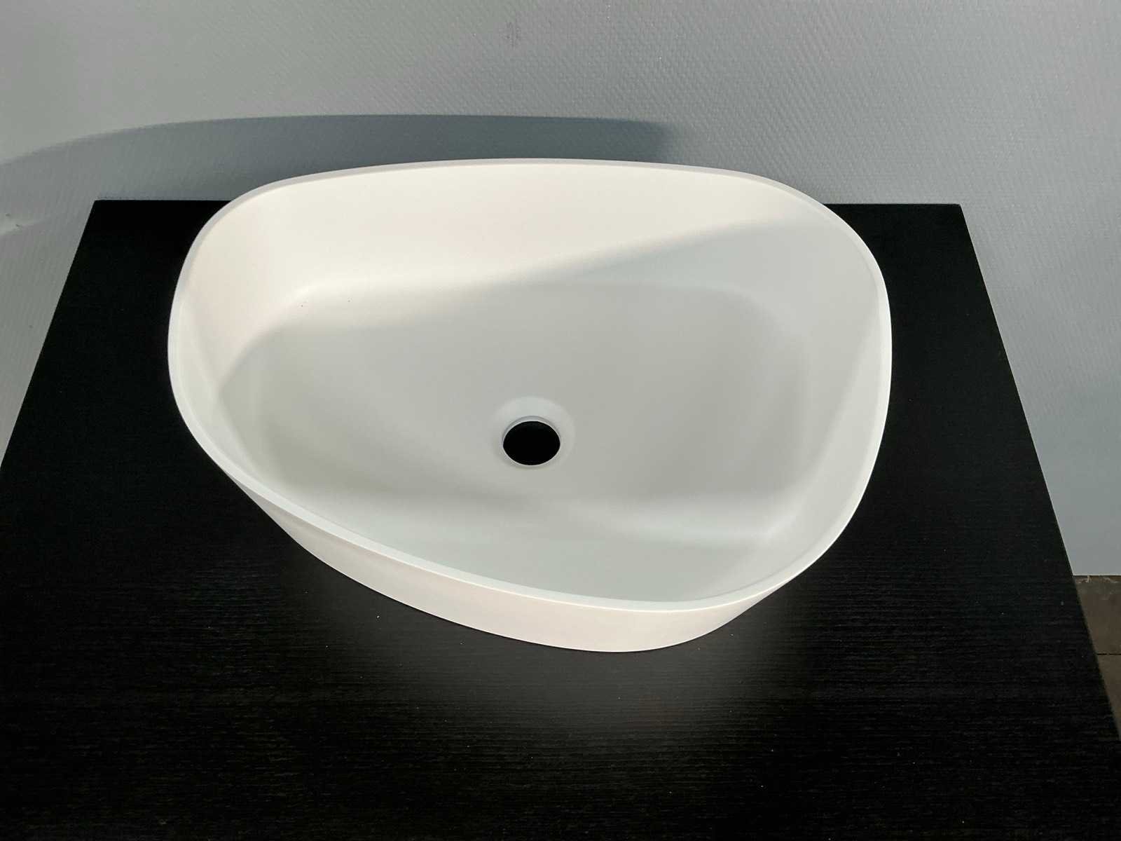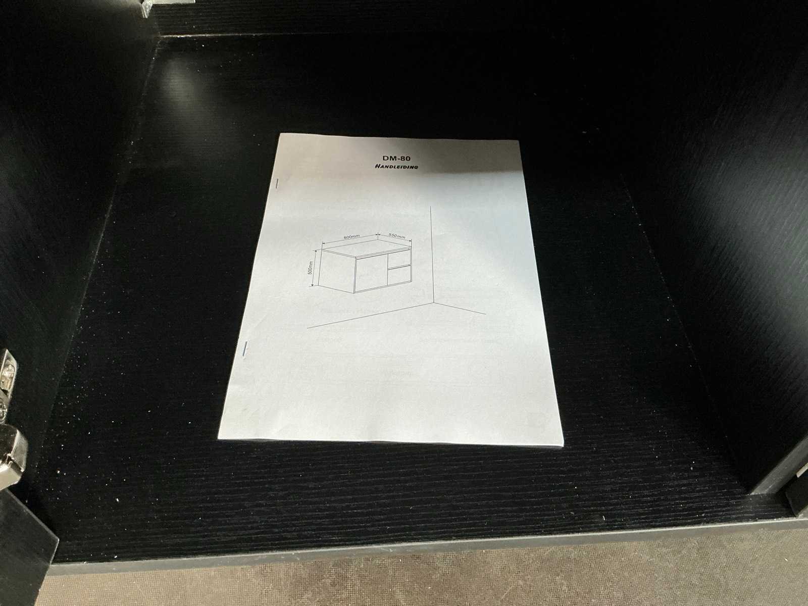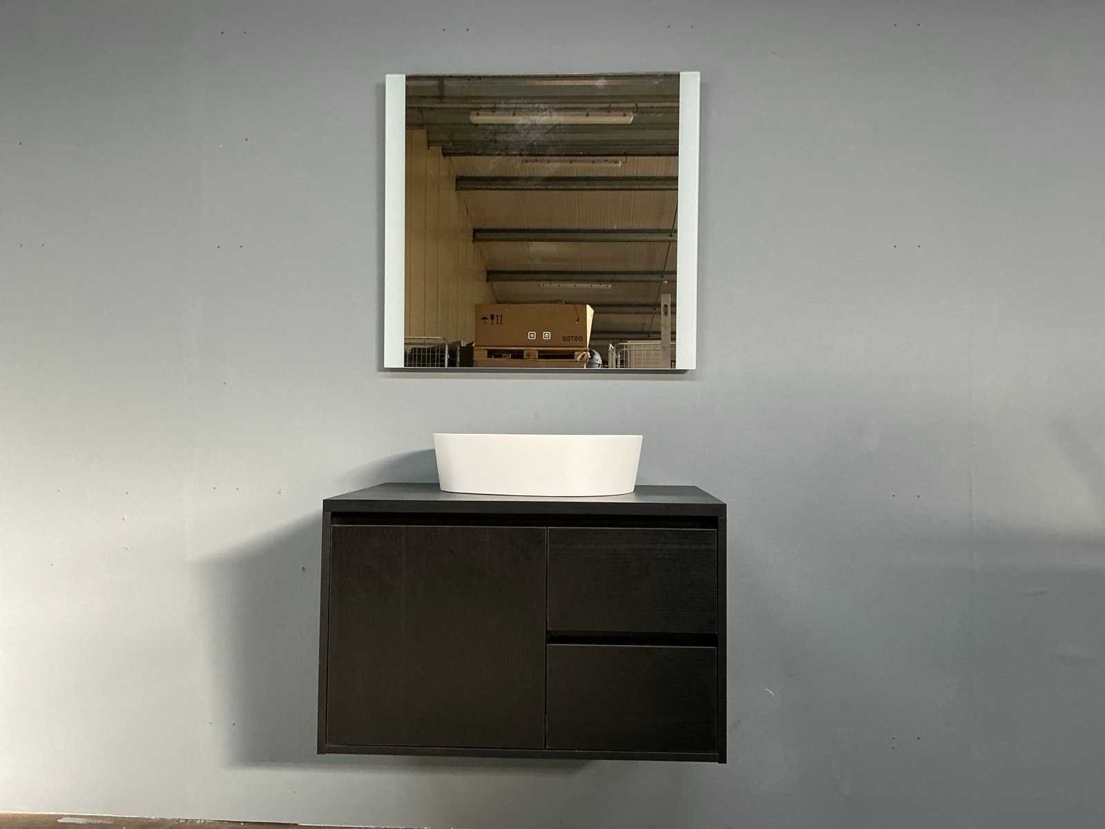 Badmeubelset met: onderkast 55x80x50 cm, spiegel 75x80 cm, waskom 50x38 cm Kleur: Zwart,Mat Wit Waskom: Arcua Rocker Spiegel met verlichting: Primabad Lades: 2