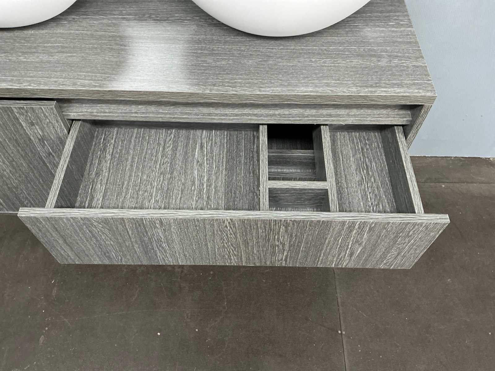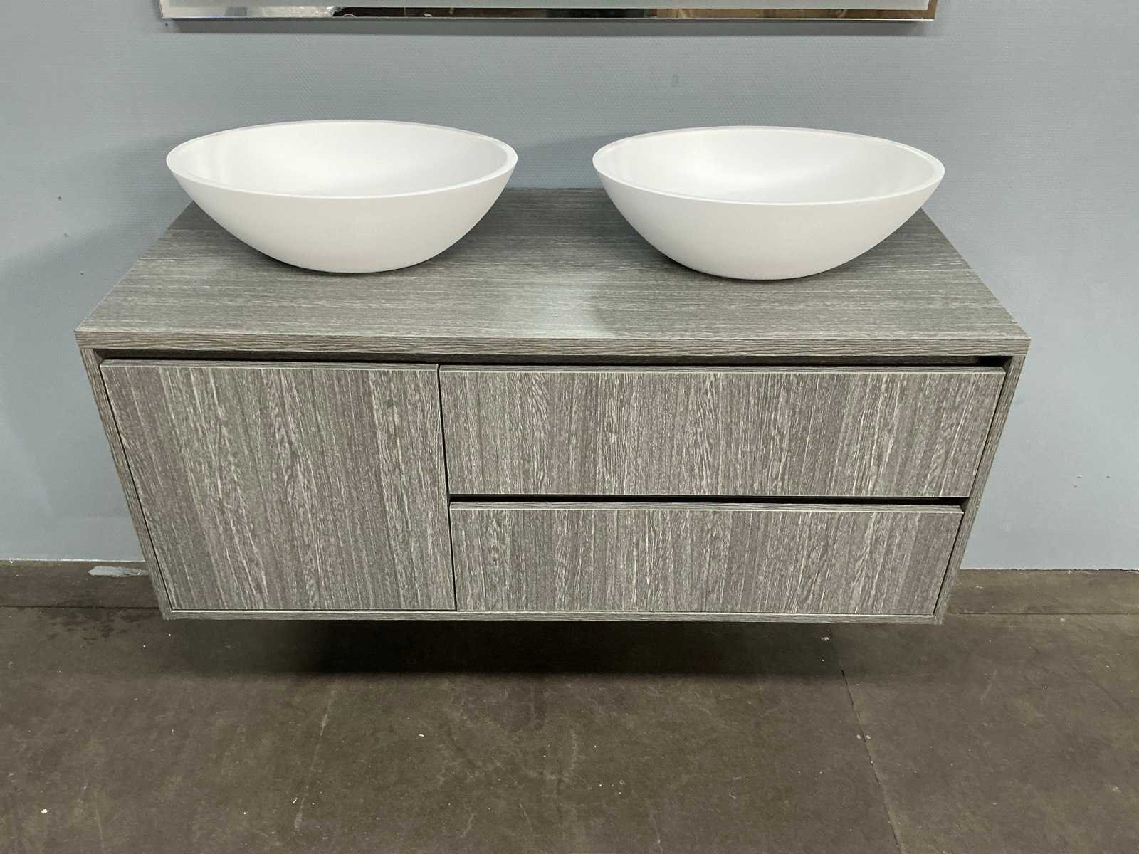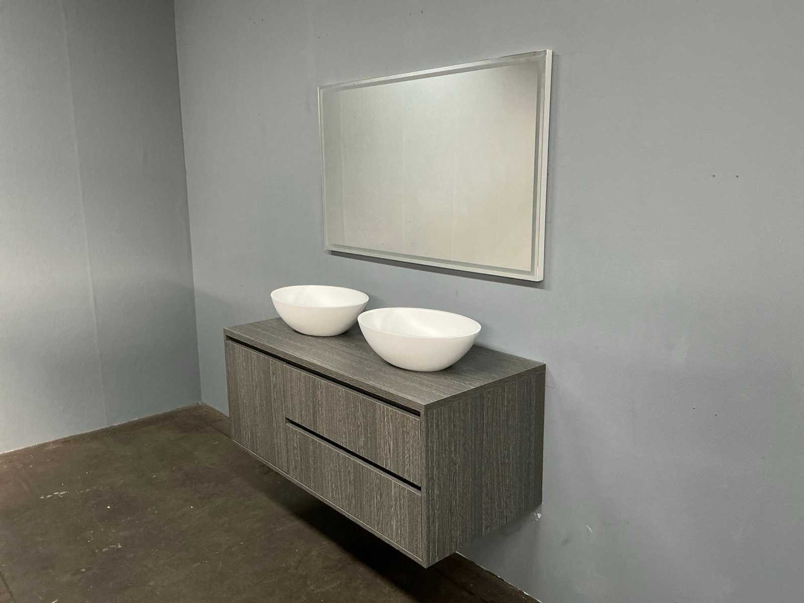 Badmeubelset met: onderkast 55x120x50 cm, waskommen 49x34 cm, spiegel 120x70 cm Kleur: Grijs,Mat Wit Waskom: Arqua Case Spiegel met verlichting: Primabad Lades: 2