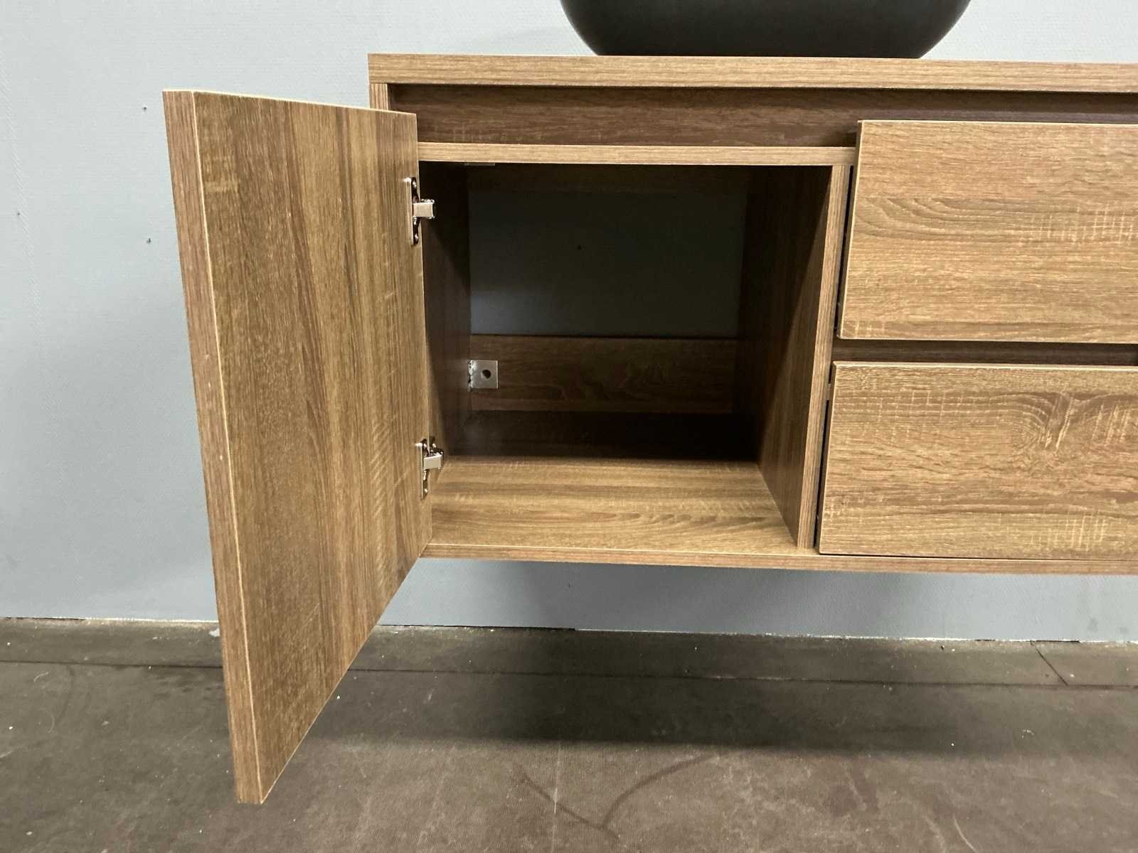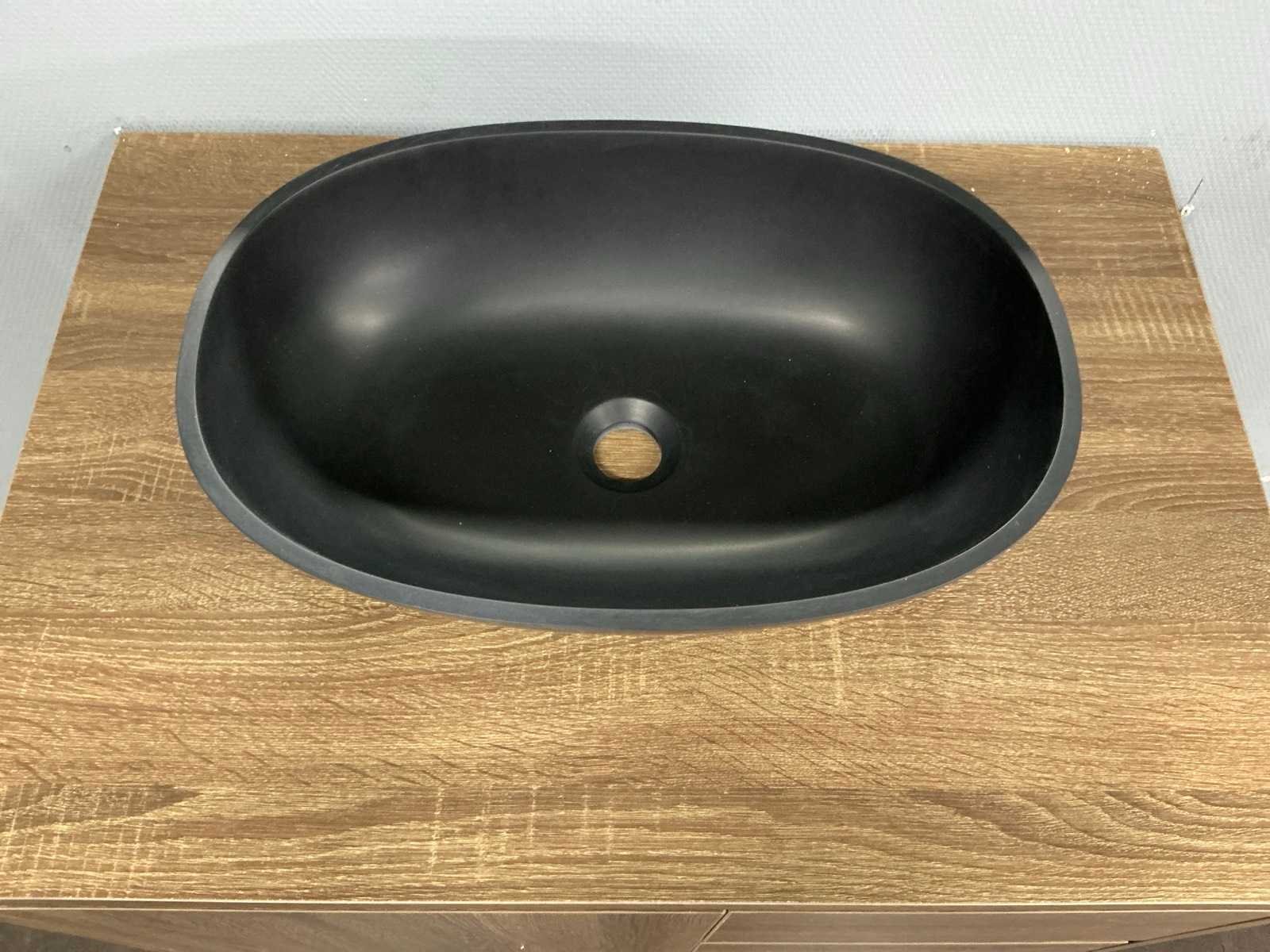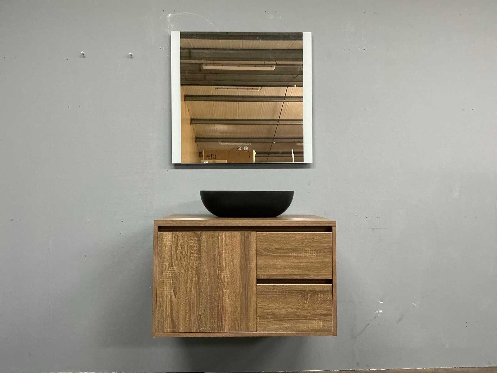 Badmeubelset met: onderkast 55x80x50 cm, waskom 48x32,5x13,5 cm, spiegel 80x75 cm Kleur: Hout,Antraciet Mat Waskom: Luca Sanitair Spiegel met verlichting: Primabad Lades: 2 Bevestigingsmateriaal: true