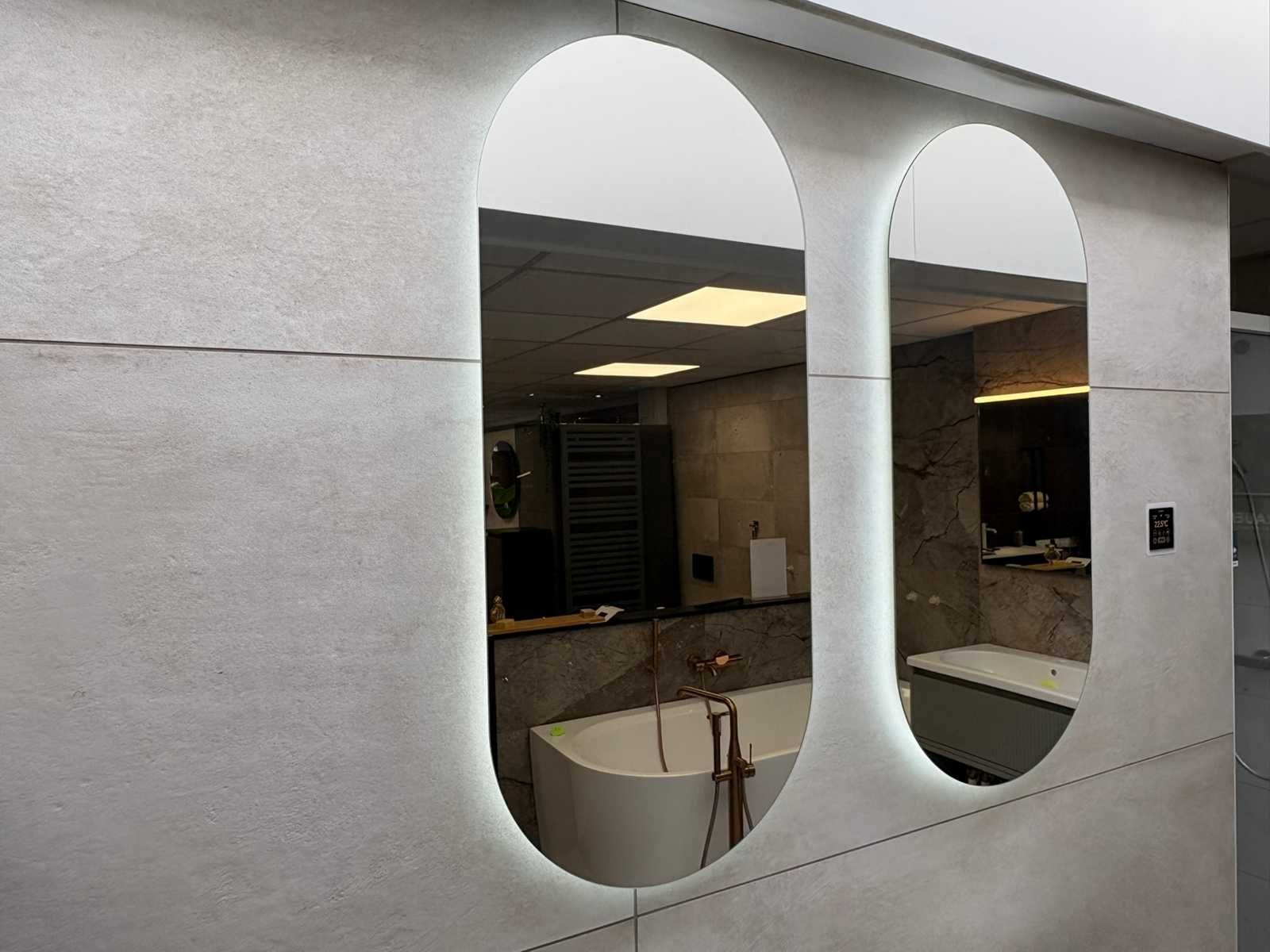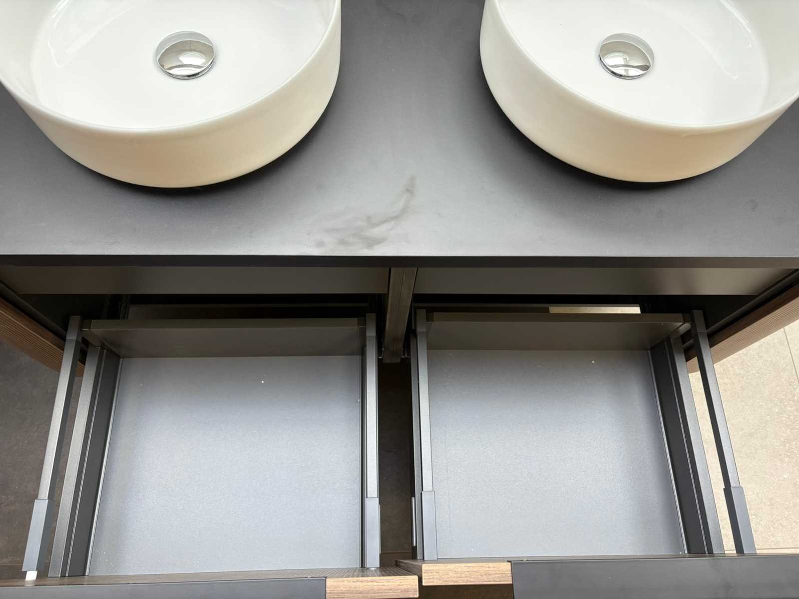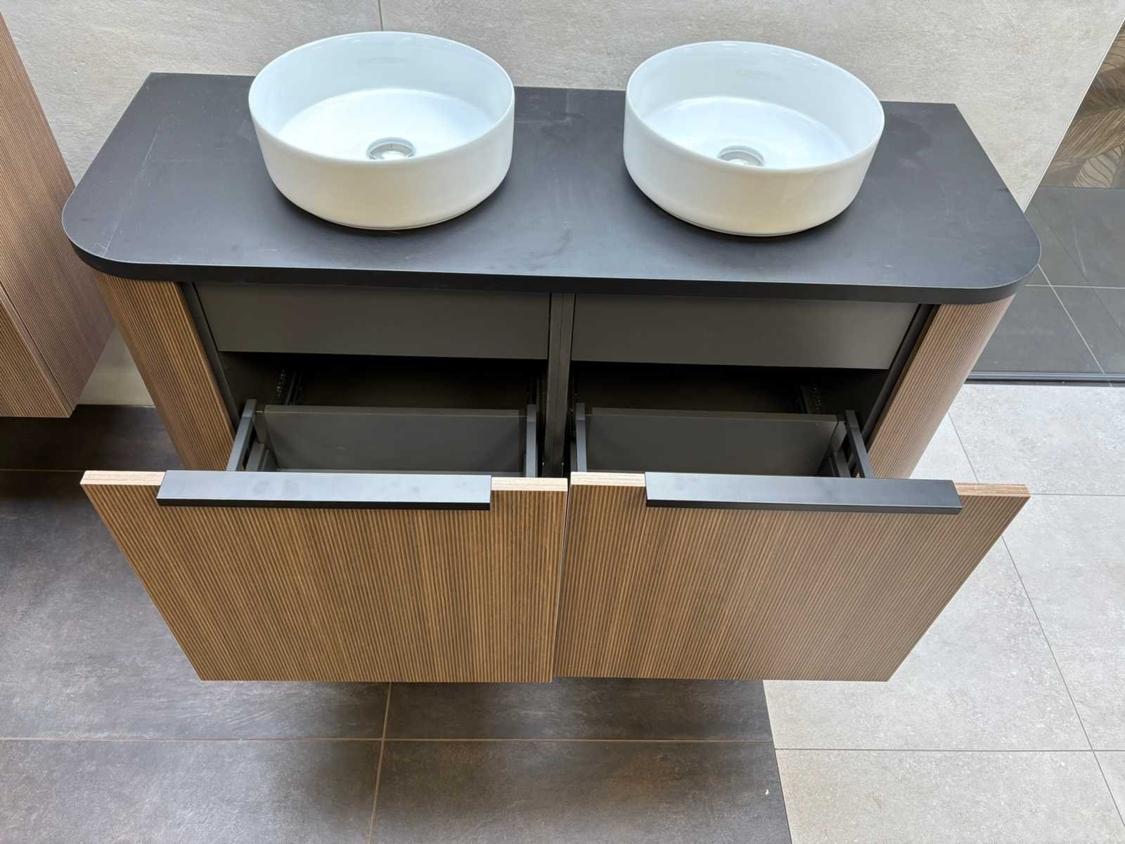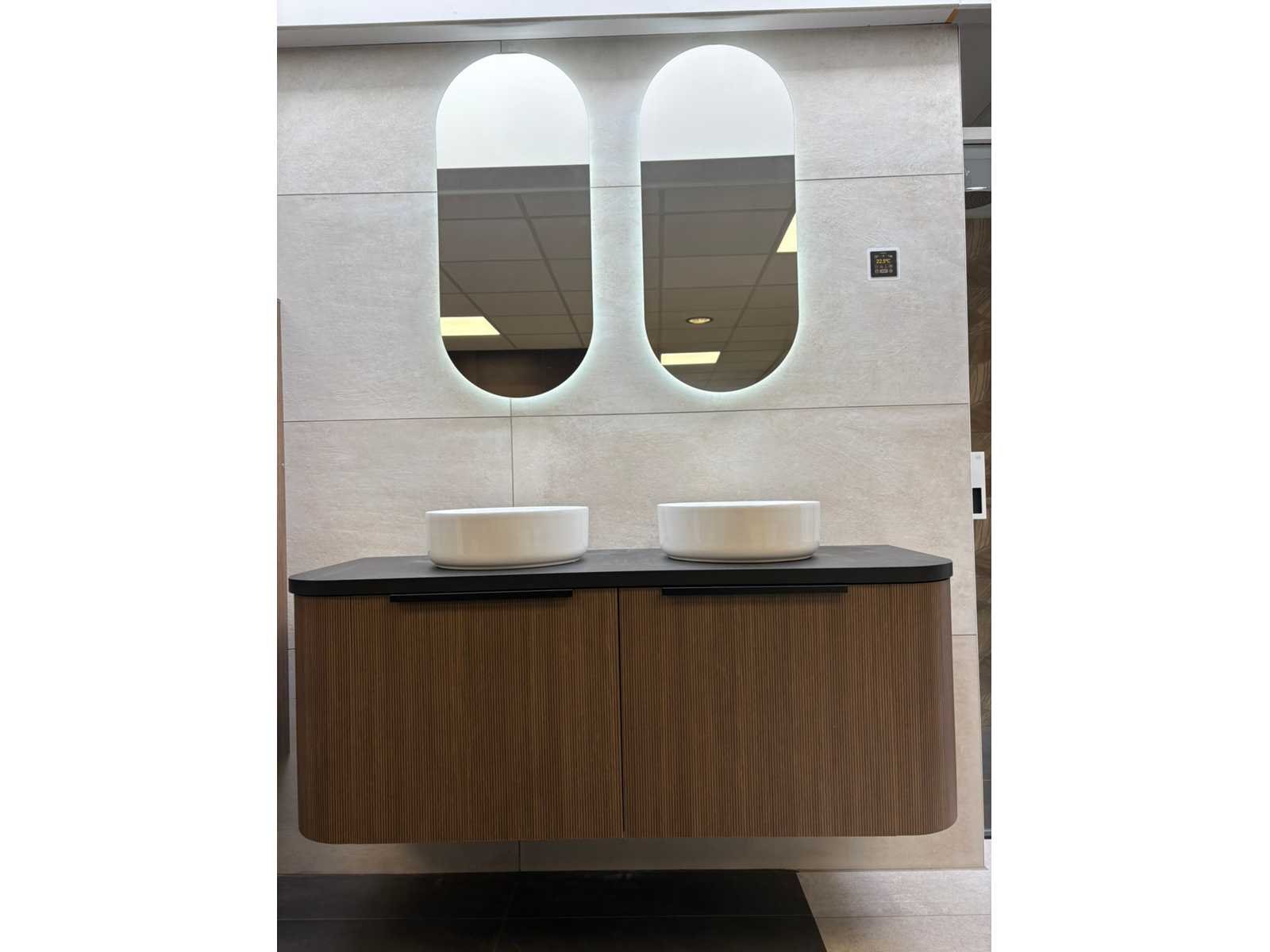 Bestaande uit: Wastafel (137,5x51x51) met wasbakken 1e: 2 spiegels met sfeerverlichting (90x40) 2e: Kast (60x33x119,5) 3e: Vasco designradiator
