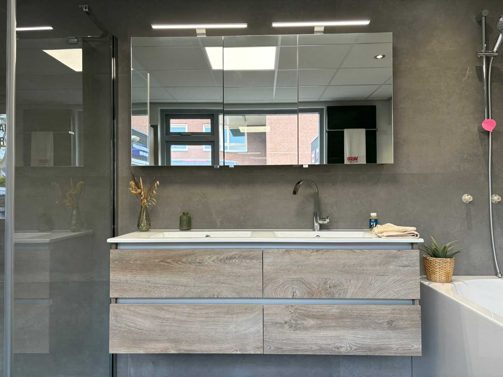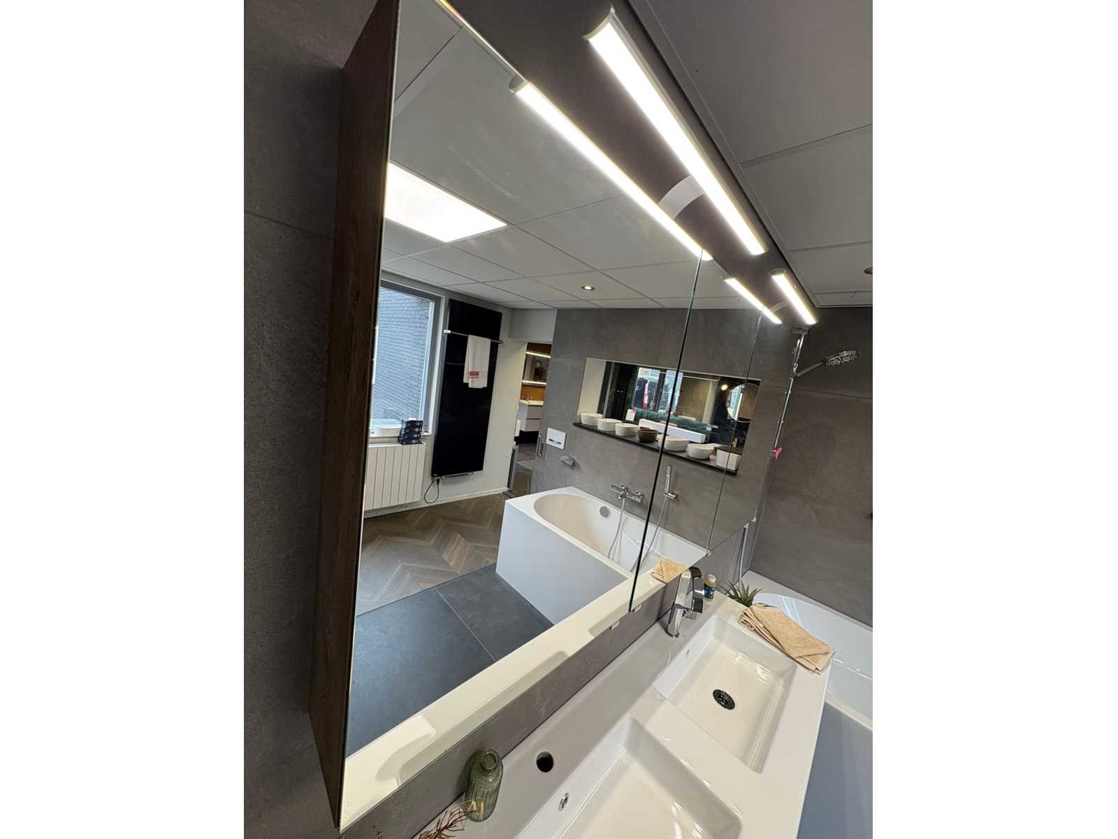 Bestaande uit: Novillini Douchecabine (94x94x201) 1e: Bad (179x80x62,5) met doucheset 2e: Thebalux Wasbakset (142x46,5x52) met verlichte spiegelkast 3e: Vasco Designradiator 4e: Hotbath kranenset