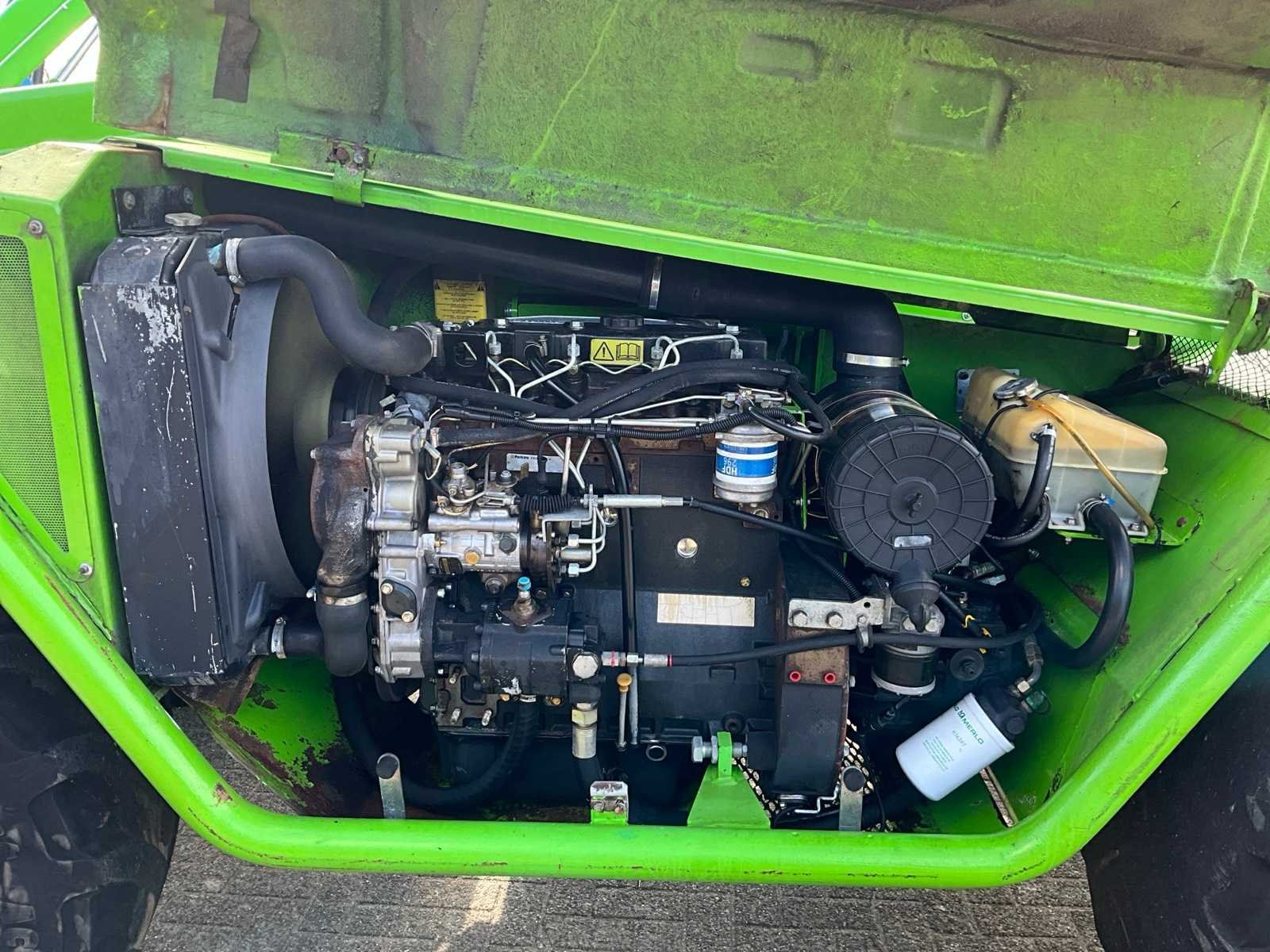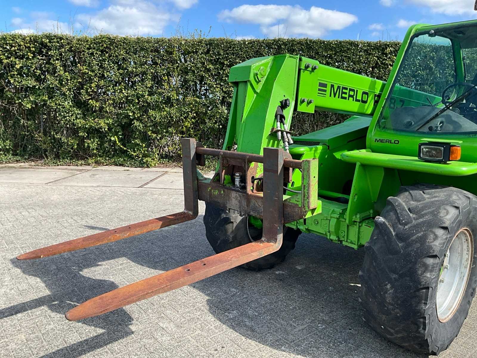 Voorzien van “Perkins” 4-cilinder dieselmotor; extra hydraulische ventielen voor en achter; graafbak 200 cm en graafbak 225 cm; bandenmaat 460/70R24; Merk: Merlo Type: P28.7 KT Bouwjaar: 2001 Serienummer: B140135 Kenteken: TVV-92-B Hefvermogen: 2800kg Hefhoogte: 7000mm Cabine: true Lepellengte: 1180mm Luchtbanden: true Afgelezen urenstand: 6125 Eigen gewicht: 6400kg Totale afmeting L: 6100mm Totale afmeting Breedte: 2250mm Totale afmeting Hoogte: 2700mm