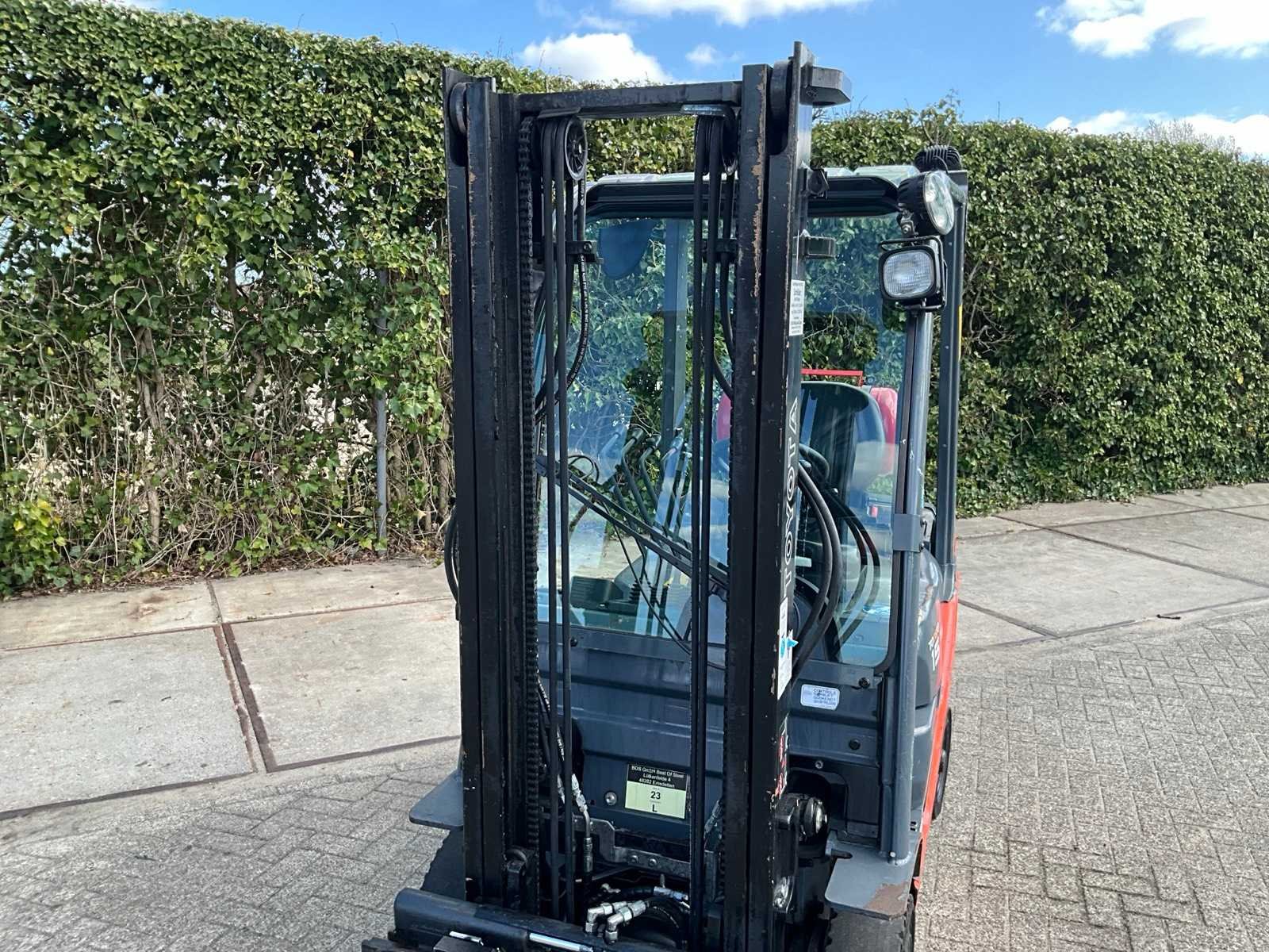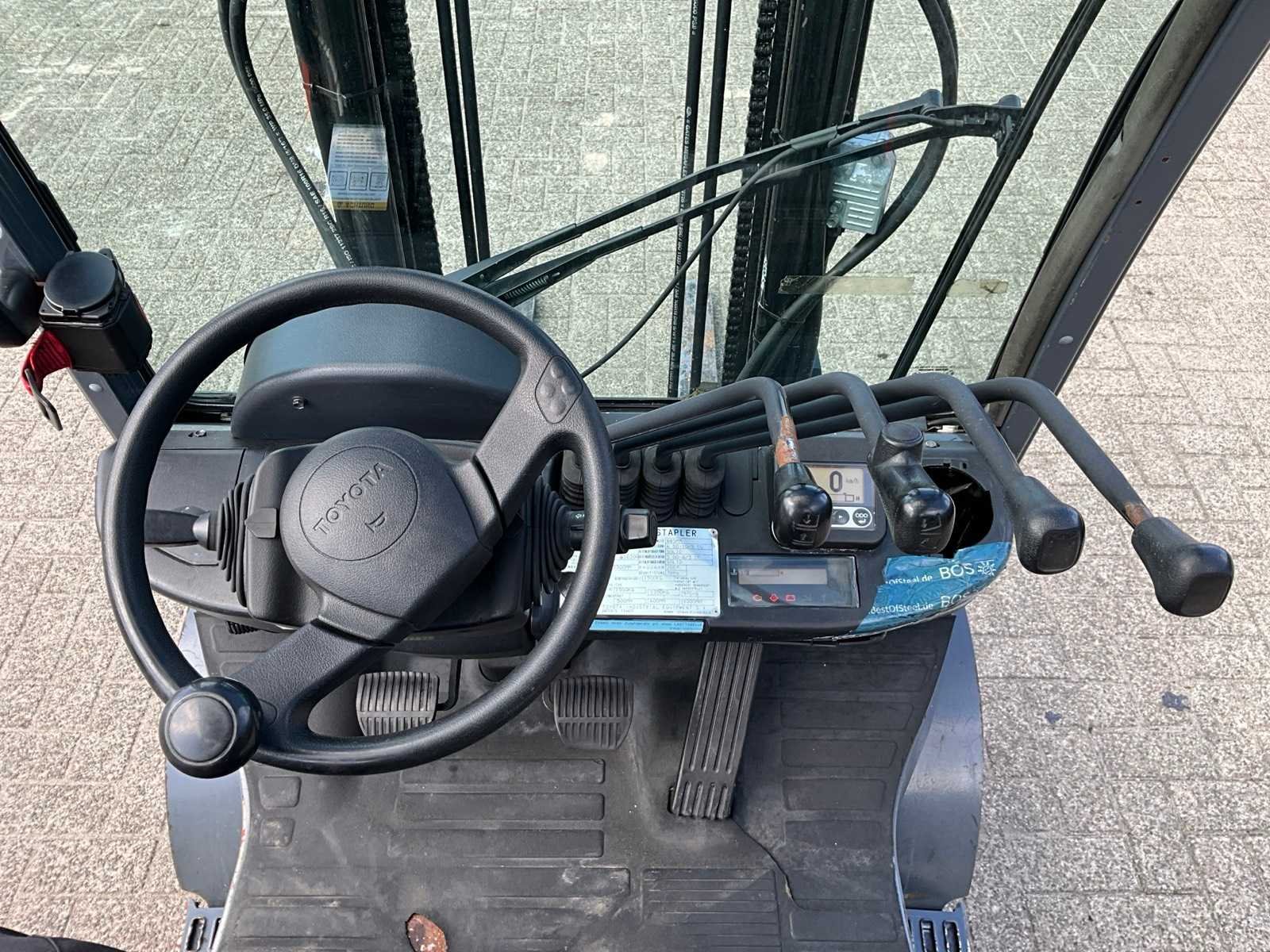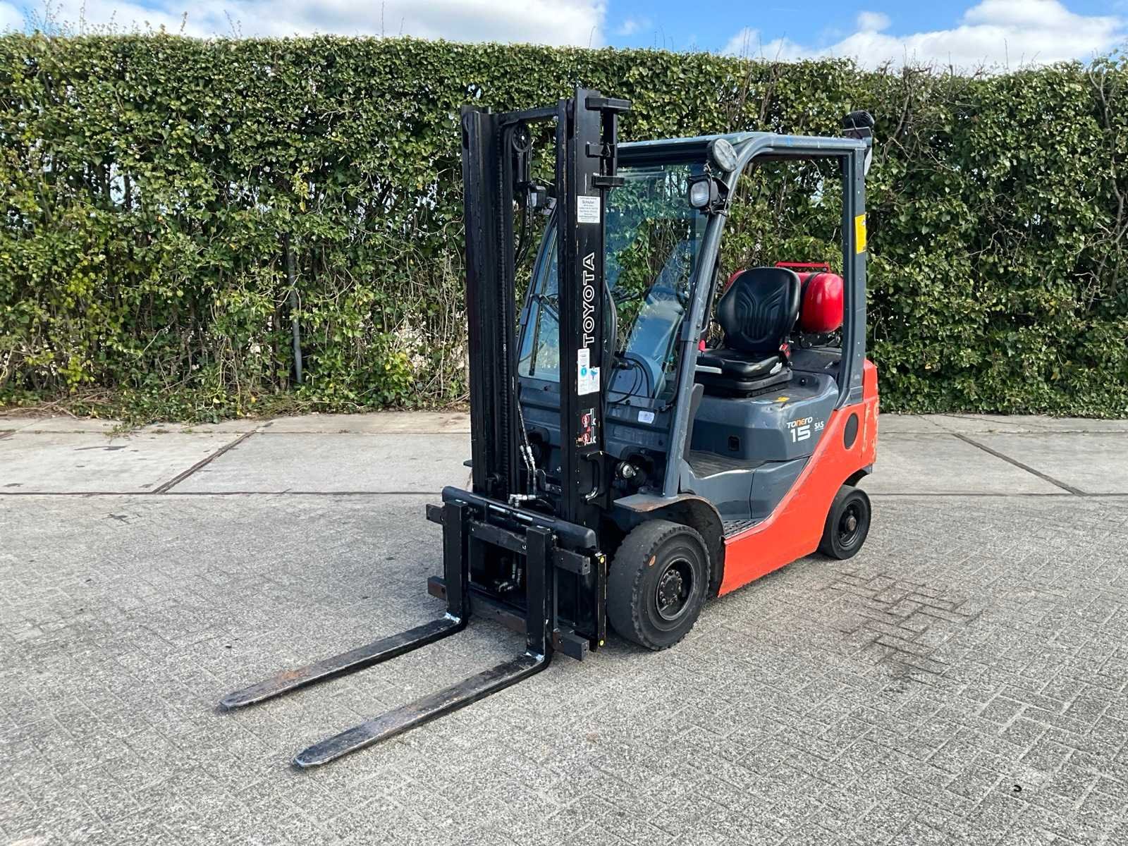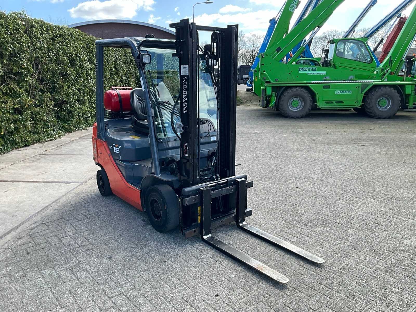 Motorvermogen 38kW; km-stand 62307; voorzien van “Toyota” 4Y ECS 4-cilinder motor; ruitenwisser en werklampen Merk: Toyota Type: 02-8FGF15 Bouwjaar: 2007 Serienummer: 57842-F2100-71-A Brandstof: LPG Kenteken: Geen registratie Mast: Single Soort band: Volrubber banden Aantal wielen: 4 Side-shift: true Duplex mast: true Eigen gewicht: 2650kg Hefvermogen: 1500kg Lepellengte: 1000mm Hefhoogte: 3300mm Vol rubber banden: true Minimale doorrijhoogte: 2250mm Totale afmeting L: 3500mm Totale afmeting Breedte: 1100mm Totale afmeting Hoogte: 2250mm LPG: true
