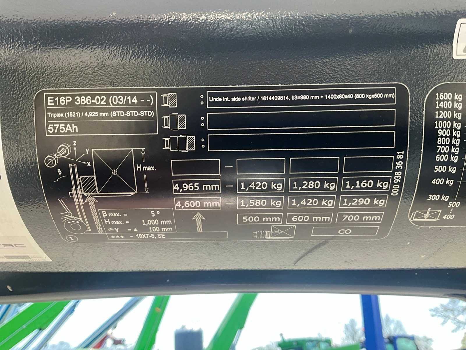 Voorzien van werklampen; acculader en digitale uitlezing Merk: Linde Type: E16P-02 Bouwjaar: 2019 Serienummer: H2X386V08737 Brandstof: Elektrisch Kenteken: Geen registratie Mast: Triple Soort band: Volrubber banden Aantal wielen: 4 Afgelezen urenstand: 14111 Accu lader: true Free-lift: true Side-shift: true Triple mast: true Eigen gewicht: 3414kg Hefvermogen: 1600kg Lepellengte: 1350mm Hefhoogte: 4965mm Vol rubber banden: true Minimale doorrijhoogte: 2250mm Totale afmeting L: 3500mm Totale afmeting Breedte: 1100mm Totale afmeting Hoogte: 2250mm