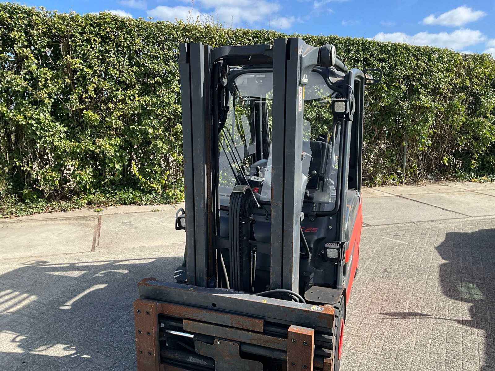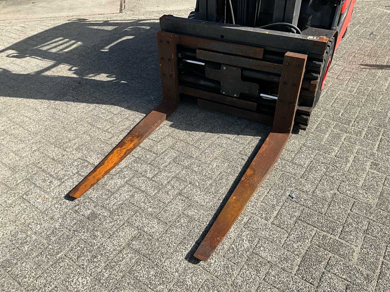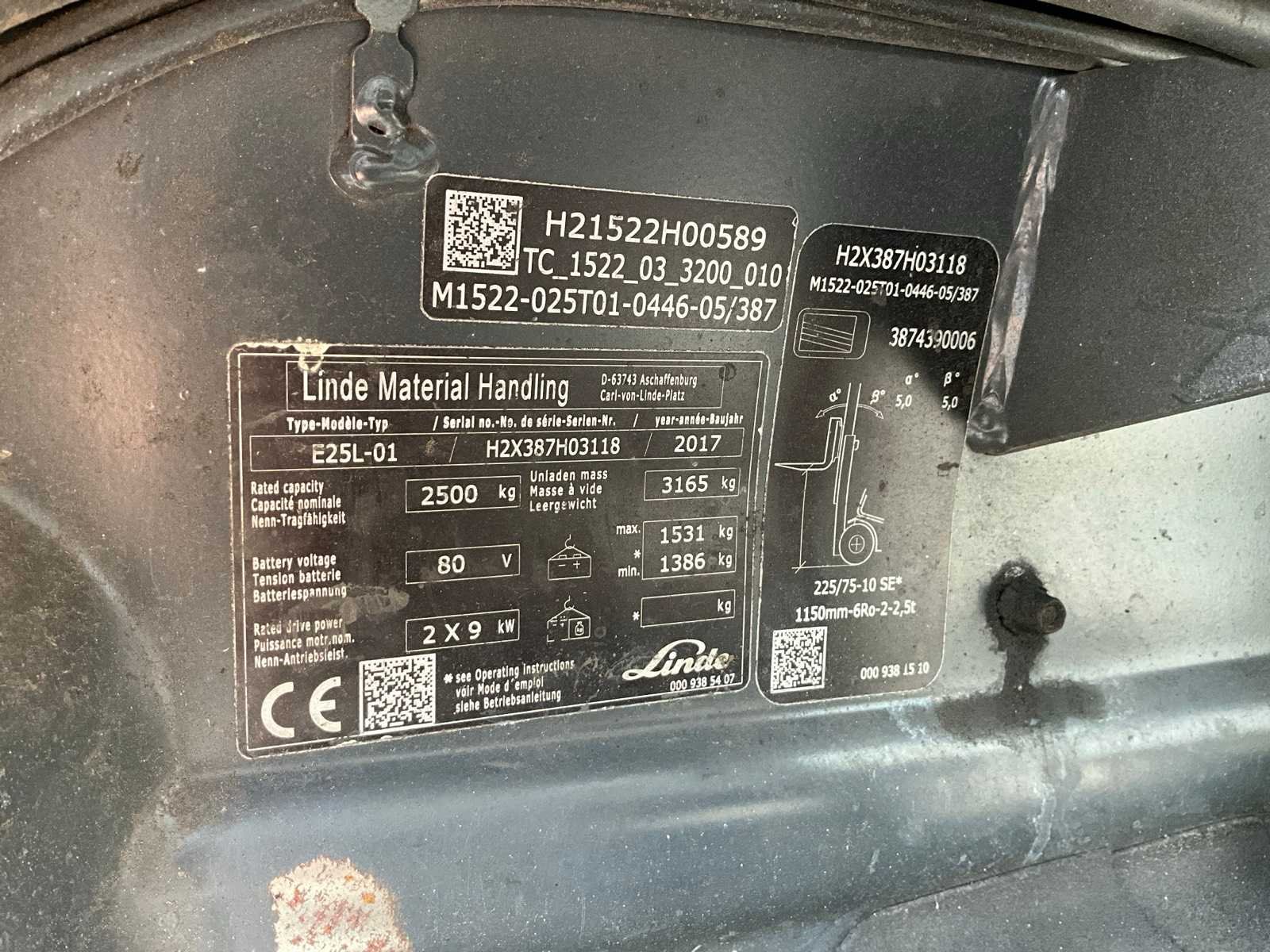 Voorzien van “Stabau” S12-HKG vorkenbord met hydraulisch verstelbare lepels tot 185 cm breed; geïntegreerde acculader 380V; ruitenwissers en werklampen Merk: Linde Type: E25L-01 Bouwjaar: 2017 Serienummer: H2X387H03118 Brandstof: Elektrisch Mast: Triple Soort band: Volrubber banden Aantal wielen: 4 Afgelezen urenstand: 5980 Free-lift: true Side-shift: true Hydraulisch verstelbare lepels: true Duplex mast: true Eigen gewicht: 4596kg Hefvermogen: 2500kg Lepellengte: 1150mm Hefhoogte: 4505mm Totale afmeting L: 3800mm Totale afmeting Breedte: 1250mm Totale afmeting Hoogte: 2150mm