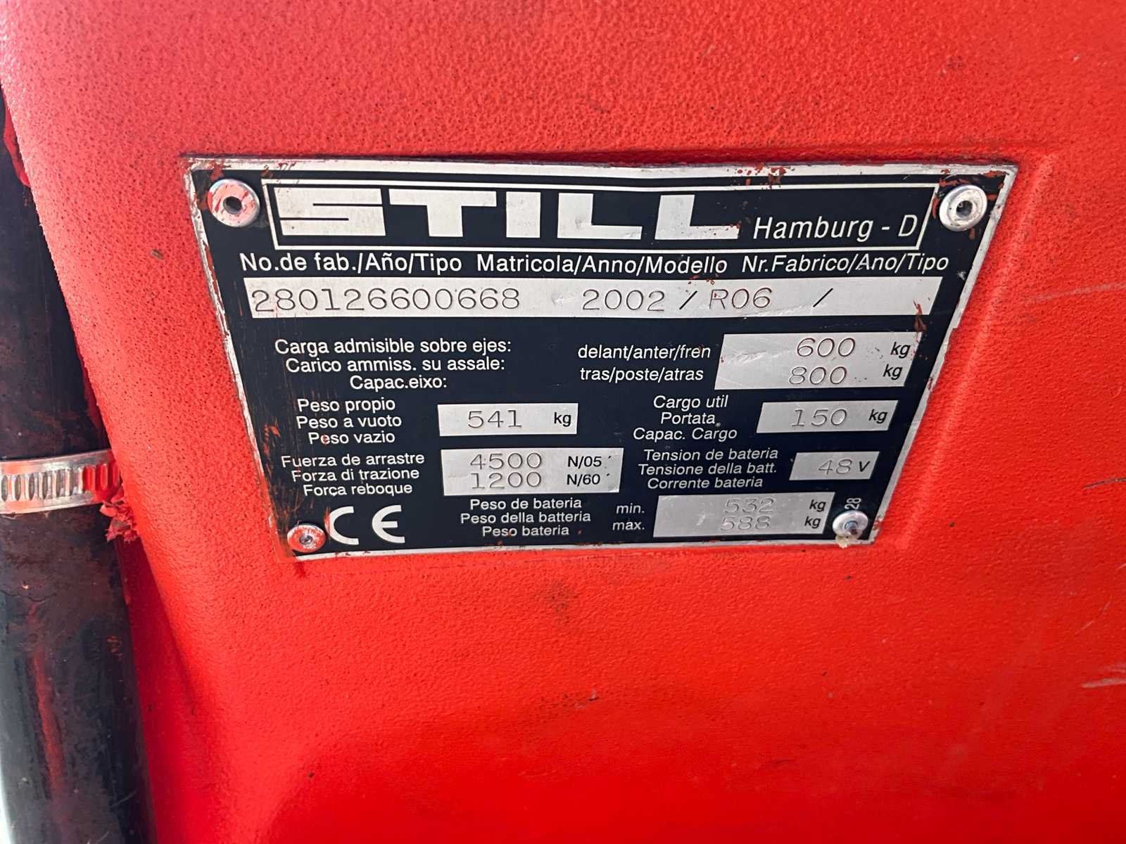Merk: STILL Type: R06 Bouwjaar: 2002 Serienummer: 280126600668 Kenteken: Geen registratie Trekcapaciteit: 6000kg Accu lader: true Afgelezen urenstand: 20896 Eigen gewicht: 1100kg Totale afmeting L: 1650mm Totale afmeting Breedte: 1000mm Totale afmeting Hoogte: 1450mm