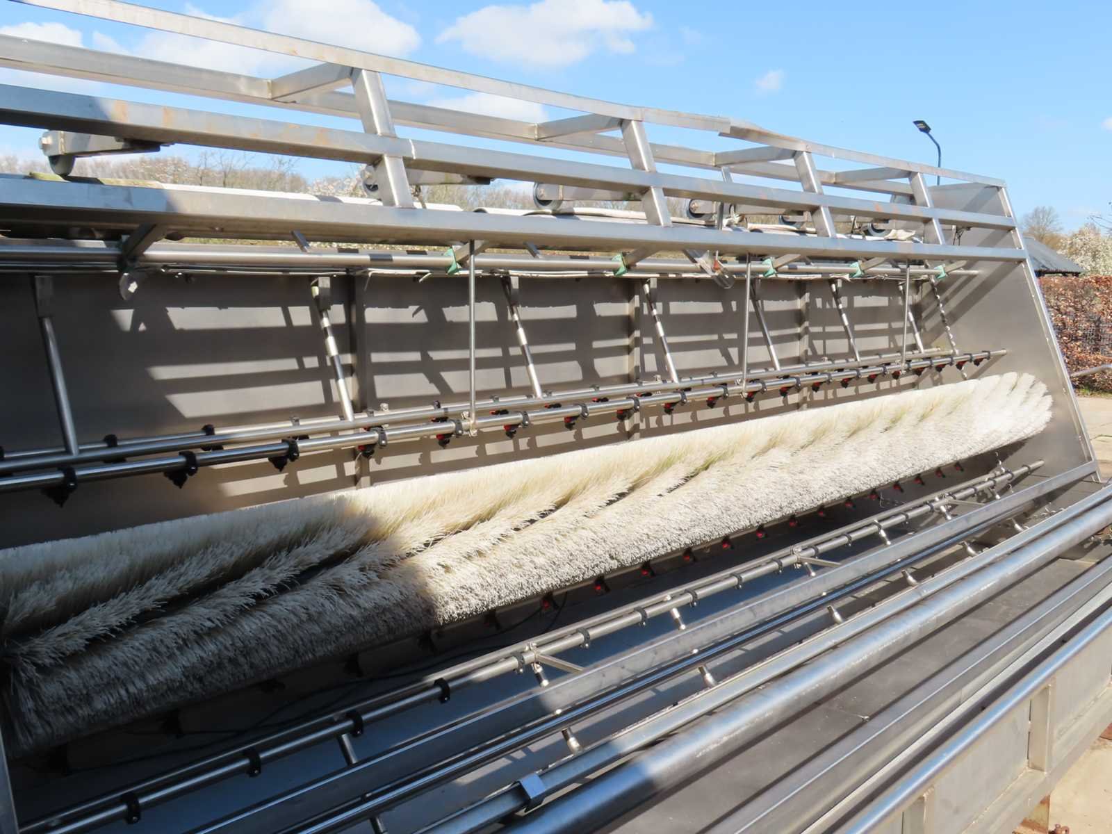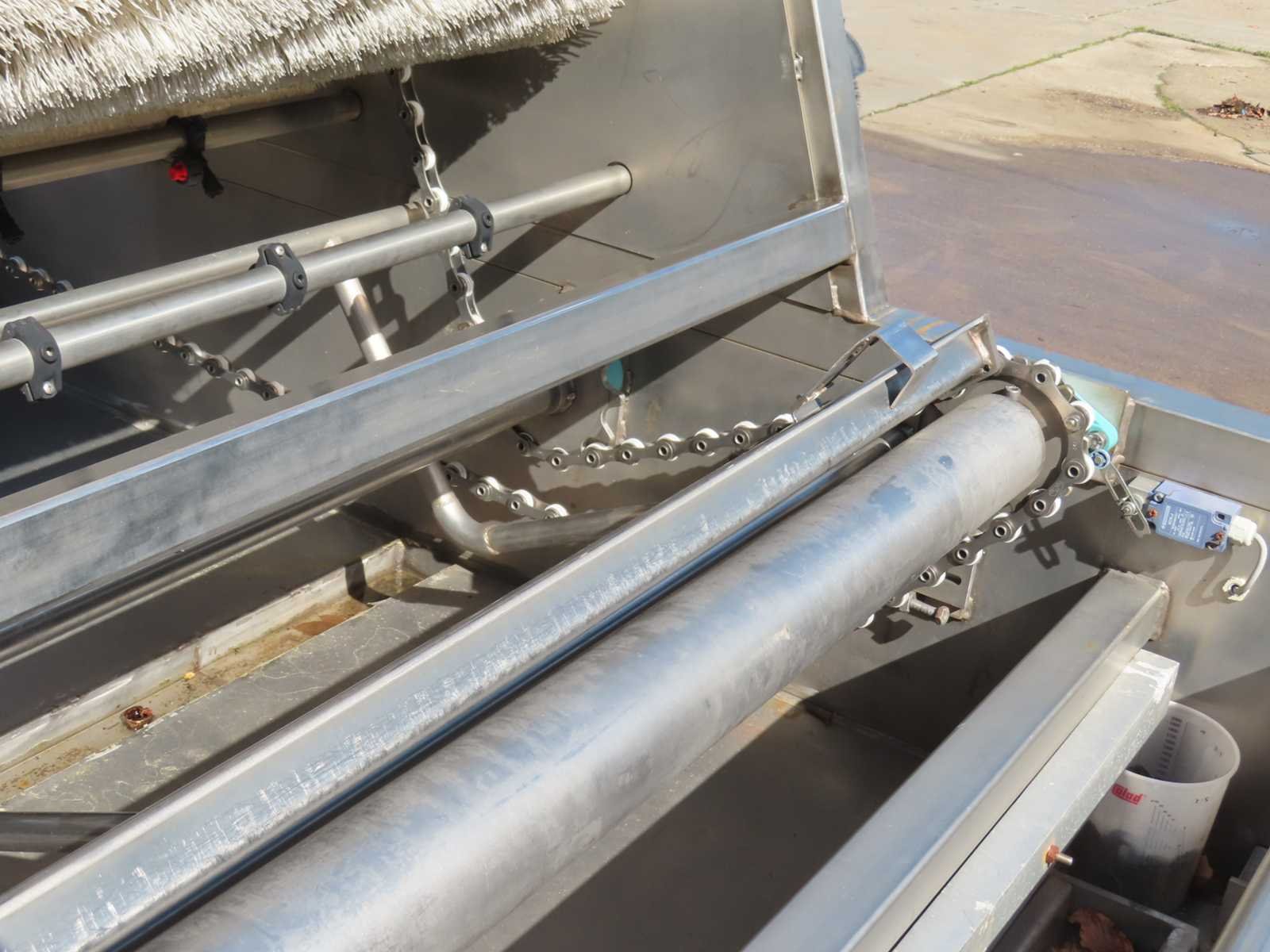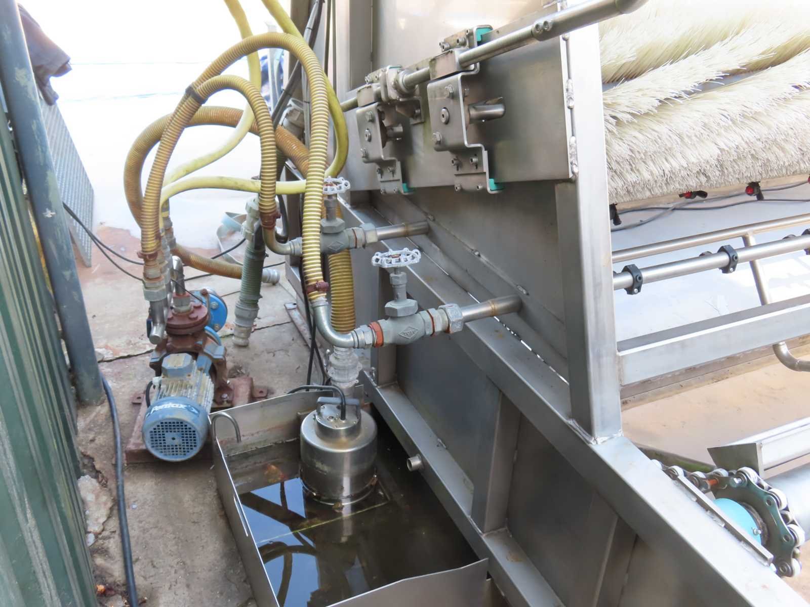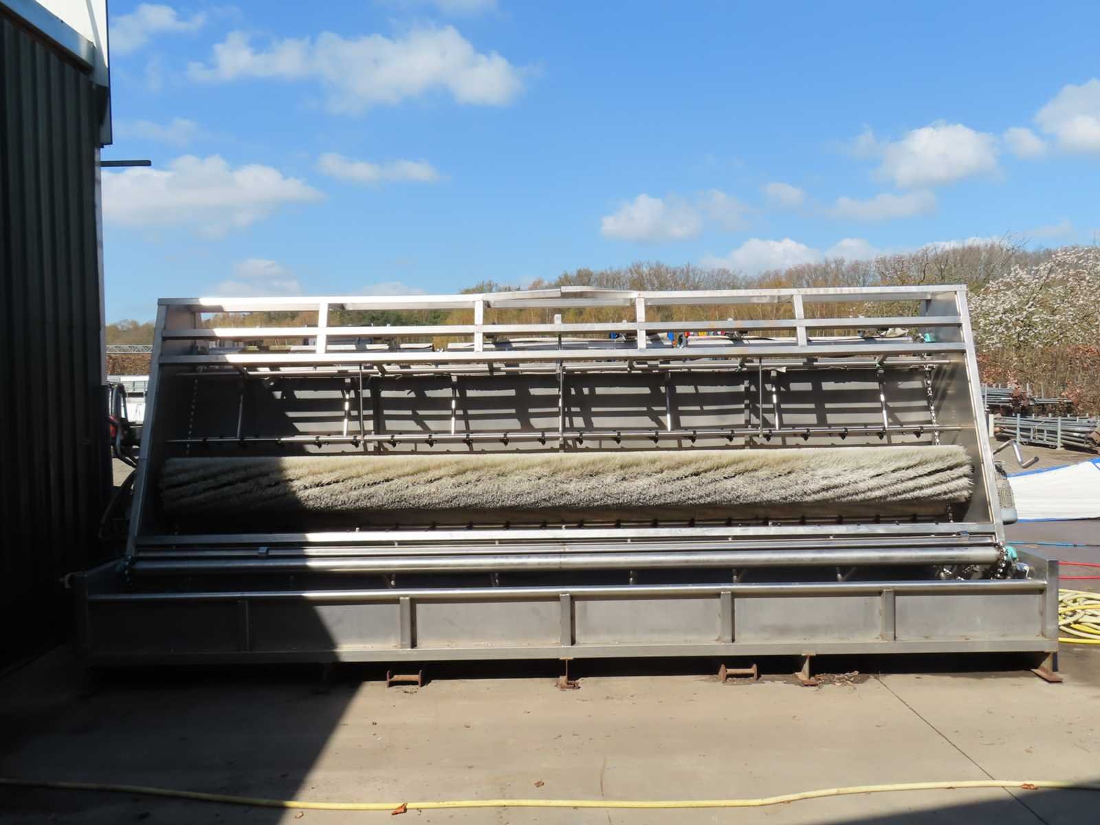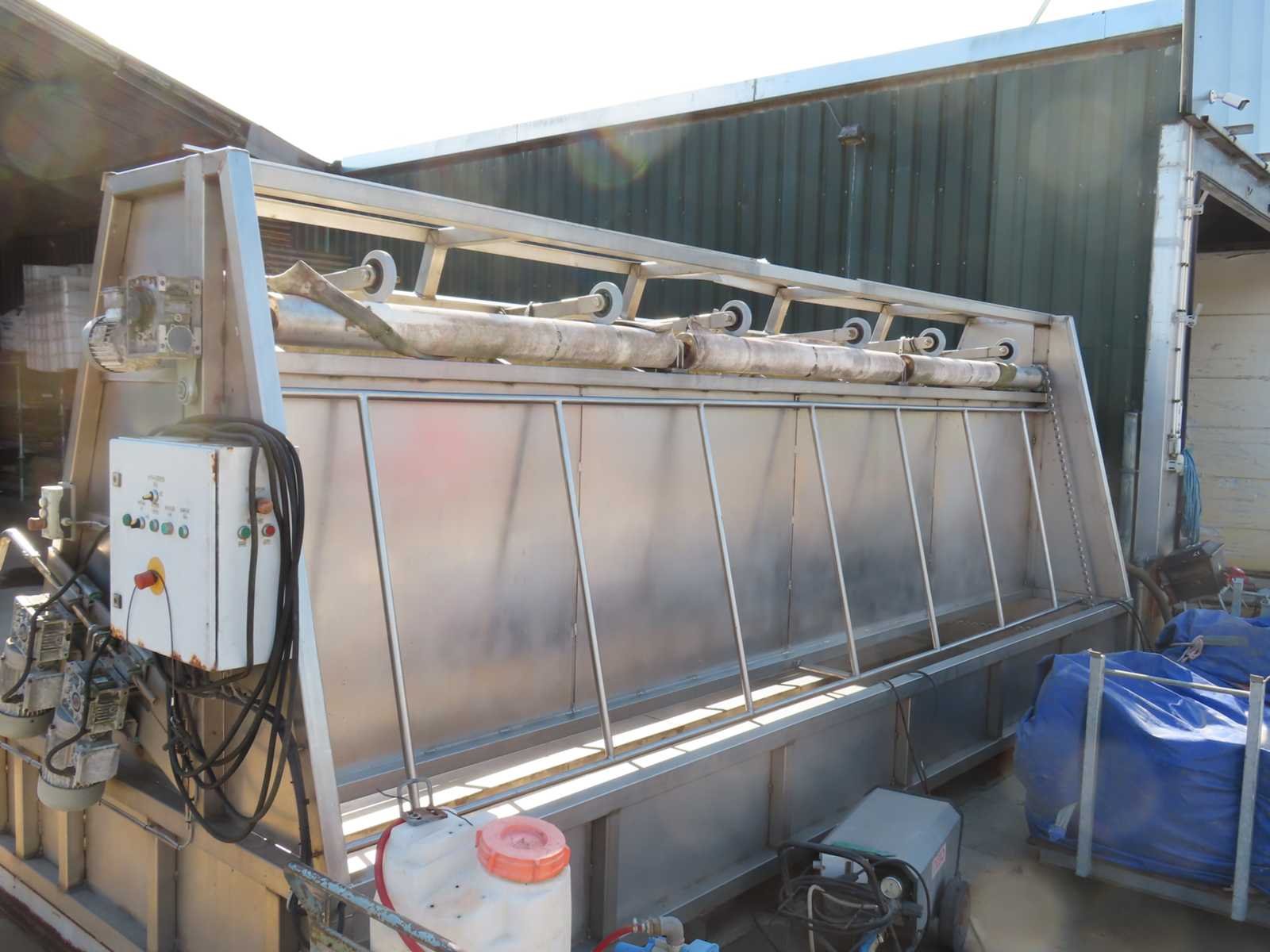 RVS constructie, voorzien van kettingaandrijving, 380V, 2 x pomp. Lengte: 650cm Breedte: 242cm Hoogte: 250cm Materiaal: RVS