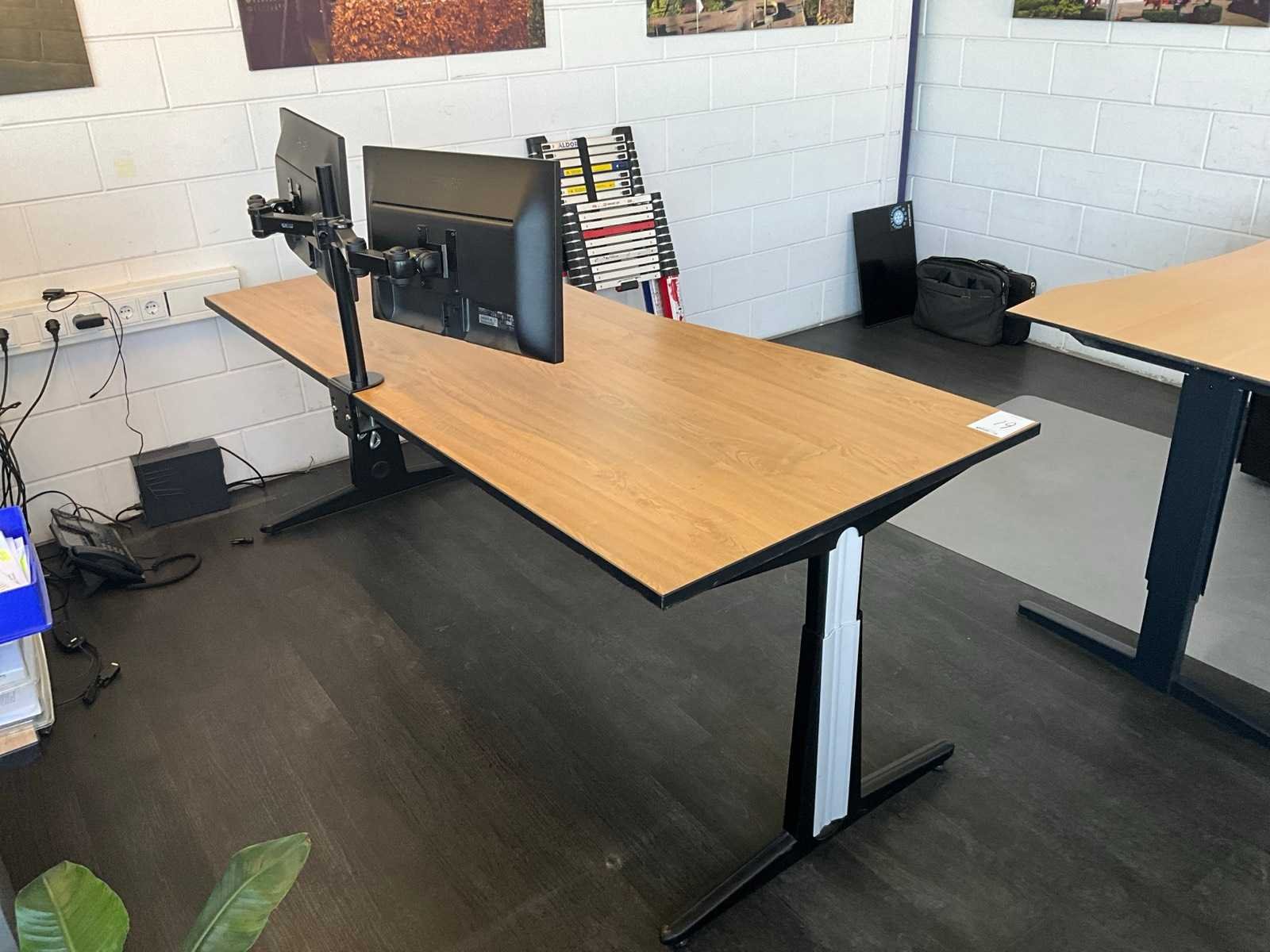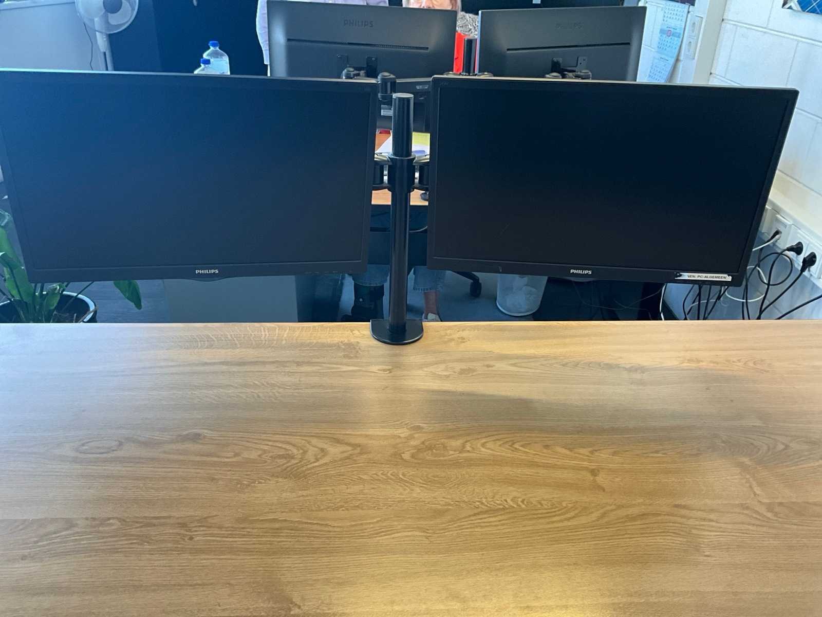 Inclusief 2x Philips monitor met beugel Slingerbureau: true Breedte: 200cm Hoogte: 76cm Materiaal: Hout/metaal Diepte: 90cm