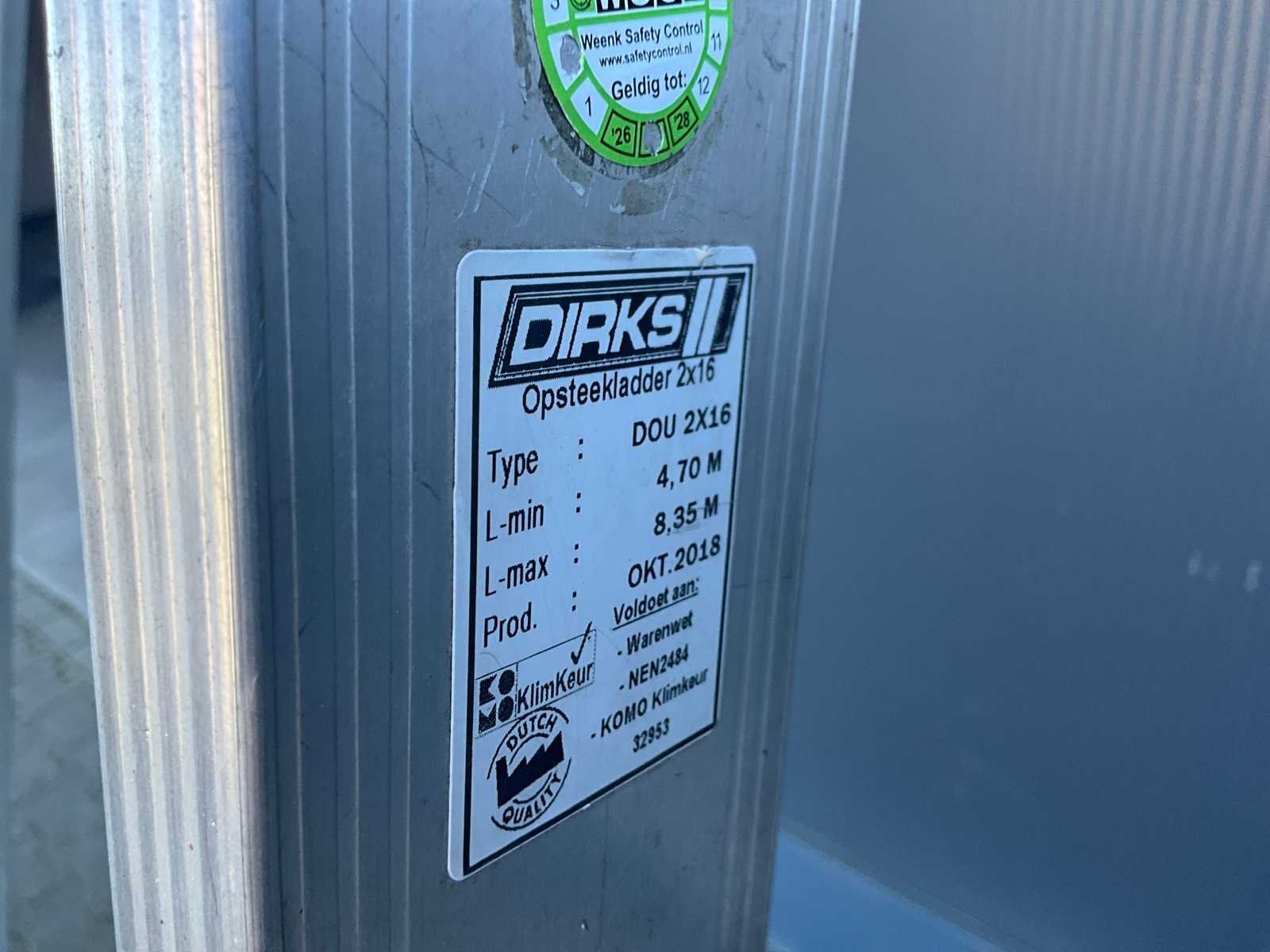 Merk: Dirks Type: DOU 2X16 Bouwjaar: 2018 Aantal treden: 16 Aantal sporten: 2 Aluminium: true Schuifladder: true Totale afmeting L: 4700mm Totale afmeting Breedte: 800mm