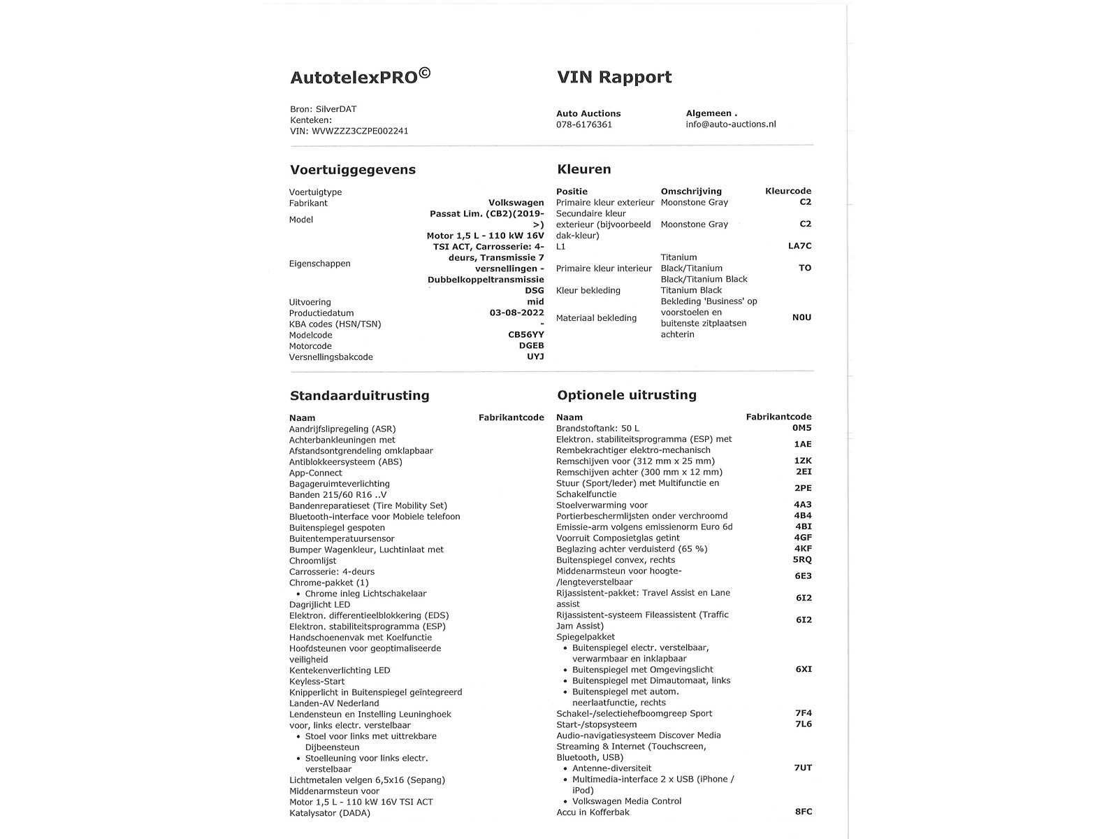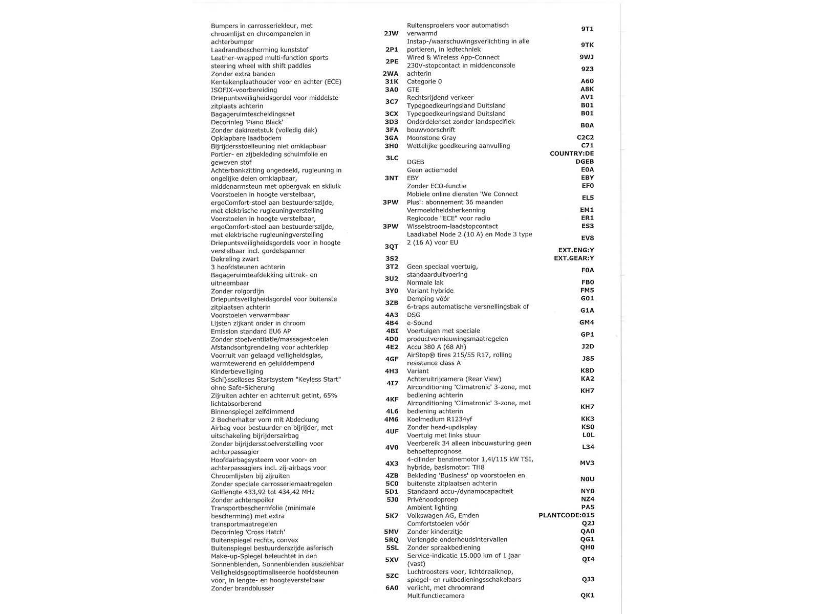 Duitse kenteken papieren. Indien gewenst kunnen wij het gehele import proces voor u verzorgen, RDW invoer, BPM taxatie, Douane afwikkeling, stalling etc. Voor deze auto zijn de totale invoerkosten inclusief de BPM €1.195.- Dus voor €1.195.- boven op uw aankoopprijs verzorgen wij het NL kenteken voor u. (This option is only for Dutch buyers) Voor vragen kunt u mailen naar info@auto-auctions.nl Kenteken: Duitse kenteken papieren Merk: Volkswagen Model: Passat Variant Type: GTE 1.4 TSI PHEV Afgelezen kilometerstand: 49884km Cilinderinhoud: 1395cc Vermogen (kW): 160kW Brandstof: Hybride Benzine Chassisnummer: WVWZZZ3CZPE002241 Datum eerste toelating: 08-08-2022 Vermogen (pk): 218hp Aantal zitplaatsen: 5 Kleur: Moonstone Grey Transmissie: Automaat Aantal deuren: 5 Aantal sleutels: 2 Aantal cilinders: 4 Carrosserie: Stationwagen Nationaliteit documenten: Duitse Kenteken Papieren Onderhoudshistorie: Digitaal Volledig Aanwezig Start en rijdt: Ja oplaadkabel : Aanwezig