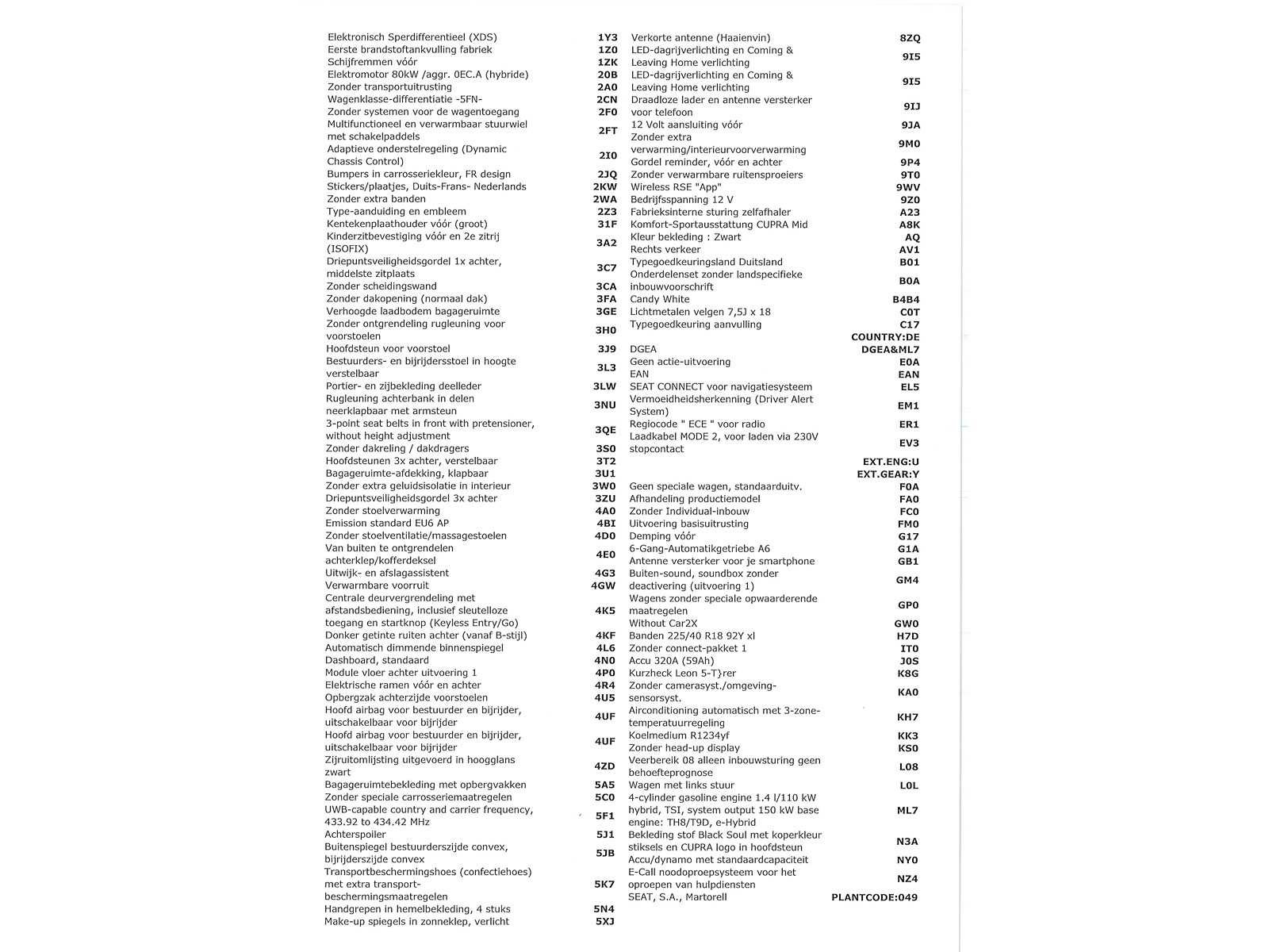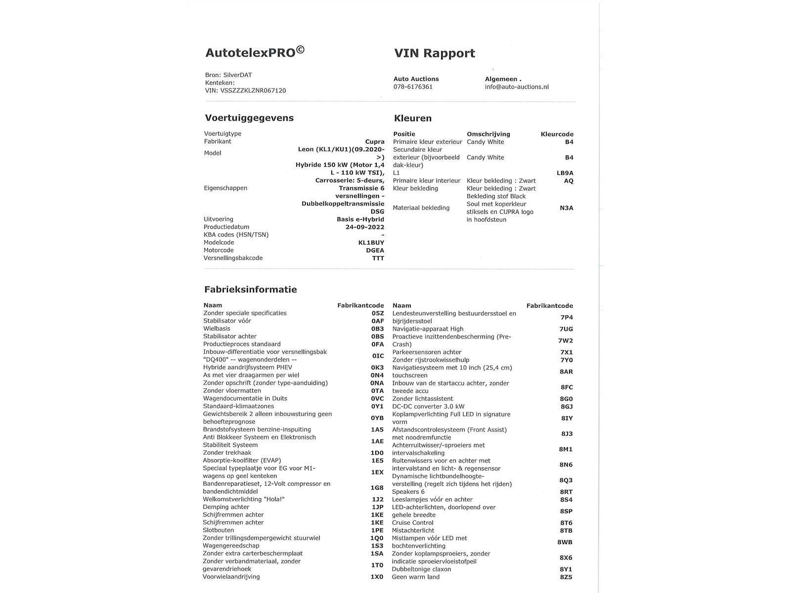 Duitse kenteken papieren. Indien gewenst kunnen wij het gehele import proces voor u verzorgen, RDW invoer, BPM taxatie, Douane afwikkeling, stalling etc. Voor deze auto zijn de totale invoerkosten inclusief de BPM €1.195.- Dus voor €1.195.- boven op uw aankoopprijs verzorgen wij het NL kenteken voor u. (This option is only for Dutch buyers) Voor vragen kunt u mailen naar info@auto-auctions.nl Kenteken: Duitse Kenteken Papieren Merk: Cupra Model: Leon Type: 1.4 eHybrid VZ Afgelezen kilometerstand: 78498km Cilinderinhoud: 1395cc Vermogen (kW): 150kW Brandstof: Hybride Benzine Chassisnummer: VSSZZZKLZNR067120 Datum eerste toelating: 25-11-2022 Vermogen (pk): 204hp Aantal zitplaatsen: 5 Kleur: Candy White Transmissie: Automaat Aantal deuren: 5 Aantal sleutels: 2 Velgmaat: 18 Aantal cilinders: 4 Carrosserie: Hatchback Nationaliteit documenten: Duitse Kenteken Papieren Onderhoudshistorie: Digitaal Volledig Aanwezig Start en rijdt: Ja oplaadkabel : Aanwezig