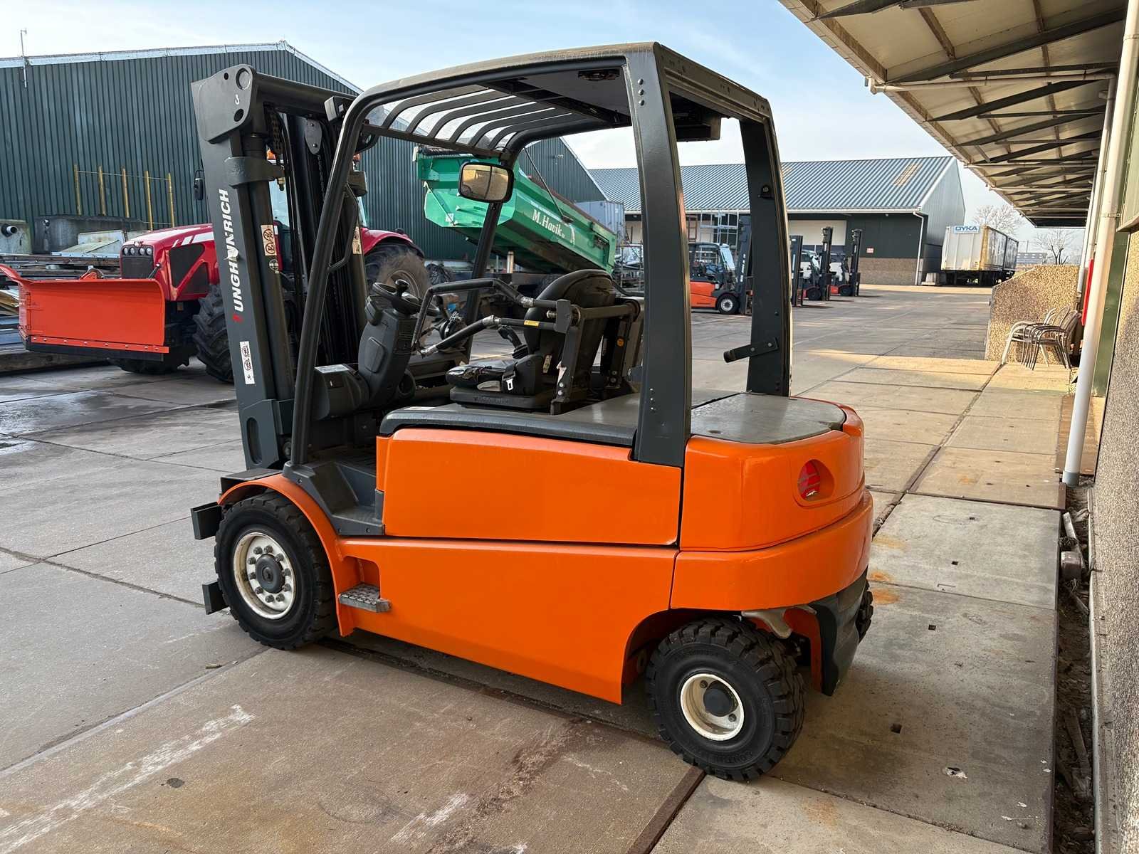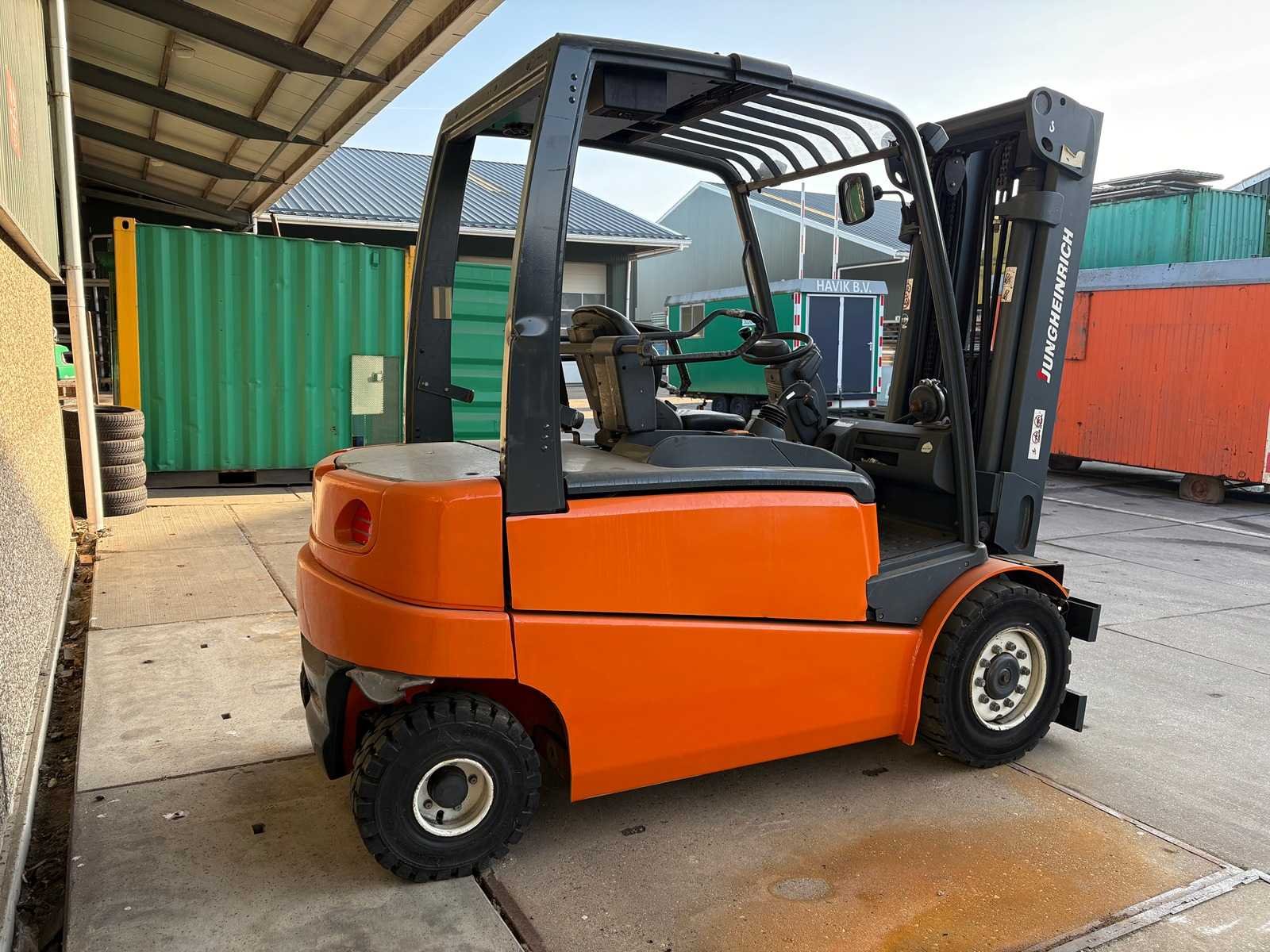 Grammer stoel; Blaupunkt radio; joystickbediening; accu is leeg/mogelijk defect; werking onbekend; zonder oplader; Merk: Jungheinrich Type: EFG 540 Serienummer: FN341130 Brandstof: Elektrisch Aantal wielen: 4 Triple mast: true Hefvermogen: 4000kg Hefhoogte: 4925mm Minimale doorrijhoogte: 2140mm Totale afmeting L: 2800mm Totale afmeting Breedte: 1350mm Totale afmeting Hoogte: 2140mm