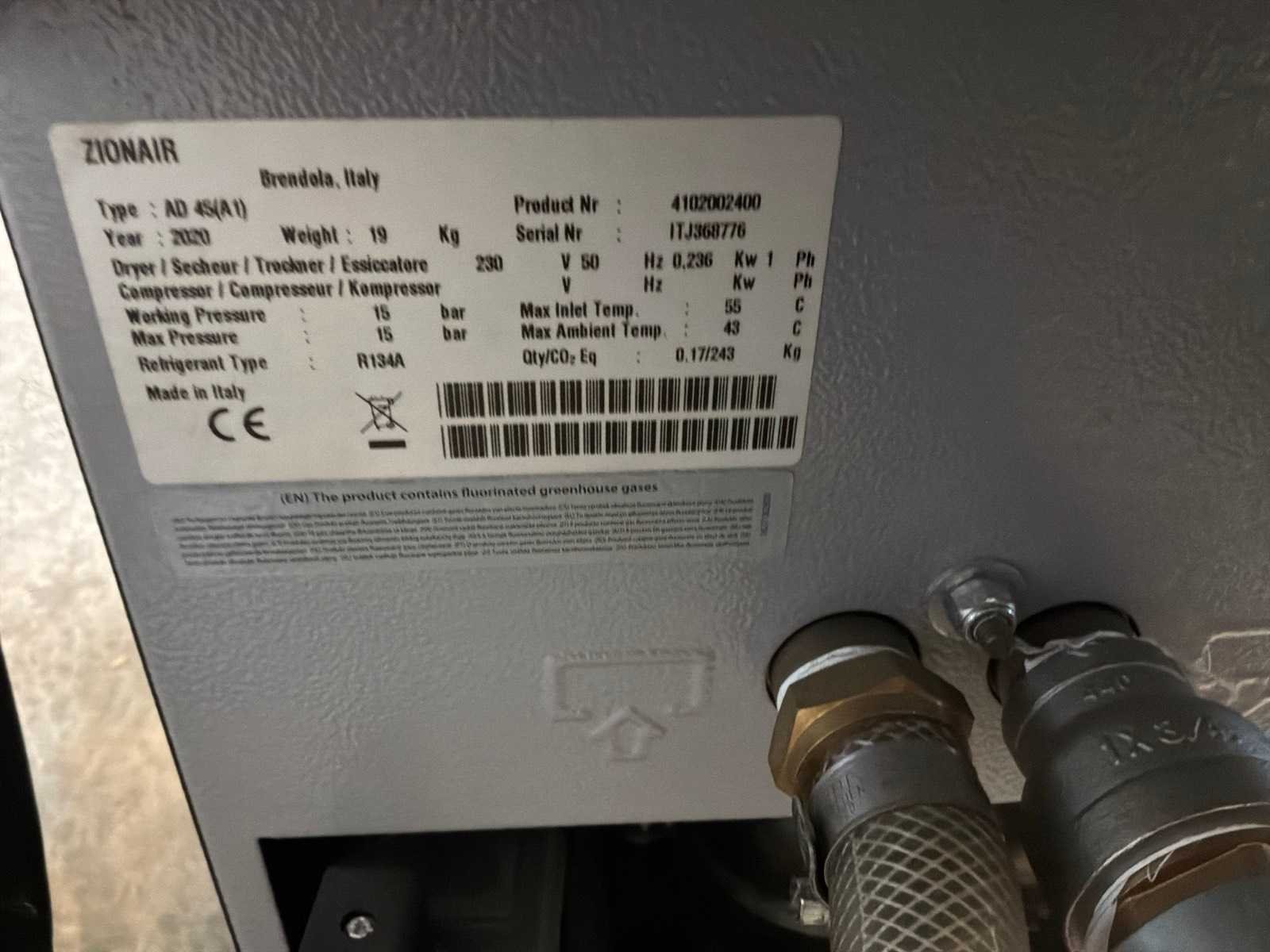 Waaronder: “Zionair” luchtdroger type AD 45, yom 2020, 15 bar werkdruk. Merk: Airmec Type: FS6100 Capaciteit.: 10bar Luchtstroom: 600l/min Vermogen: 4kW Buffertank inhoud: 300l Afgelezen urenstand: 315hr Luchtdroger: true Aansluiting: 400V Totale afmeting L: 650mm Totale afmeting Breedte: 1700mm Totale afmeting Hoogte: 1300mm