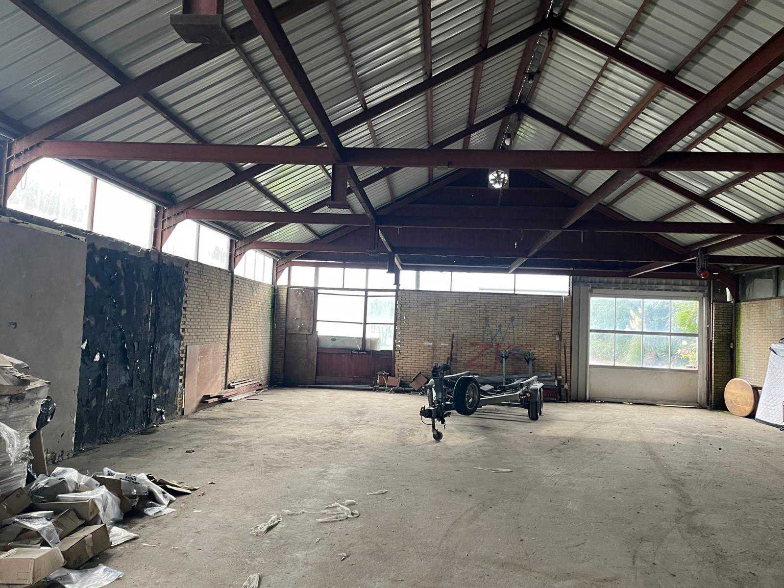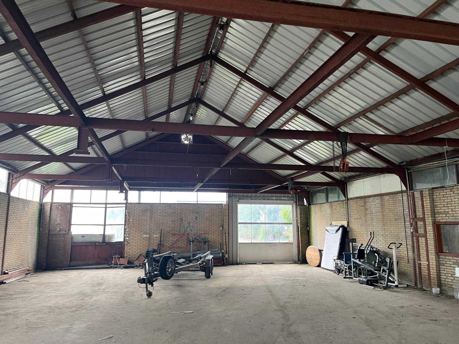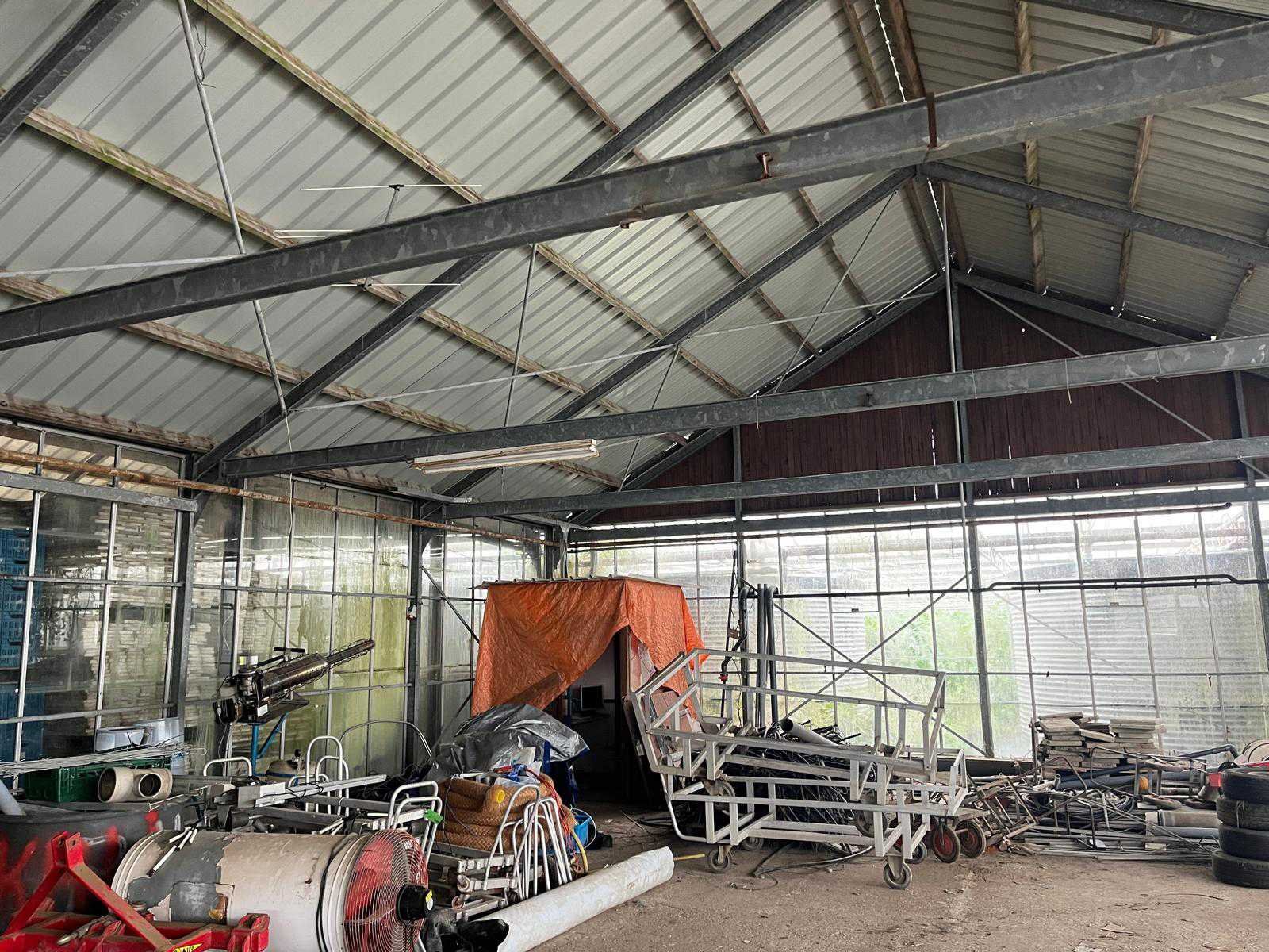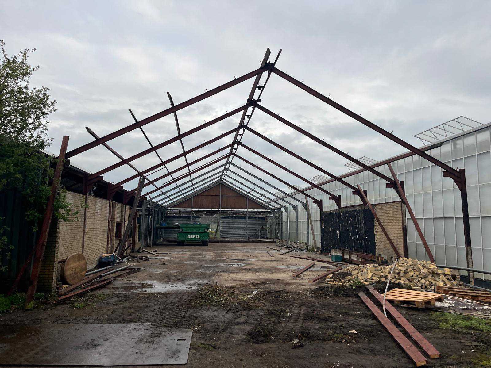 Breedte ca 12000mm; lengte ca 30000mm; poothoogte ca 3400mm; bestaande uit staanders en spanten; houten dakgordingen; stalen damwand profiel platen(voor het dak) staanders en spanten zijn IPE staal; constructie is reeds gedemonteerd en transport klaar gemaakt