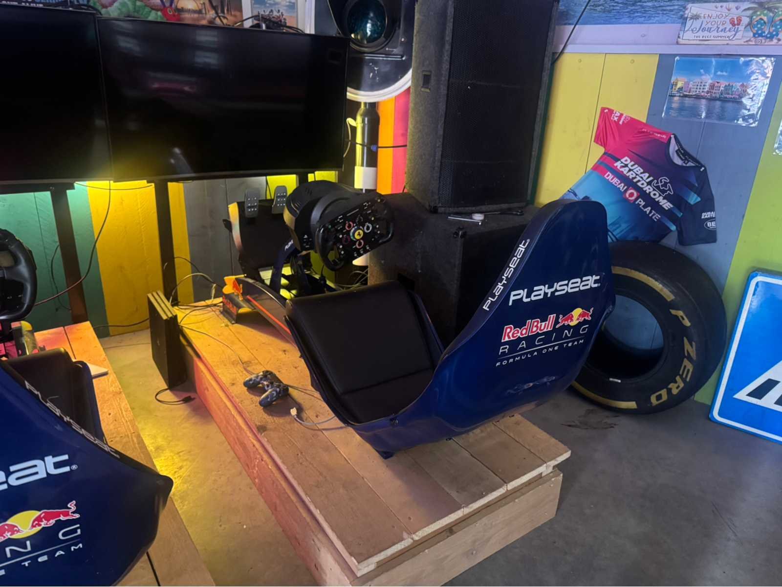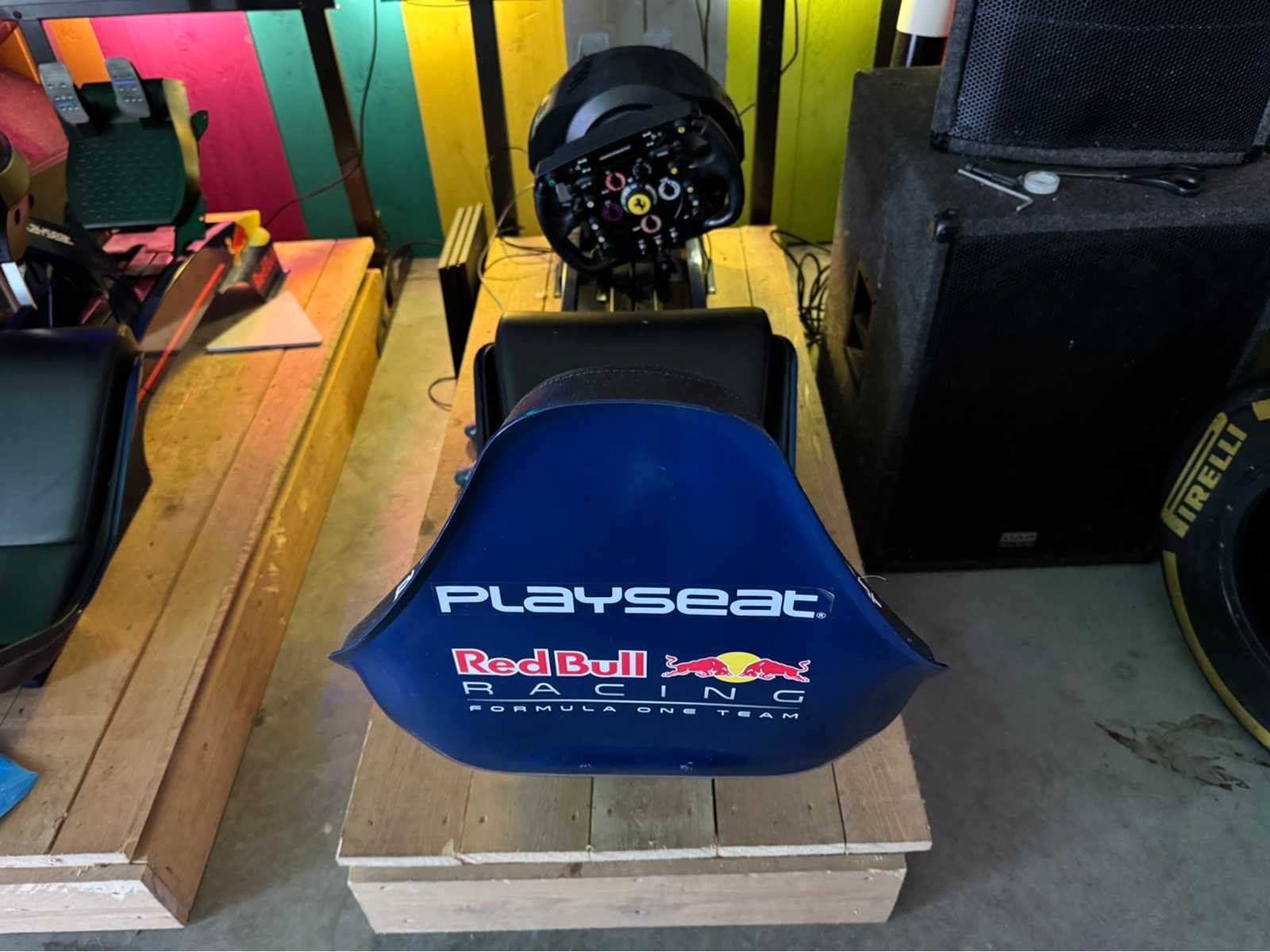 Play Seat; red bull uitvoering; voorzien van Ferrari race stuur; inclusief curved tv scherm; PlayStation 4 spelcomputer; controller; houten ophoging; werking onbekend