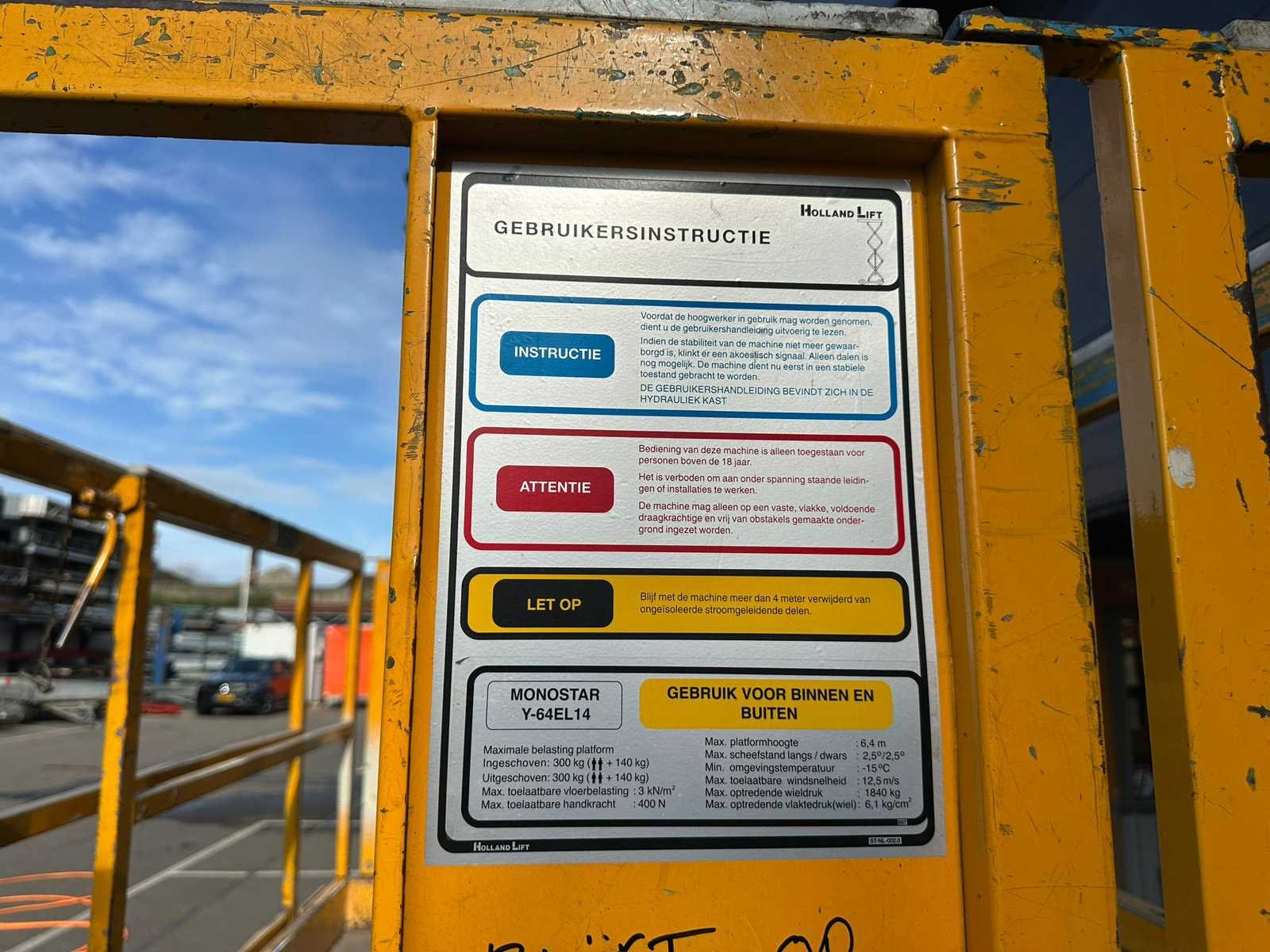 Maximale hoogte ca 6400mm; kan direct ingezet worden Merk: Holland lift Type: Monostar y64el14 Bouwjaar: 1994 Elektrisch: true Schaarhoogwerker: true
