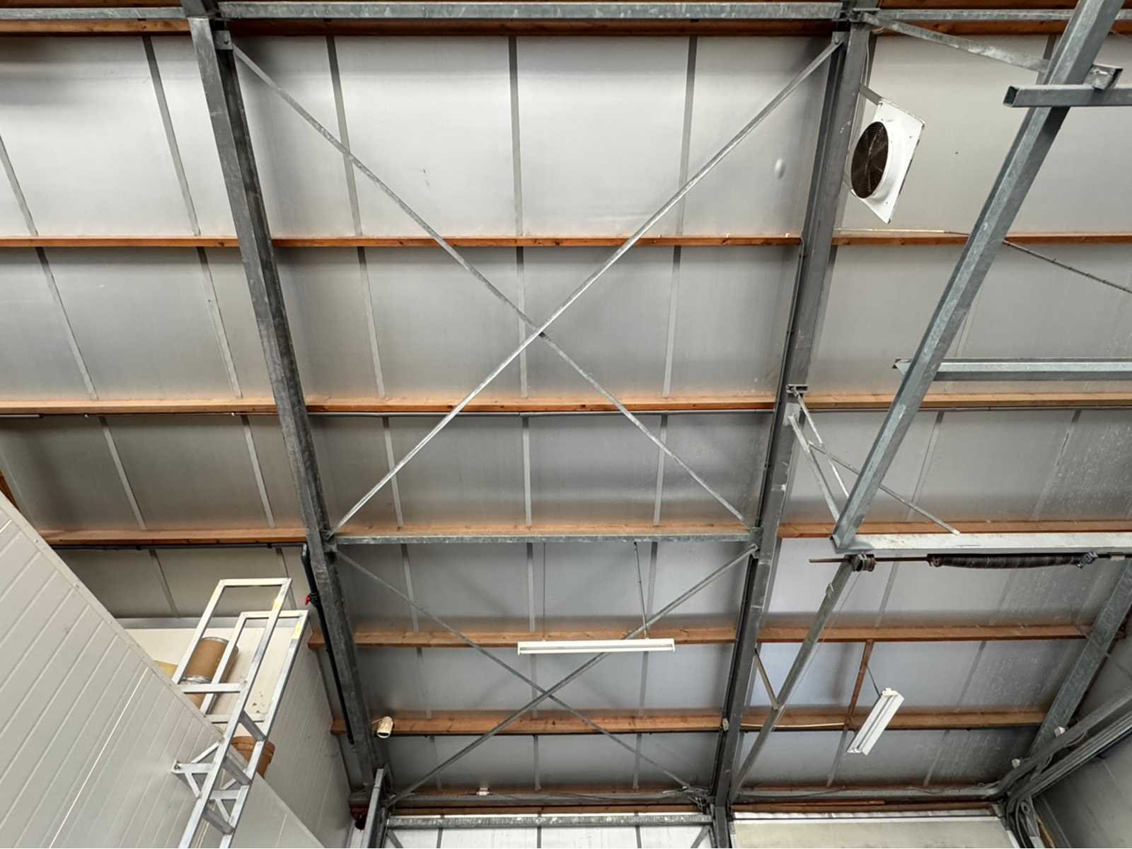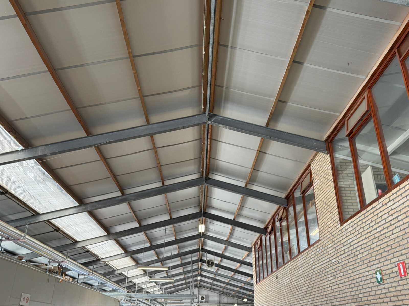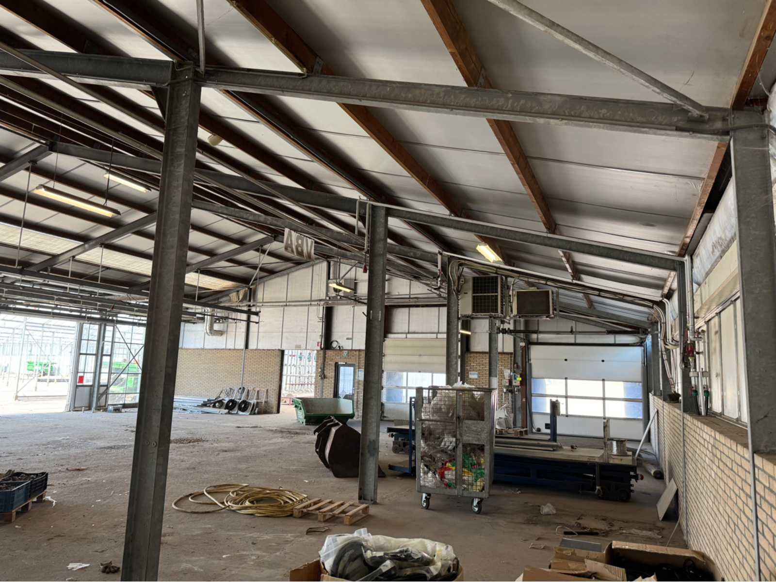 Gegalvaniseerde staalconstructie; staanders en spanten zijn IPE 240; deze constructie bestaat uit; staanders, spanten, goten, houten dak gordingen, dupanel isolatie platen voor het dak; 4 stuks overhead deuren; poothoogte ca 4300mm; breedte ca 16000mm; lengte ca 75000mm; constructie wordt door verkoper gedemonteerd en transport klaar gemaakt; bezichtiging en ophalen alleen op afspraak; LET OP beschikbaar ca eind Mei; ivm demontage; tevens zit er een kleine aanbouw bevestigd aan deze constructie die ook inclusief is; is eenvoudig te demonteren dus gewoon bruikbaar Materiaal: Hogenoordweg Totaal oppervlakte: 1200m² Goot hoogte: 4300mm Totale afmeting L: 75000mm Totale afmeting Breedte: 16000mm