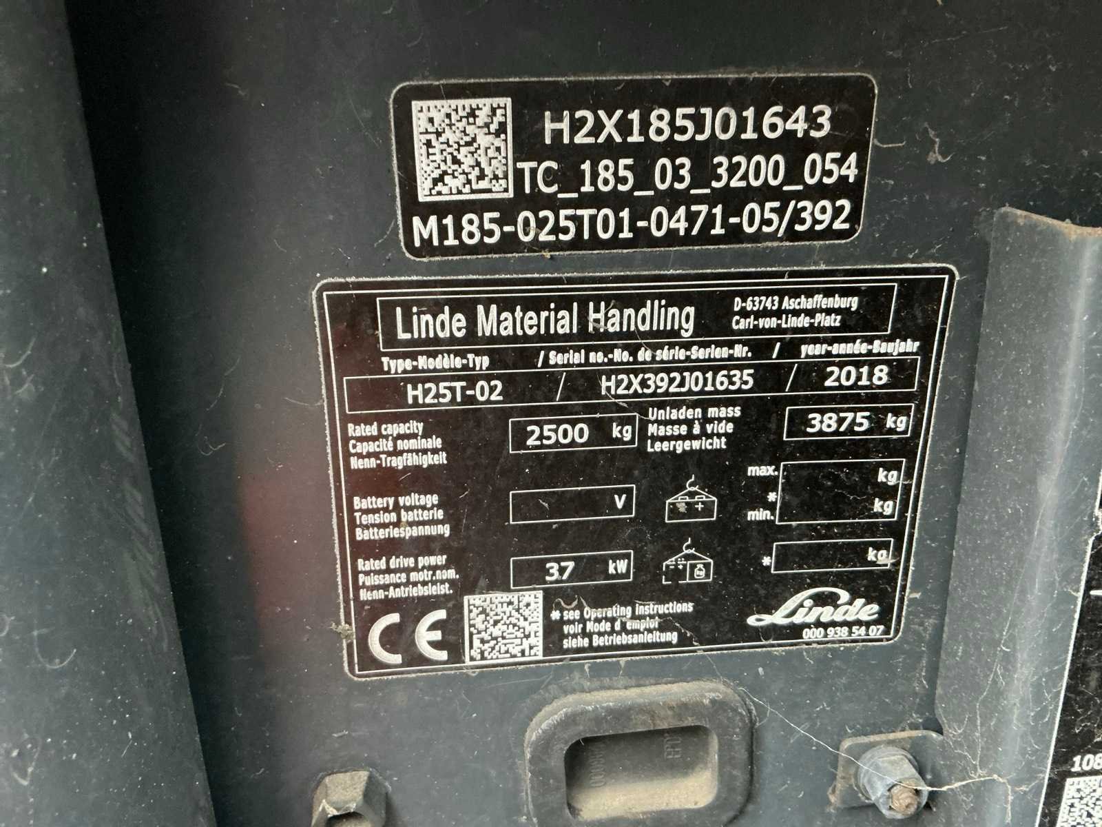Lepels 1200mm, lepelbord 1100mm, triplex mast, side shift, free lift, led werkverlichting, trekoog met pin 25mm, max hefhoogte 4400mm, max hefvermogen 2500kg Merk: Linde Type: H25T-02 EVO Bouwjaar: 2018 Serienummer: H2X392J01635 Brandstof: LPG Mast: Triple Soort band: Volrubber banden Aantal wielen: 4 Afgelezen urenstand: 14865 Free-lift: true Side-shift: true Triple mast: true Eigen gewicht: 3875kg Hefvermogen: 2500kg Lepellengte: 1200mm Max. hefhoogte: 4400mm Vol rubber banden: true Minimale doorrijhoogte: 2300mm Totale afmeting L: 3900mm Totale afmeting Breedte: 1200mm Totale afmeting Hoogte: 2200mm