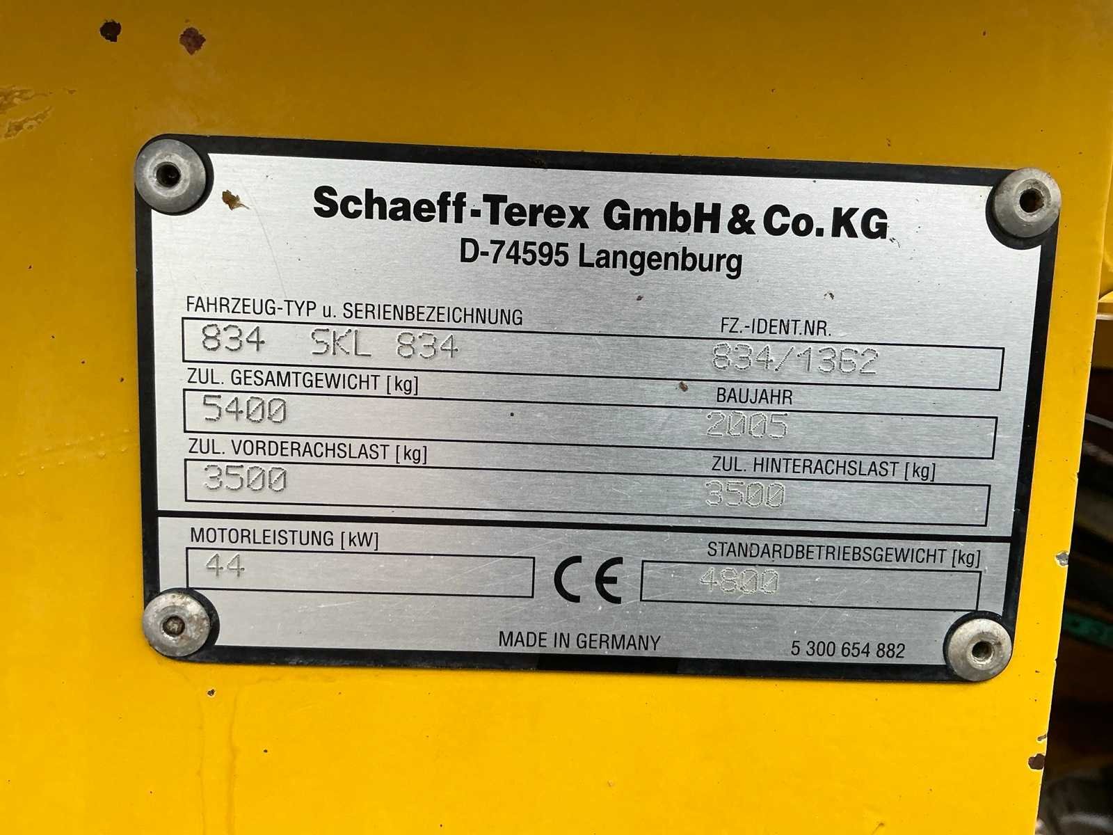 Let op; enkel achterwiel aangedreven, Hydraulische wissel, 3e+4e functie voorbereid, werkverlichting, trekoog met pin 30mm,verwarming, 2e rijsnelheid Merk: Schaeff-Terex Type: SKL 834 Bouwjaar: 2005 Serienummer: 834/1362 Merk motor: Deutz Kenteken: TSK-86-R Motorvermogen (kW): 44kW Aantal cilinders: 4 Brandstof: diesel Bedrijfsgewicht: 4800kg Bandenmaat: 405/70 R18 Cabine: true Afgelezen urenstand: 9845 Eigen gewicht: 4800kg Totale afmeting L: 5000mm Totale afmeting Breedte: 1850mm Totale afmeting Hoogte: 2700mm