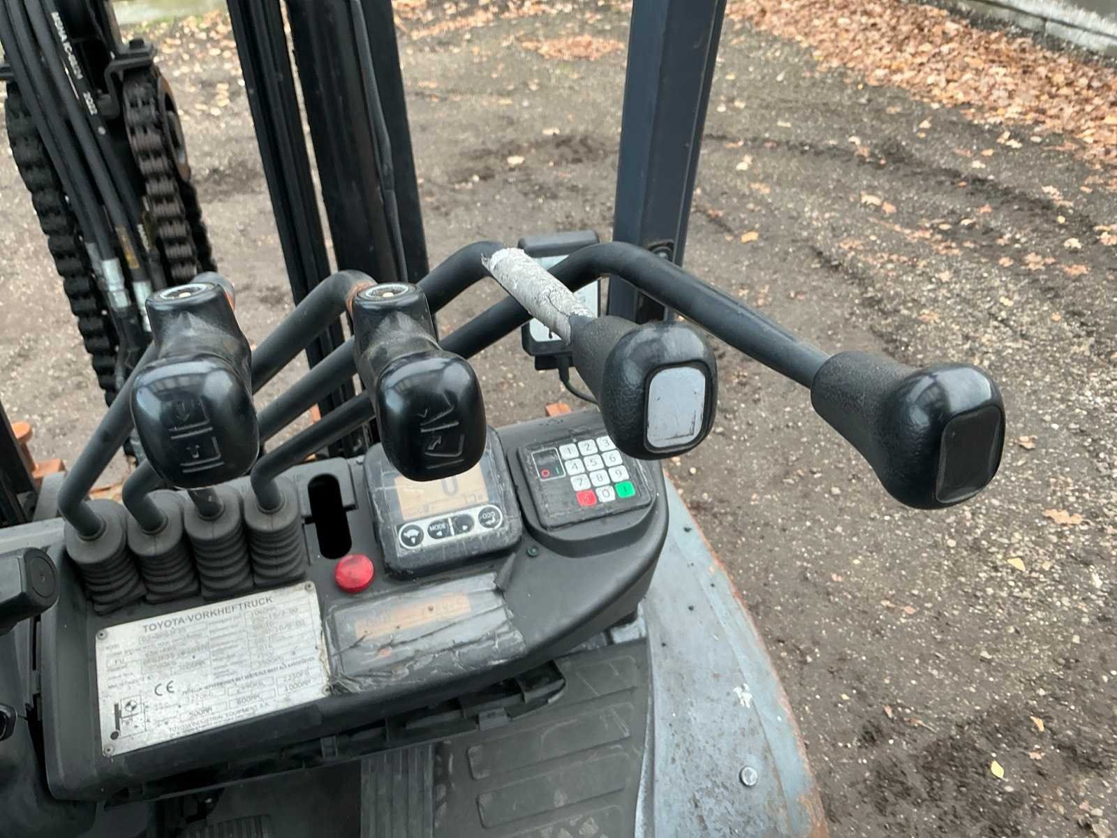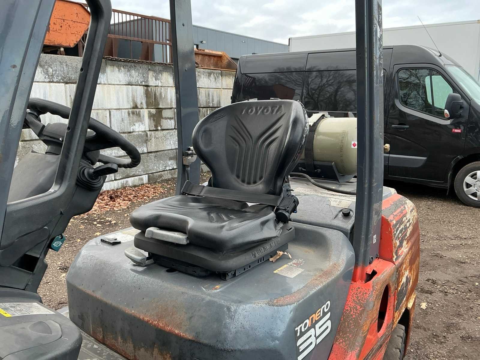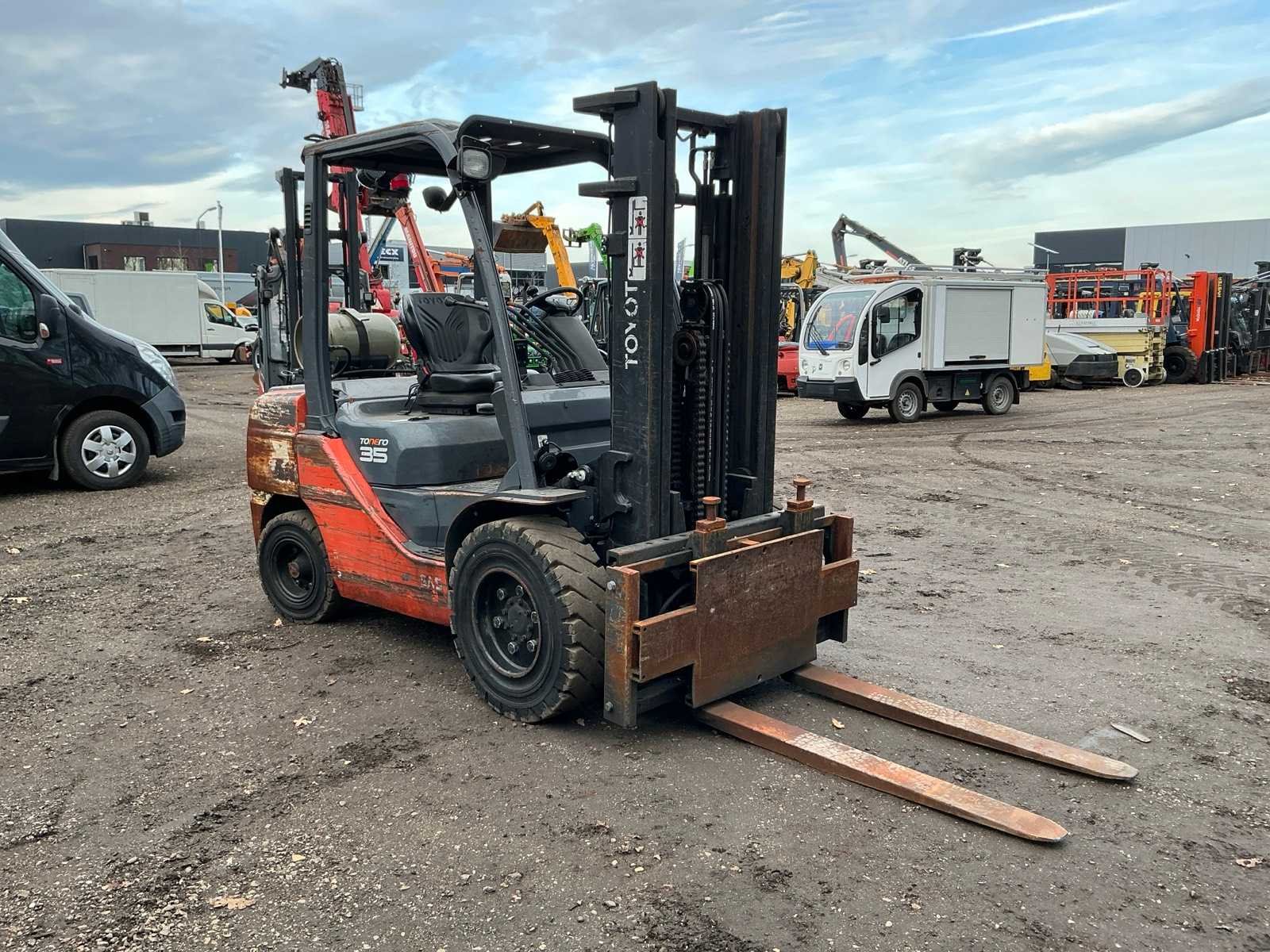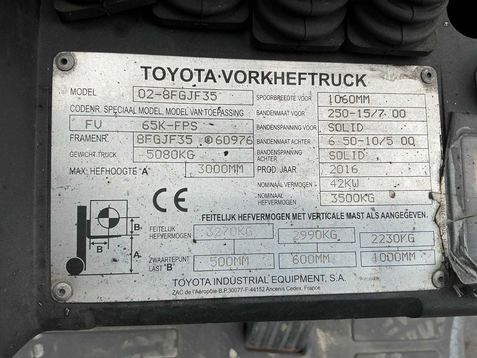 Lepels 1200mm, lepelbord 1200mm, free lift, Side shift, triplex mast, werkverlichting trekoog, max hefhoogte 3000mm, max hefvermogen 3500kg Merk: Toyota Type: 02-8FGJF35 Bouwjaar: 2016 Serienummer: 8FGJF3560976 Brandstof: LPG Mast: Duplex Soort band: Volrubber banden Aantal wielen: 4 Afgelezen urenstand: 10927 Free-lift: true Side-shift: true Hydraulisch verstelbare lepels: true Triple mast: true Eigen gewicht: 5080kg Hefvermogen: 3500kg Lepellengte: 1200mm Max. hefhoogte: 3000mm Vol rubber banden: true Minimale doorrijhoogte: 2200mm Totale afmeting L: 4150mm Totale afmeting Breedte: 1270mm Totale afmeting Hoogte: 2200mm LPG: true