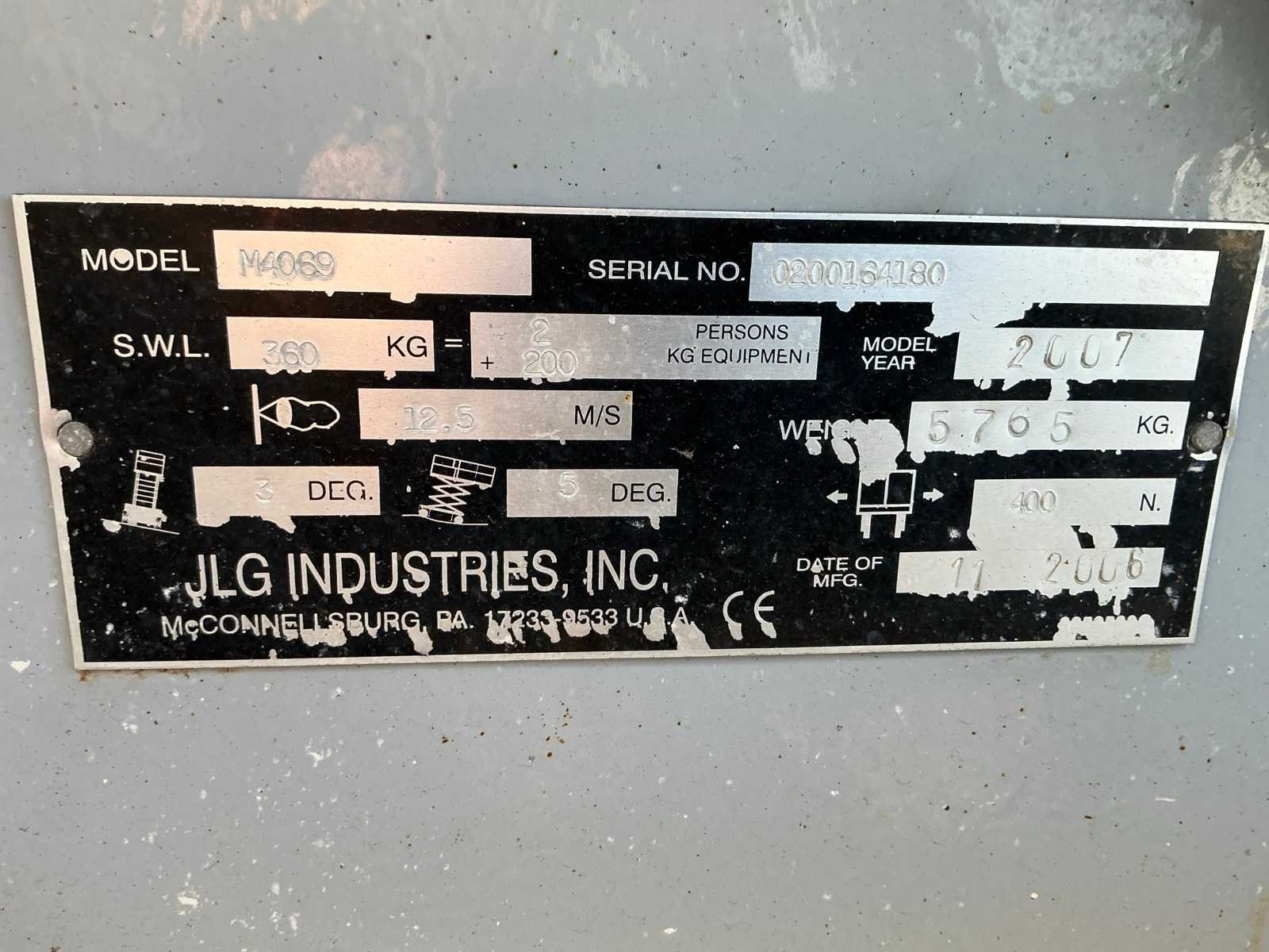 4WD, asstabilisatie, ingebouwde lader, 48V accupakket, neerklapbare beugels, uitschuifbaar platform 1000mm, , max hefhoogte 14190mm, max hefvermogen 360kg Merk: JLG Type: M4069 Bouwjaar: 2006 Serienummer: 0200164180 Diesel: true Elektrisch: true Motorvermogen (kW): 48kW Schaarhoogwerker: true Werkhoogte: 14190mm Horizontale rijkwijdte: 900mm Plateau afm. l: 2900mm Plateau afm. b: 1650mm Platform capaciteit: 360kg Accu lader: true Afgelezen urenstand: 457 Eigen gewicht: 5765kg Totale afmeting L: 3700mm Totale afmeting Breedte: 1750mm Totale afmeting Hoogte: 2850mm