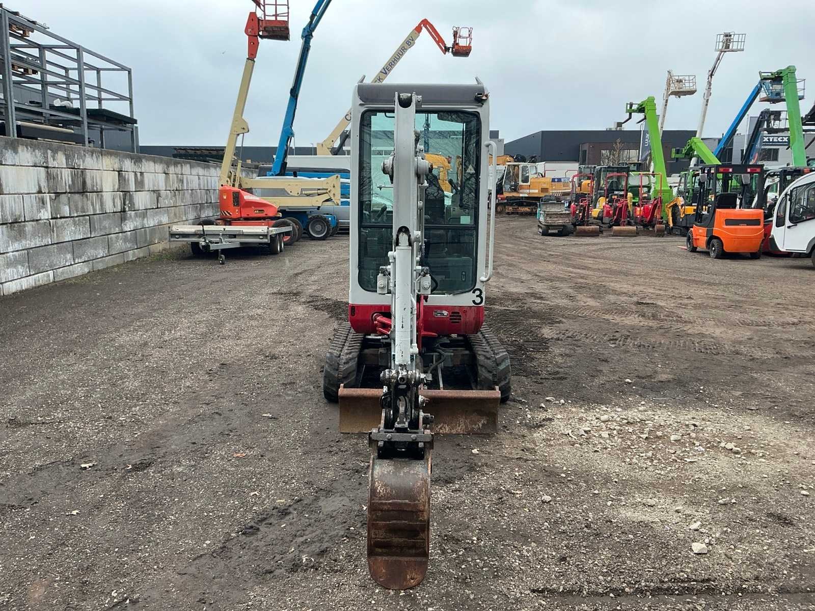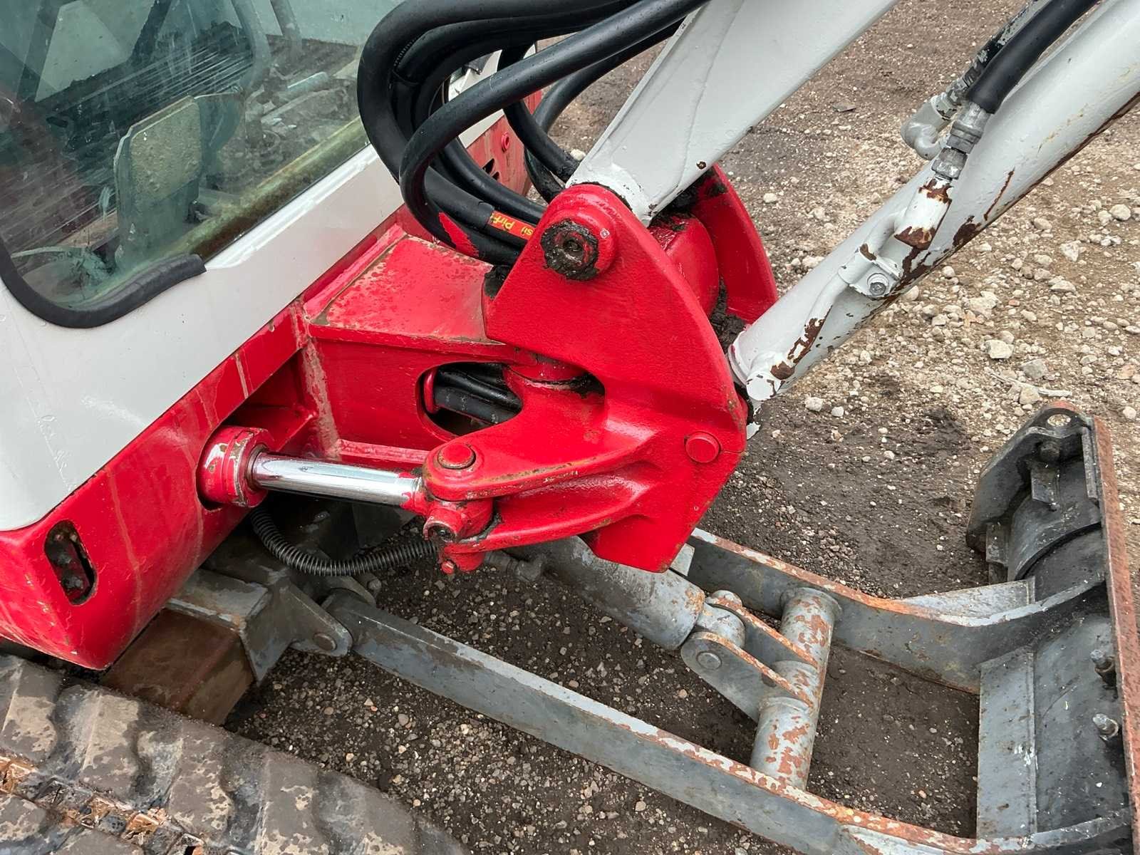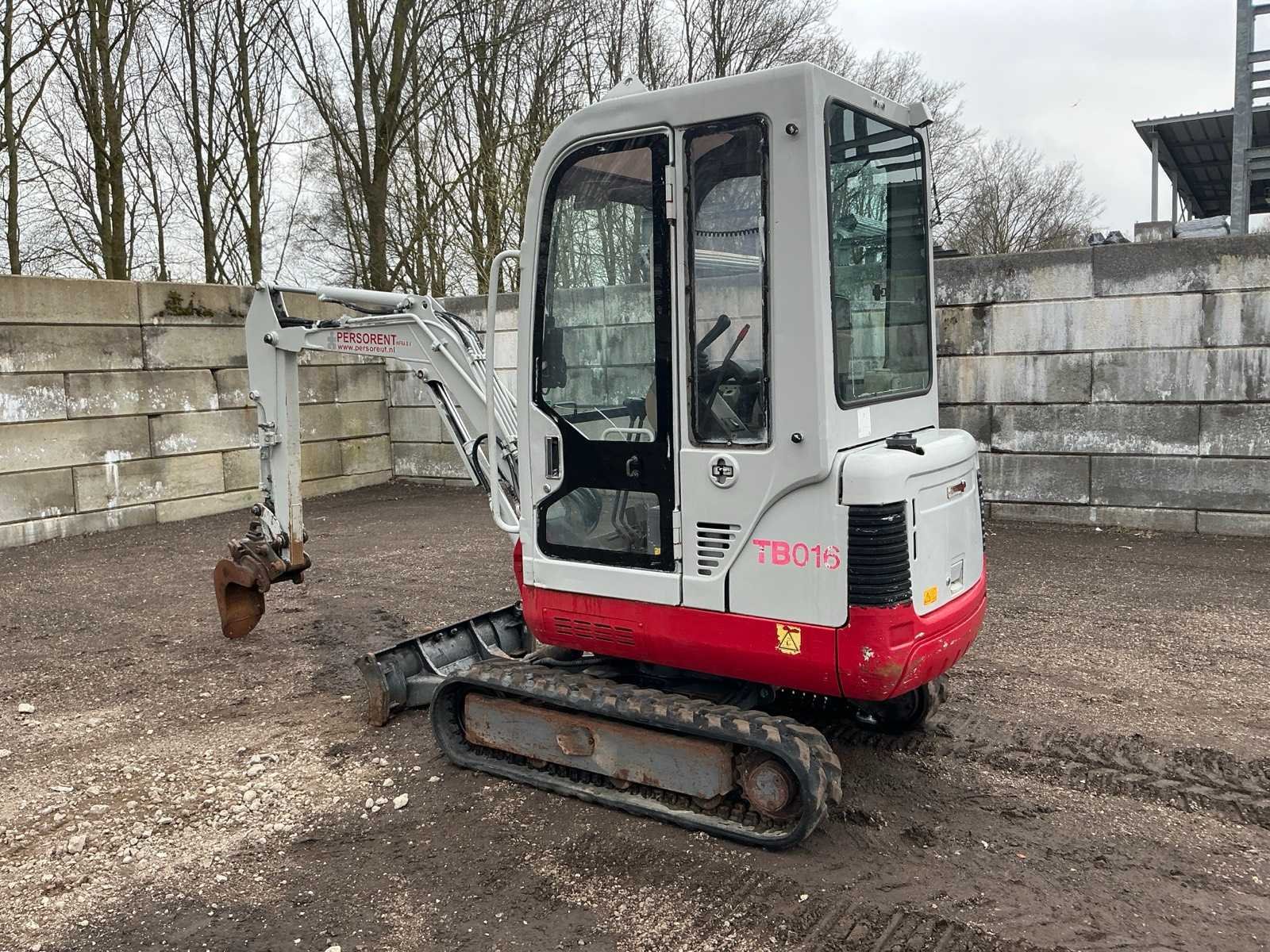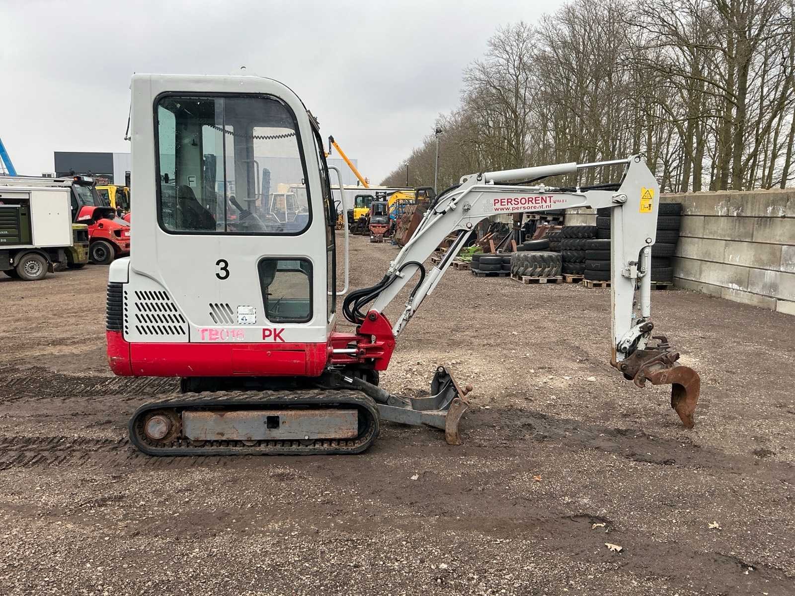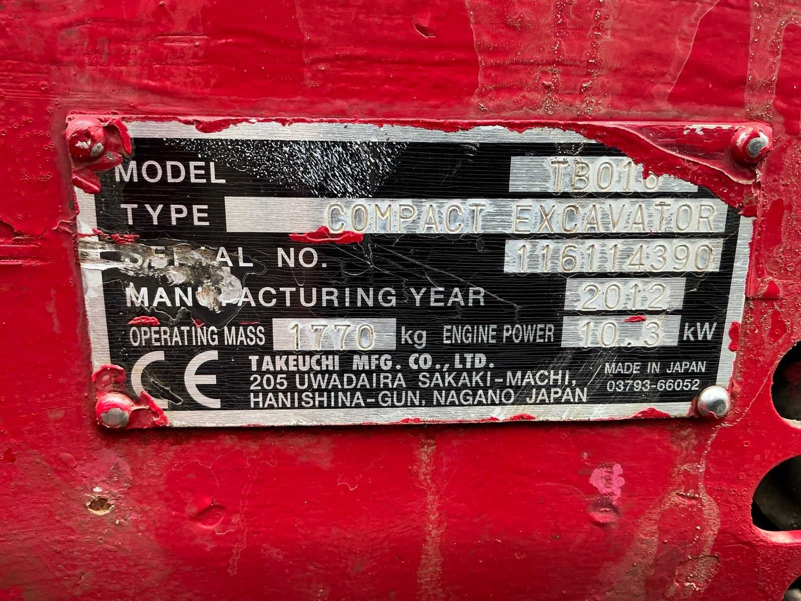 Banaan bak 230mm, hydraulische wissel, 3e functie voorbereid, blad 980mm met trekhaak , verstelbaar rijwerk 1000/1300mm, 2e rijsnelheid, verwarming, radio, Merk: Takeuchi Type: TB016 Bouwjaar: 2012 Serienummer: 116114390 Merk motor: Yanmar Motorvermogen (kW): 10.3kW Aantal cilinders: 3 Brandstof: Diesel Bedrijfsgewicht: 1770kg Inclusief graafbak: Yes Graafbak afm. b: 230mm Rups breedte: 230mm Afgelezen urenstand: 8137 Eigen gewicht: 1770kg Totale afmeting L: 3500mm Totale afmeting Breedte: 1300mm Totale afmeting Hoogte: 2400mm