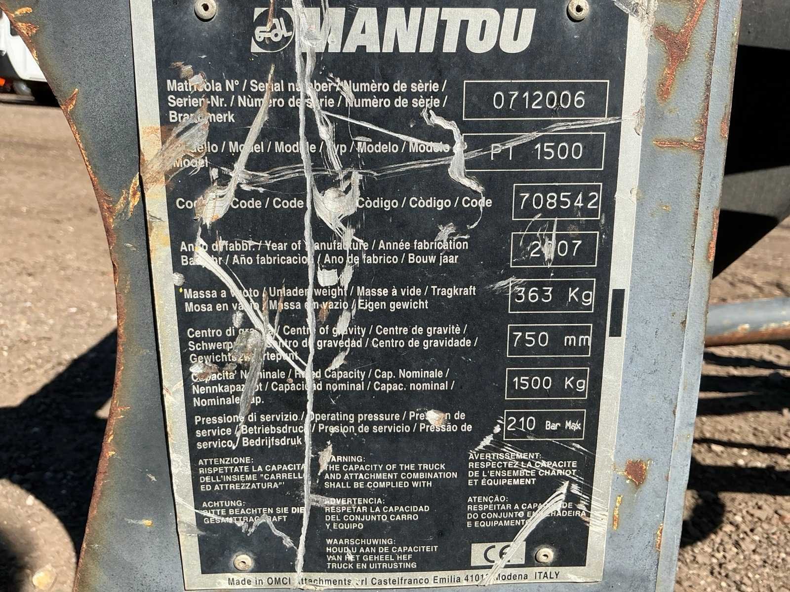Passend Manitou, hefvermogen 1500kg Merk: Manitou Type: PT1500 Bouwjaar: 2007 Serienummer: 0712006 Eigen gewicht: 363kg Totale afmeting L: 3000mm Totale afmeting Breedte: 850mm Totale afmeting Hoogte: 850mm