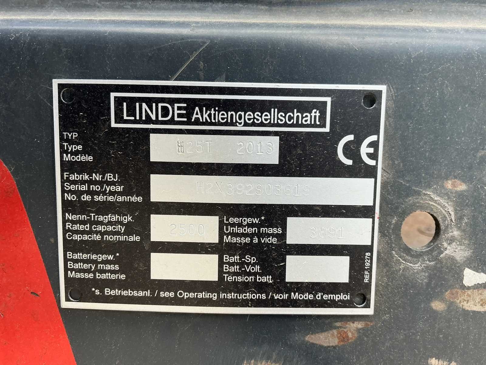 Merk: Linde Type: H25T Bouwjaar: 2013 Brandstof: LPG Aantal wielen: 4 Afgelezen urenstand: 18176.9 Duplex mast: true Vol rubber banden: true LPG: true