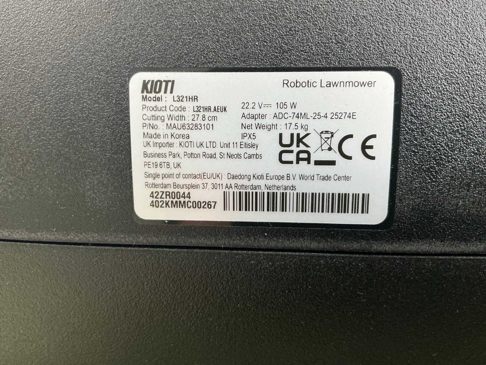 Nieuw in doos, maai oppervlakte 3000m2, maaihoogte instelbaar van 20 tot 90mm, inclusief laadstation, benodigde aansluit materialen, stroom adapter, begrenzing draad, kabelankers, connectors, reserve mesjes, boekwerken, bediening via app mogelijk, Merk: Kioti Type: L321HR Serienummer: KMMC00267 Werkbreedte: 280mm Eigen gewicht: 17.5kg Totale afmeting L: 1000mm Totale afmeting Breedte: 700mm Totale afmeting Hoogte: 600mm