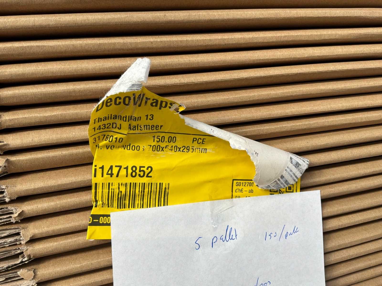 Circa 750 stuks, op 5 pallets. Afmeting h: 310mm Afmeting l: 710mm Afmeting b: 550mm