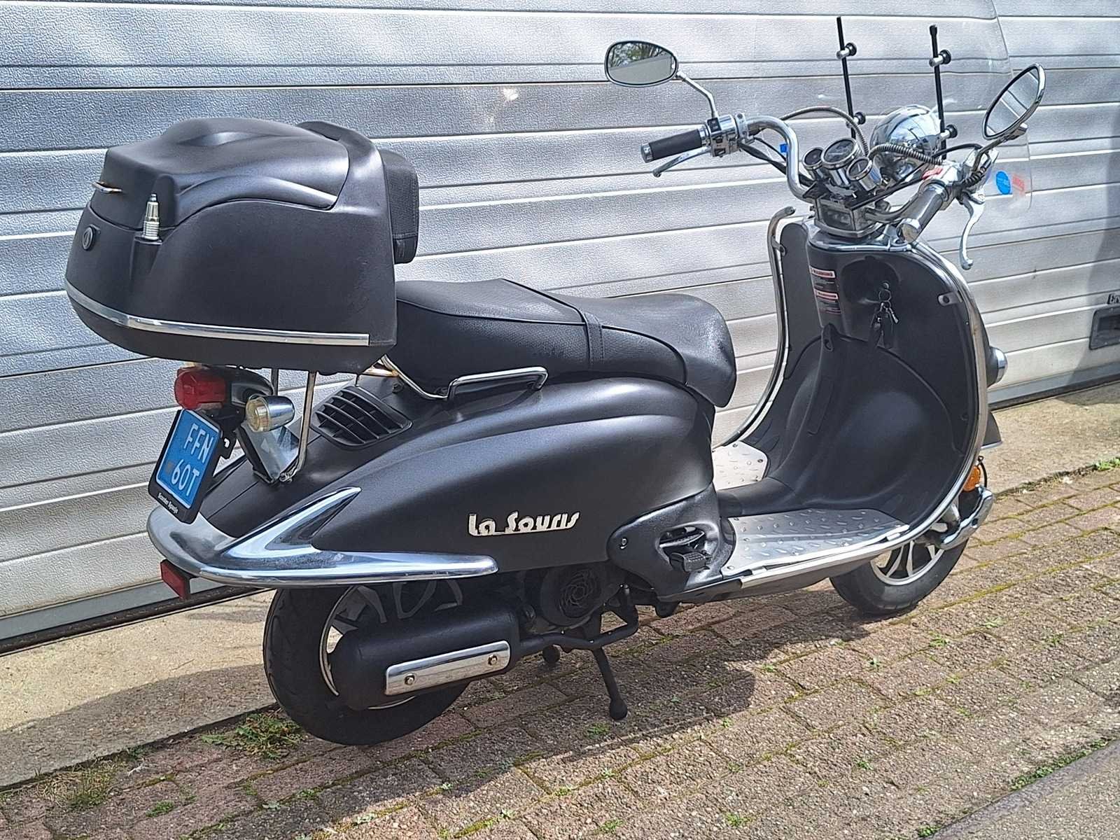 2 sleutels en 2 alarmkastjes voor scooter en 2 sleutels voor topkoffer aanwezig. Accessoires: hoog windscherm en topkoffer. Merk: La Souris Model: 25 km snorscooter 4takt Type: Grande Retro Snelheid: 25km/h Kenteken: FFN60T Datum eerste toelating: 20-01-2021 Bouwjaar: 2021 Kleur: mat zwart Afgelezen kilometerstand: 3593km
