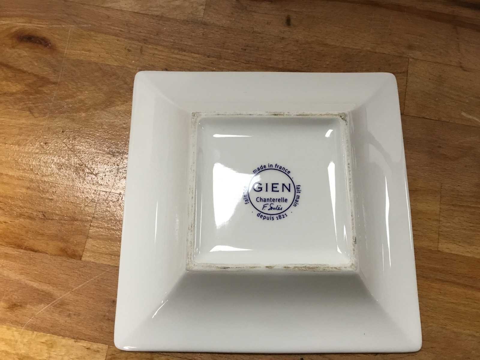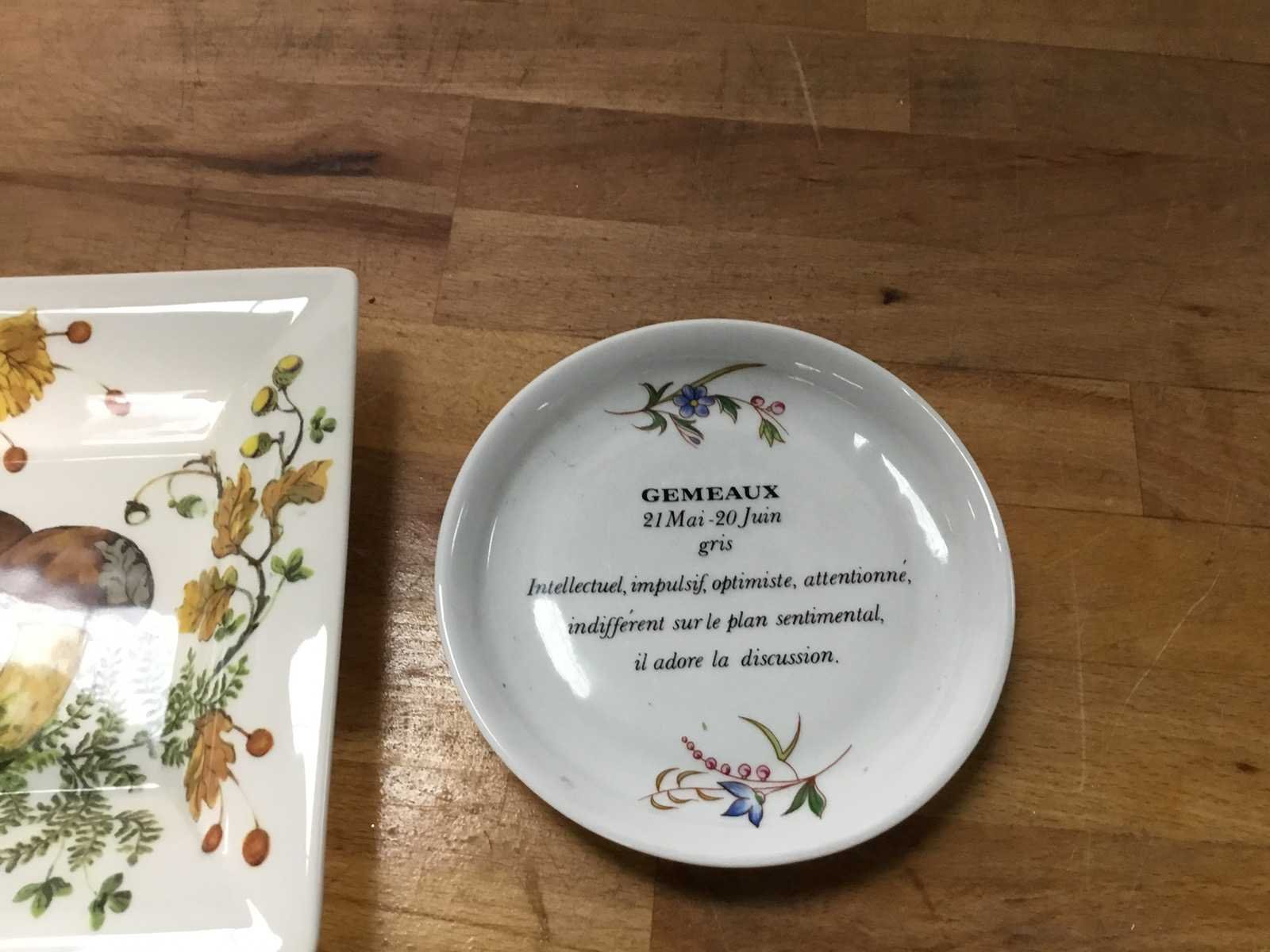 Het vierkante schaal is een Gien Chanterelle snoepschaal, versierd met een gedetailleerd motief van paddenstoelen en herfstbladeren. Gien staat bekend om zijn hoogwaardige Franse aardewerk en dit specifieke patroon is een klassieker voor liefhebbers van herfsttaferelen. Dit decoratieve bordje toont het sterrenbeeld Tweelingen (GEMEAUX) met karakteristieken zoals intellectueel, impulsief en optimistisch. Land: Frankrijk Kunstenaar: Gein chanterelle Datering: 1821 Product type: 2 borden