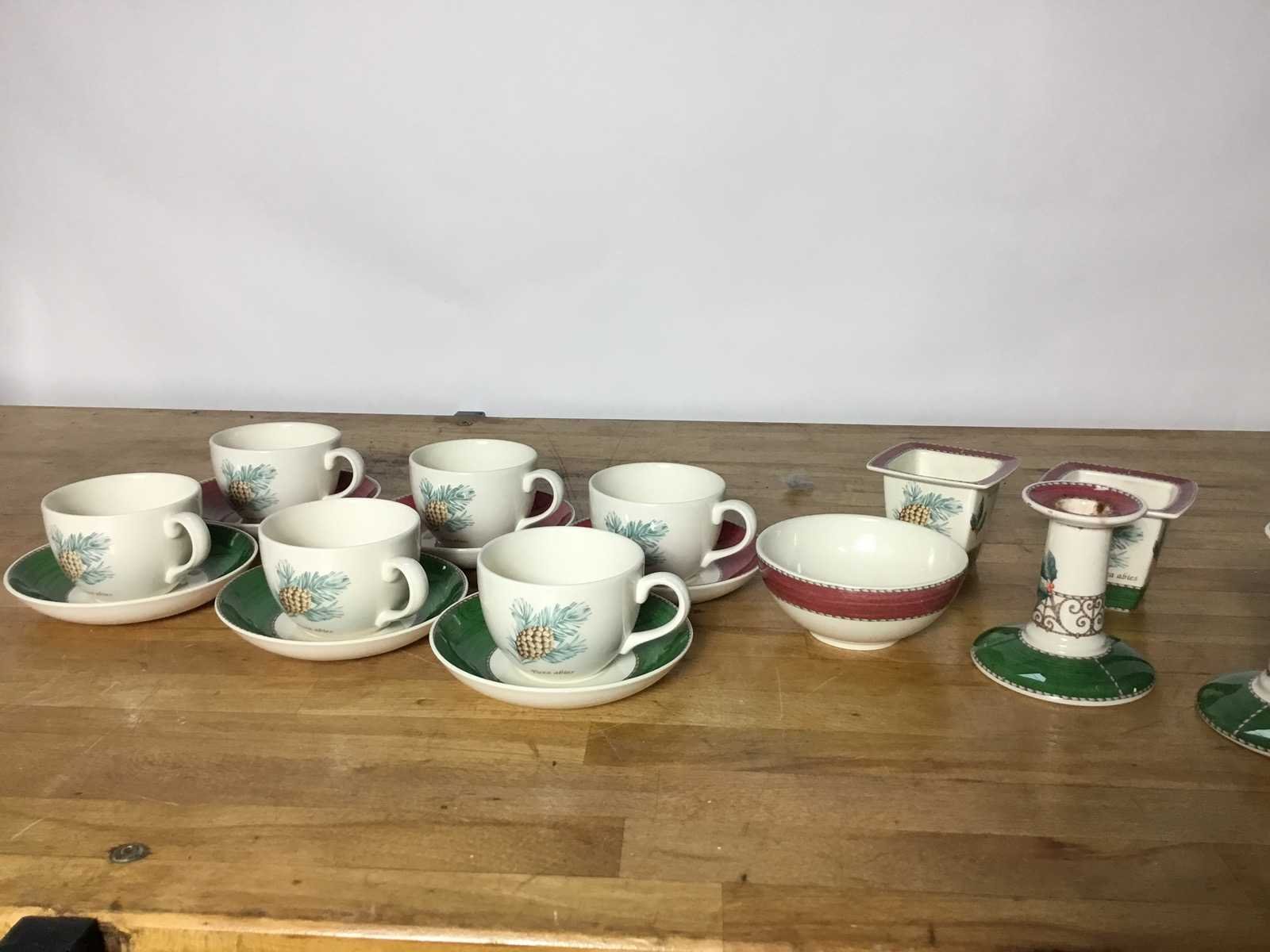 Deze set bestaat uit diverse serviesonderdelen van het merk Wedgwood, specifiek uit de 'Sarah's Garden' lijn, met kerstmotieven zoals dennenappels en hulst. Wedgwood theeservies bestaande uit 6 kop en schotel, suiker en melkbakje, 2 kandelaars en 1 kommetje. Het servies is gemaakt van fijn aardewerk of porselein, bekend om zijn kwaliteit en vakmanschap. Wedgwood is wereldwijd bekend om het produceren van hoogwaardig fijn porselein (fine bone china) en aardewerk Land: Engeland Kunstenaar: Wedgwood Model: Sarahs garden Product type: Thee servies