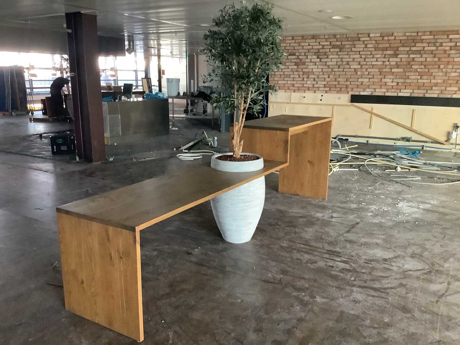 Let op; bloempot met plant niet inbegrepen. gat in de tafel is 52 cm rond. Tafel met verlaagt gedeelte van 290x70x76 cm. gedemonteerd zie foto's Hout: true Totale afmeting L: 430cm Totale afmeting Breedte: 70cm Totale afmeting Hoogte: 110cm