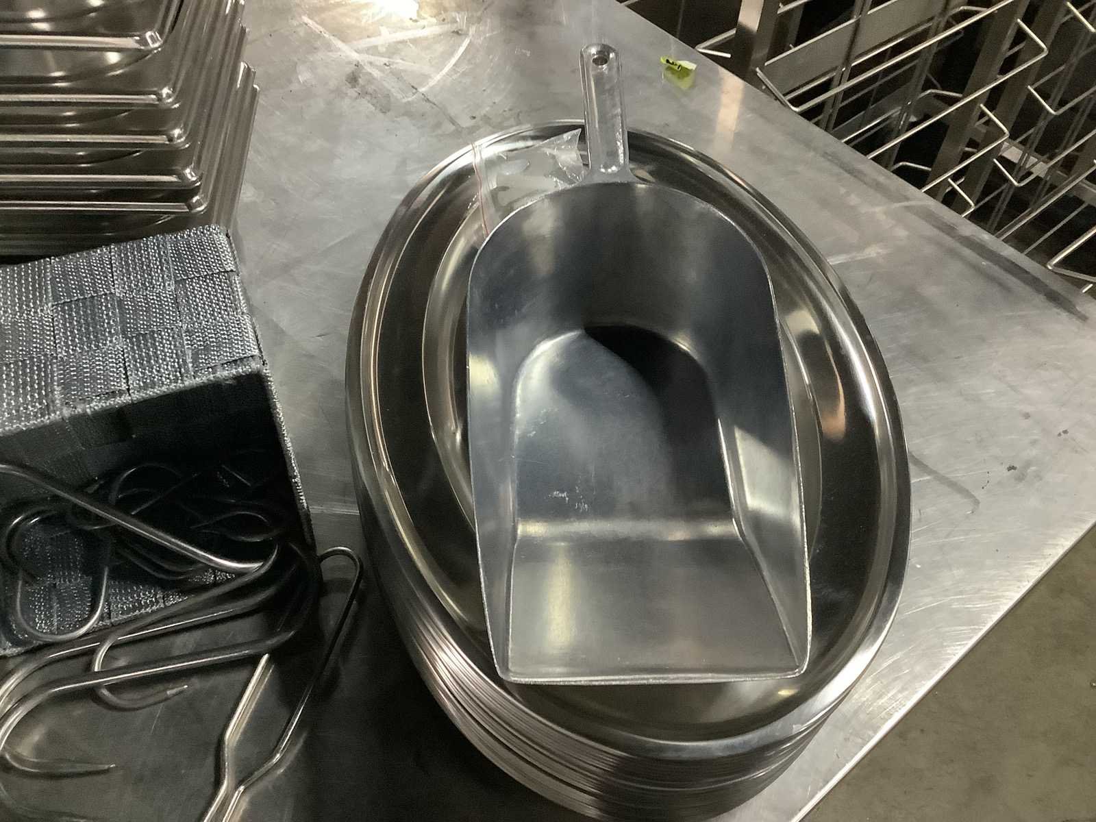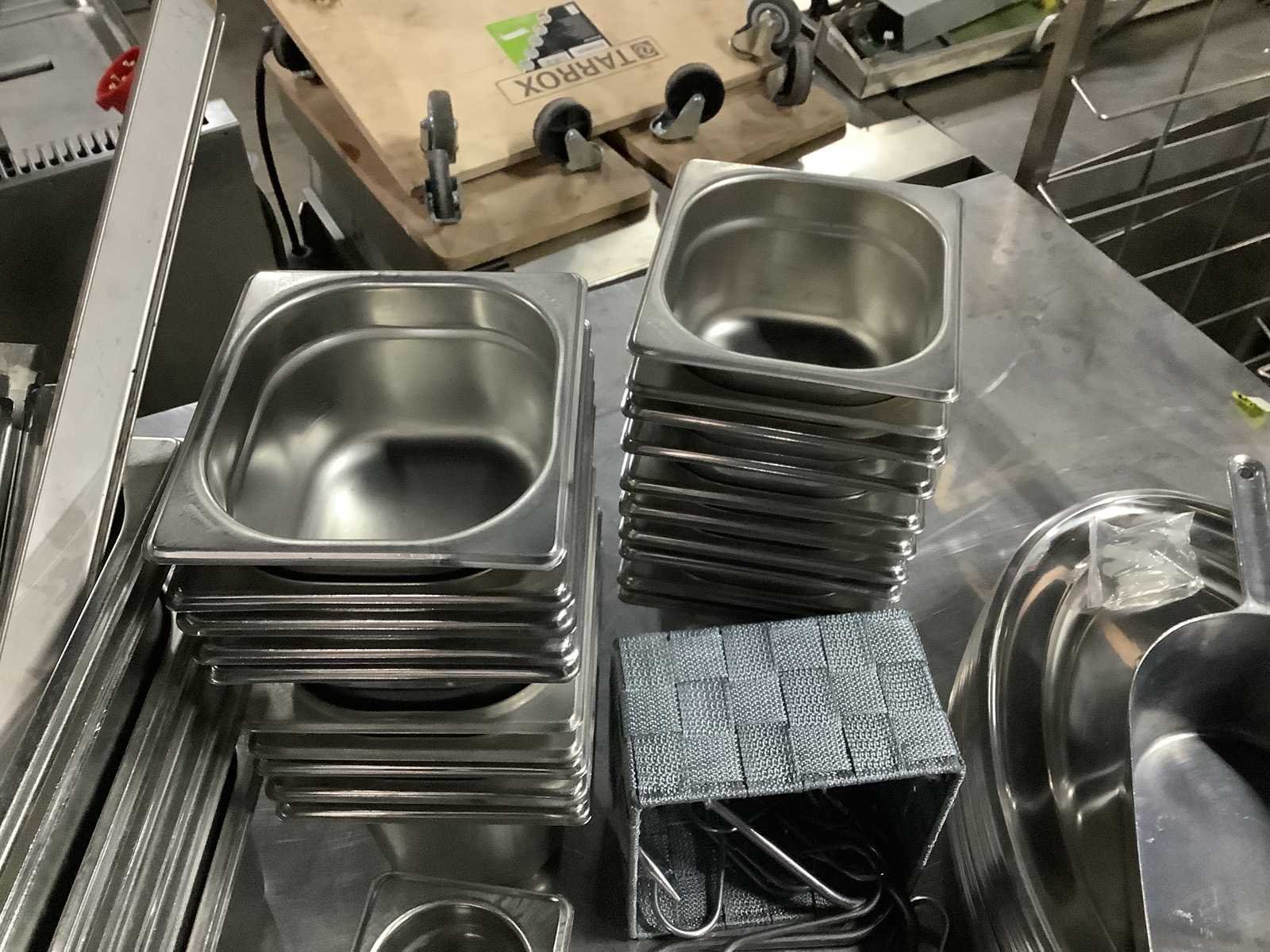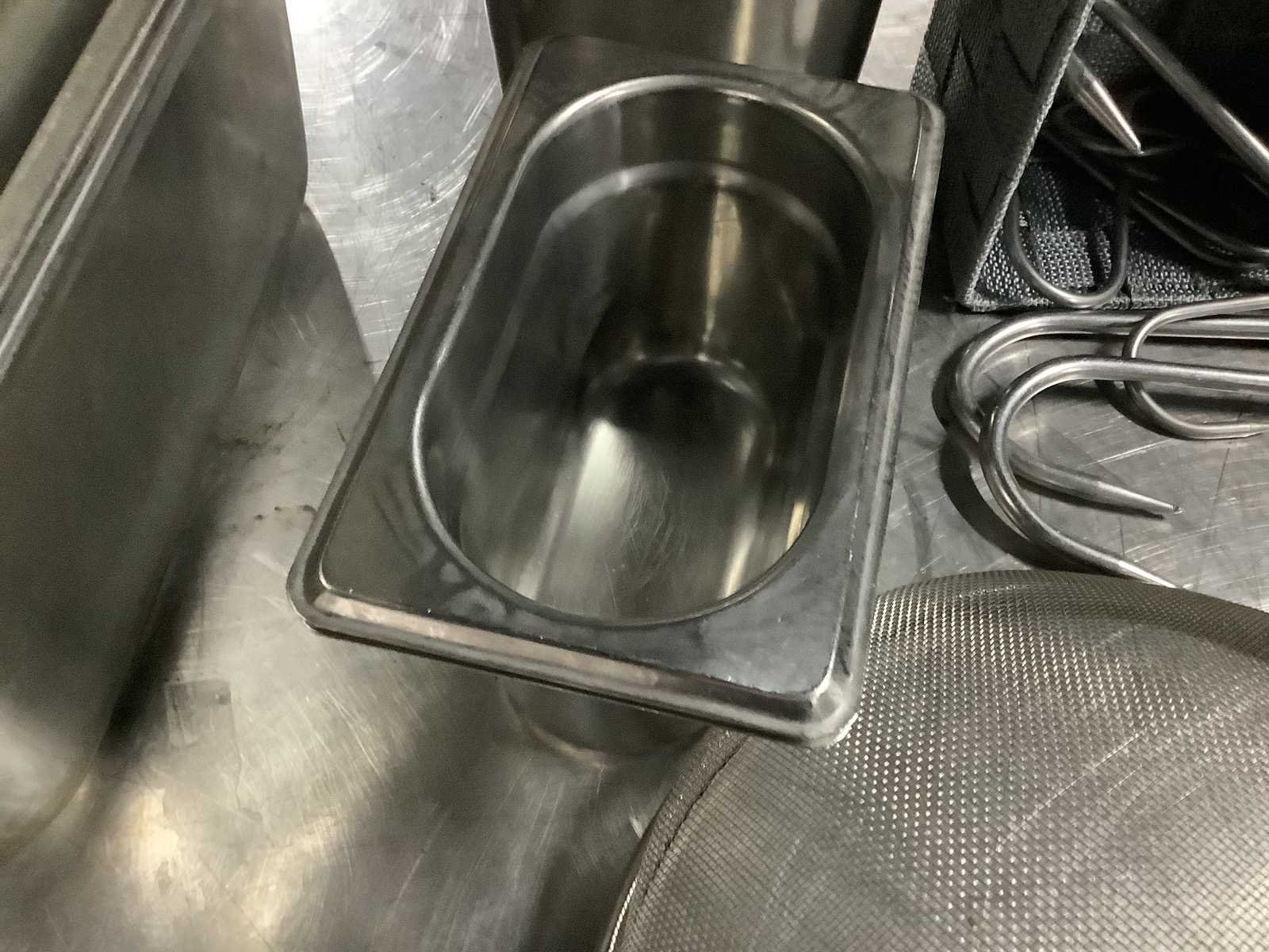 20x 1/6 GN verschillende hoogtes 1x 1/9 GN 7x 1/3 GN verschillende hoogtes 24x serveerplateau (46x29cm) Tussenliggers 9x vleeshaak 1x bolzeef 1x schep Materiaal: RVS
