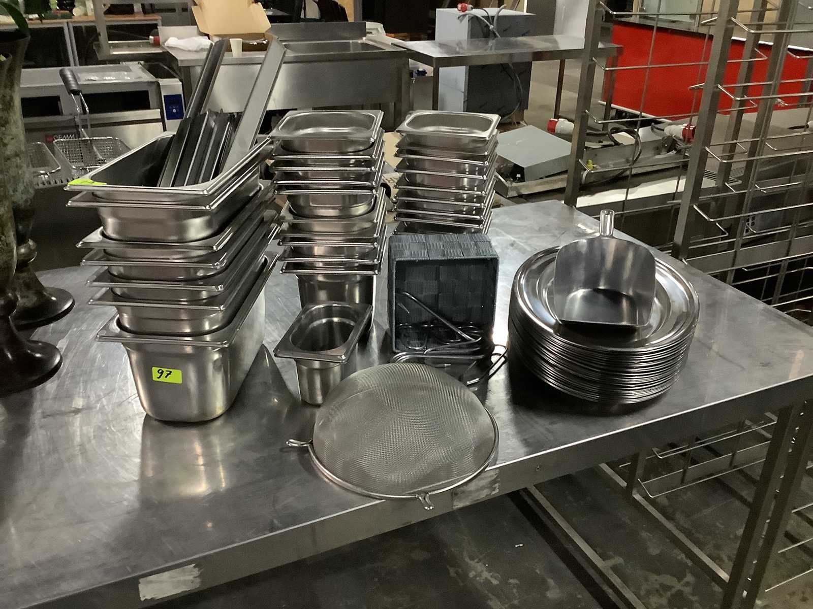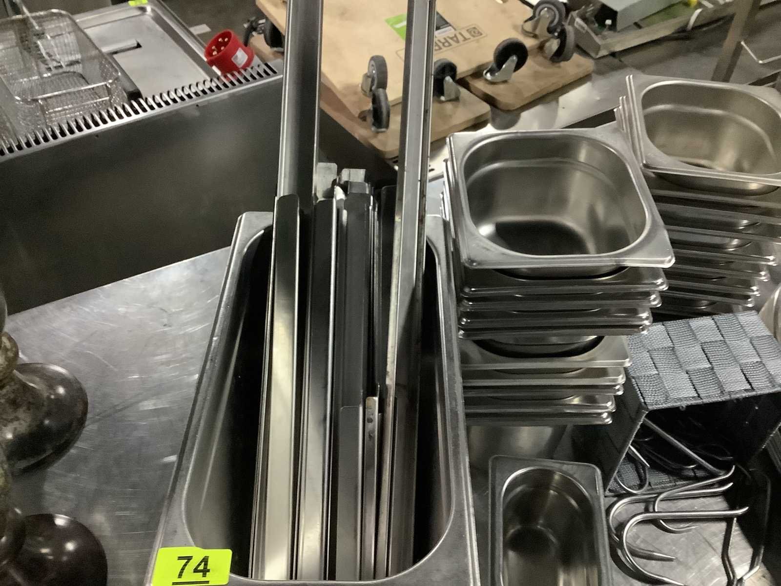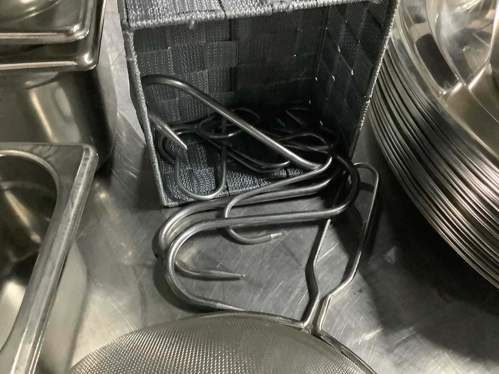 20x 1/6 GN verschillende hoogtes 1x 1/9 GN 7x 1/3 GN verschillende hoogtes 24x serveerplateau (46x29cm) Tussenliggers 9x vleeshaak 1x bolzeef 1x schep Materiaal: RVS