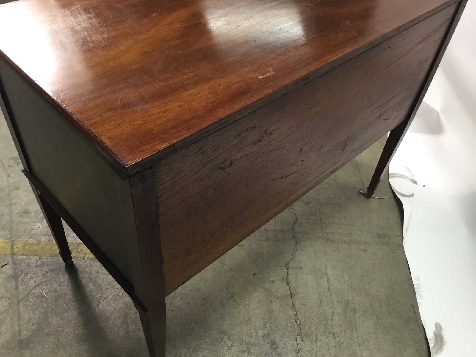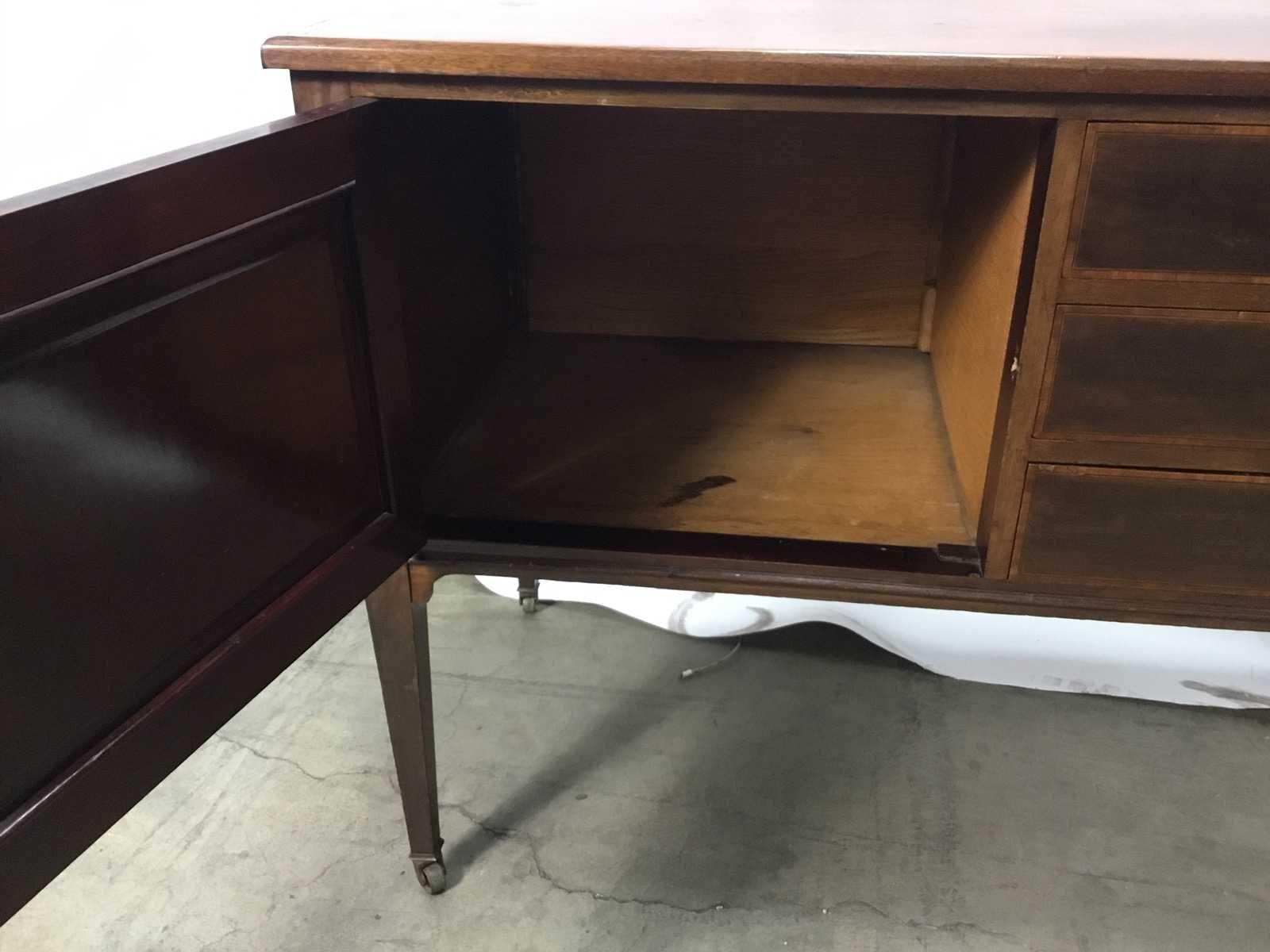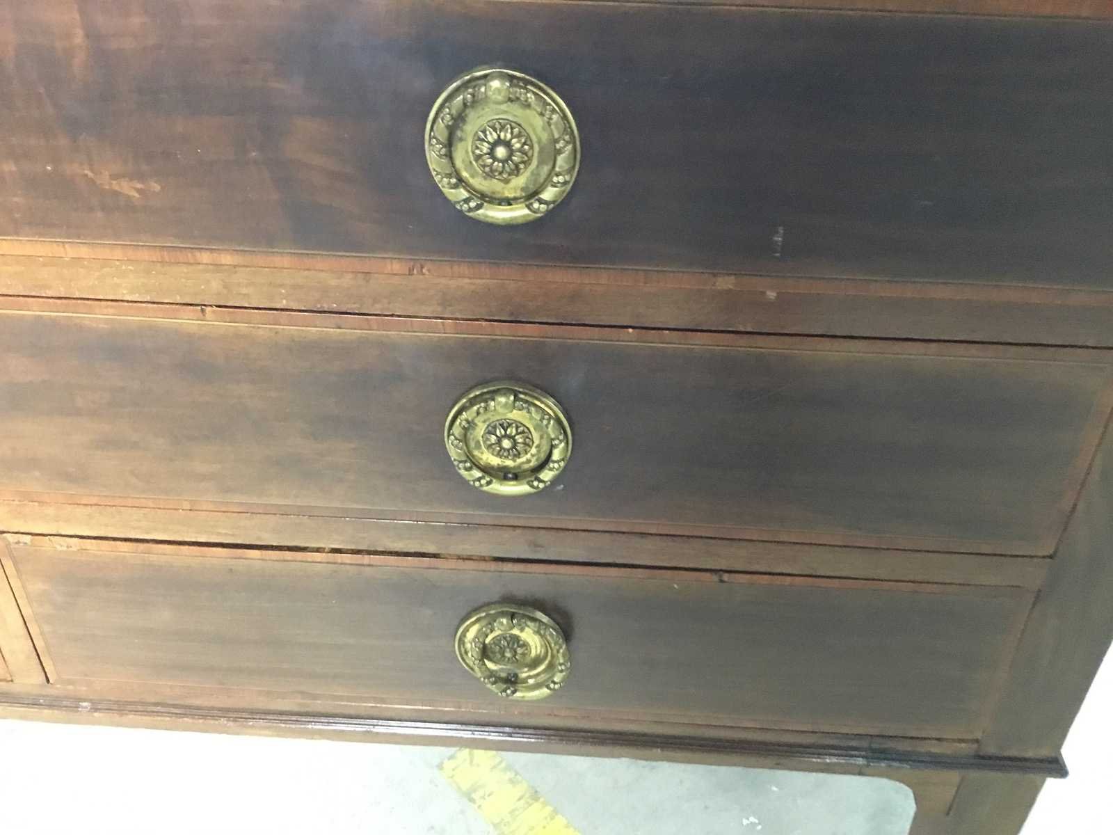 Dit is een antieke Engelse commode (washstand) gemaakt van mahoniehout, met karakteristieke inlegwerkdetails. Mahoniehout, bekend om zijn duurzaamheid en rijke kleur. Het meubelstuk is voorzien van een deur en drie laden met origineel beslag. Het ontwerp vertoont invloeden van klassieke Engelse meubelstijlen met verfijnd inlegwerk. Merk: Antieke theetafel Lengte: 104cm Breedte: 53cm Hoogte: 79cm Diepte: 44cm