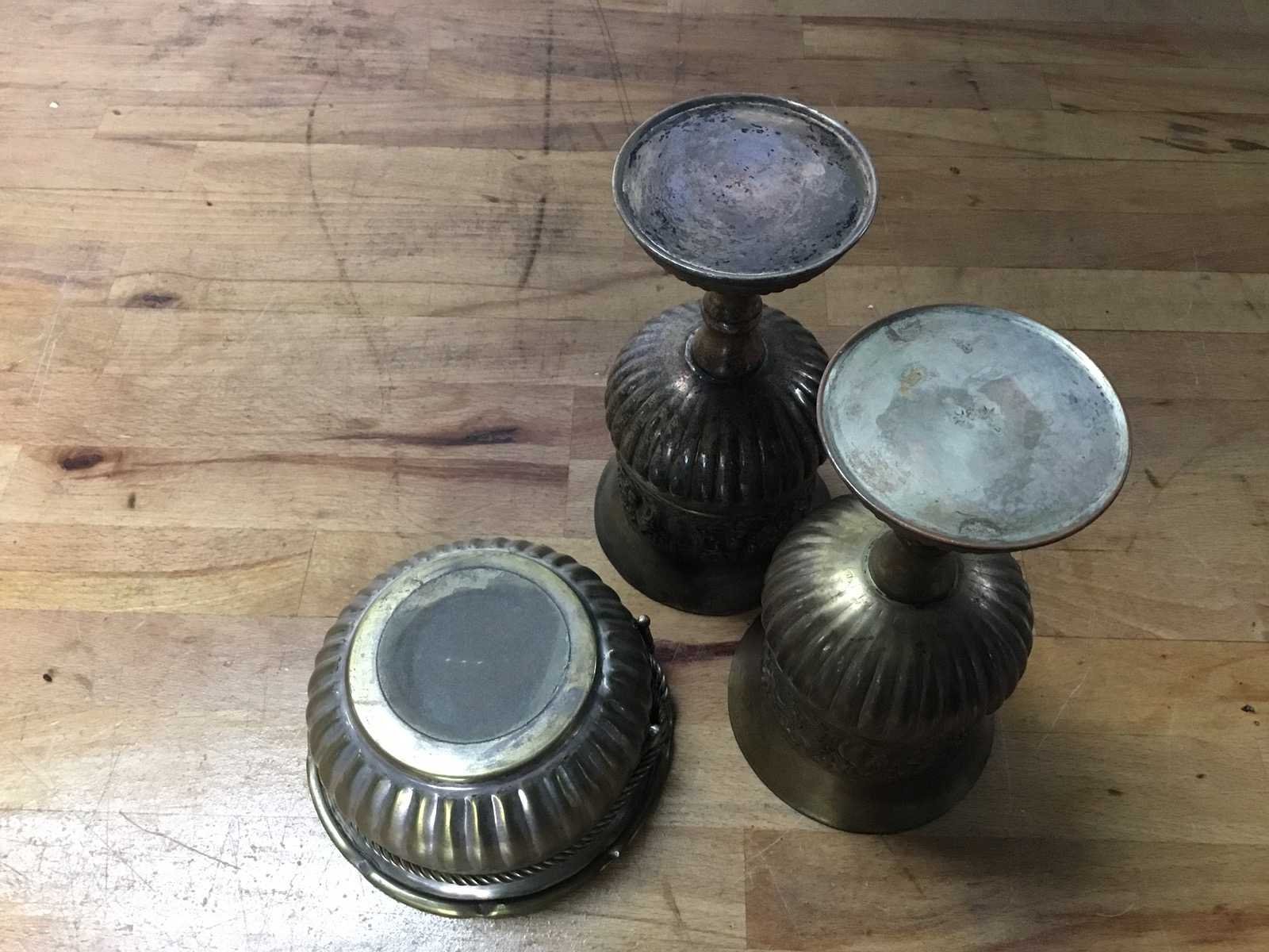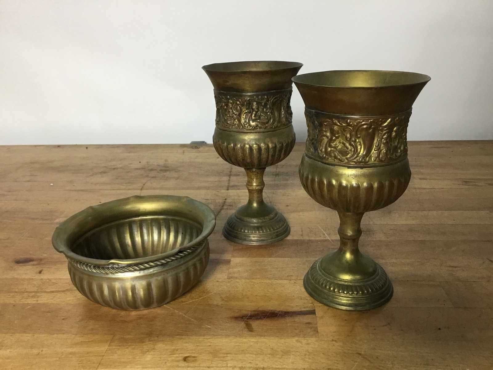 De bestaat uit antieke messing kelken en sierpot in Victoriaanse stijl, voorzien van gedetailleerde versieringen. Materiaal: Messing/koper met een natuurlijke patina. Ontwerp: Rijkelijk versierd met patronen die lijken op gezichten ("North Wind" of "Four Winds"). Product type: 2 Kelken en Sierpot