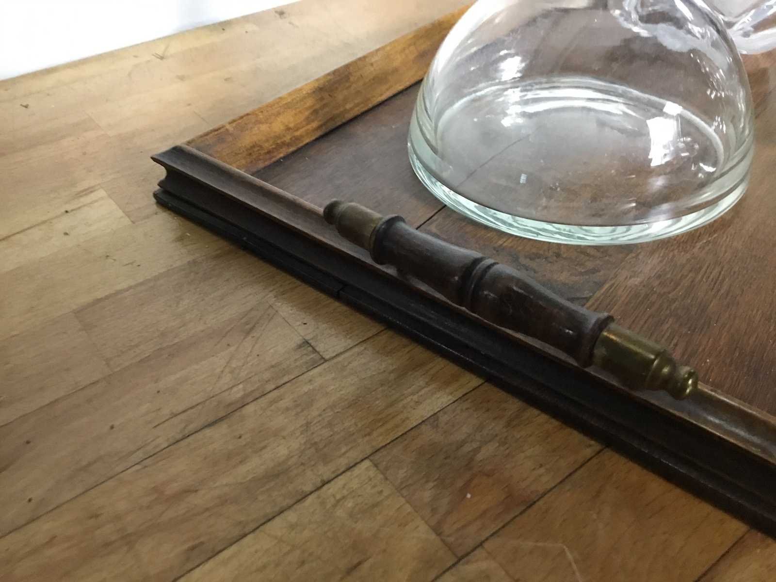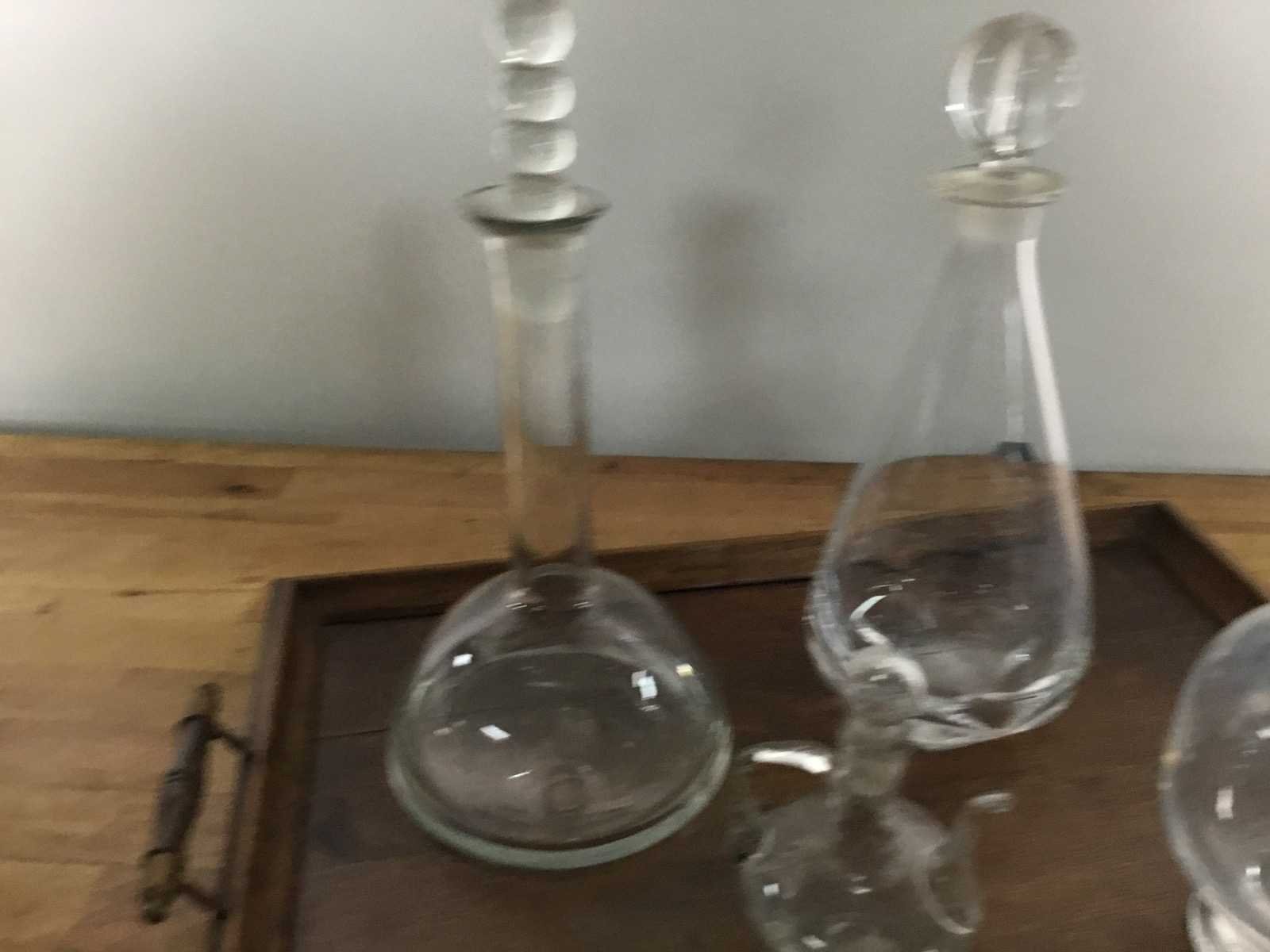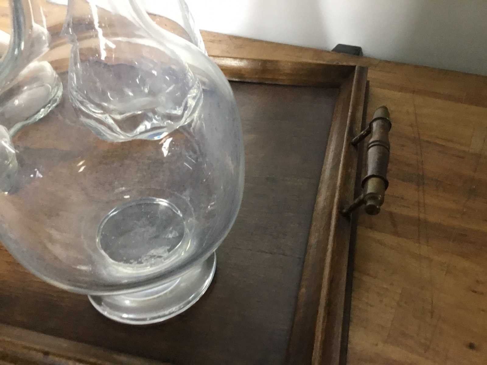 Deze set is een verzameling antieke of vintage glazen karaffen op een houten dienblad. De karaffen worden gebruikt voor het serveren of bewaren van wijn, whisky of andere dranken. Het betreft heldere glazen flessen met bijbehorende stoppen, geschikt als decoratief stuk op een dressoir. Product type: 4 glazen kannen met dienblad
