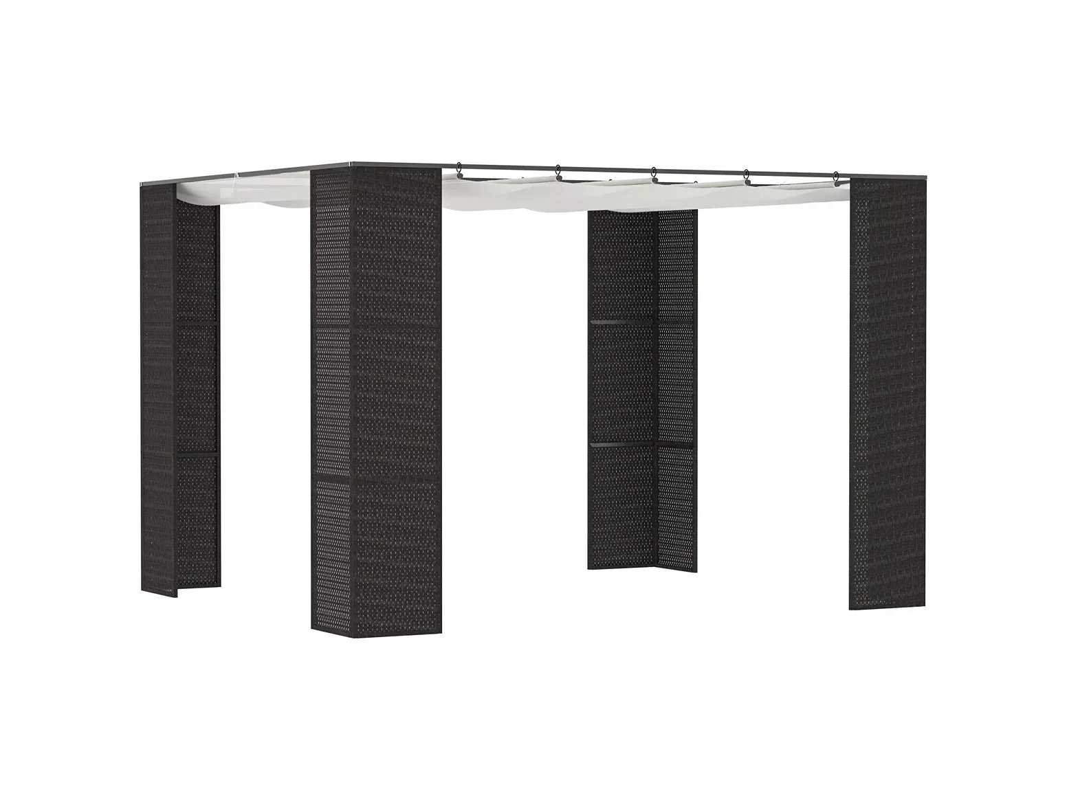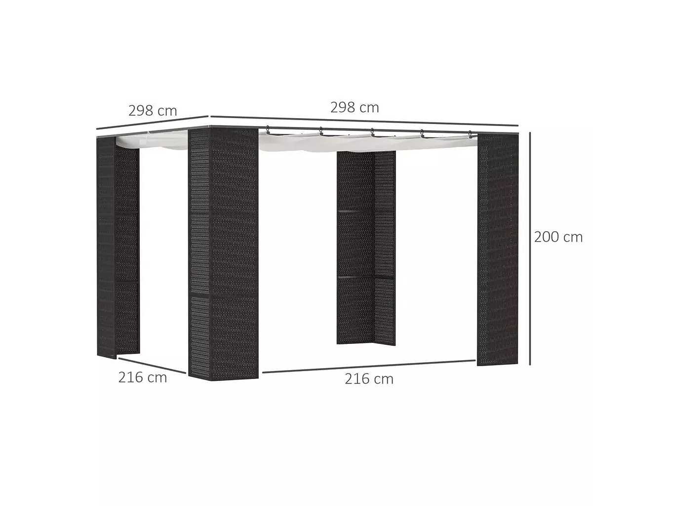 Nieuw in doos - Zeer elegante pergola in koloniale stijl om uw terras en buitenruimte te verfraaien - Intrekbare pergola ideaal voor het bouwen van een schaduwrijke plek buiten om tuinmeubelen, een tuinset, een barbecue, enz. te installeren. - Schuifdakdoek in 180 g/m² anti-UV polyester met hoge dichtheid (PA-coating) - Dak kan eenvoudig handmatig worden ingetrokken door het doek op de rails te schuiven - Structuur in robuust corrosiewerend epoxymetaal en geweven hars in rotanlook: lange levensduur - 8 haringen meegeleverd - Eenvoudige installatie met behulp van de meegeleverde gebruiksaanwijzing Merk: outsunny Model: 84c-288bk Product type: Pergola Kleur: zwarte pilaren /crème doek Lengte: 298cm Breedte: 298cm Hoogte: 200cm Materiaal: polyester